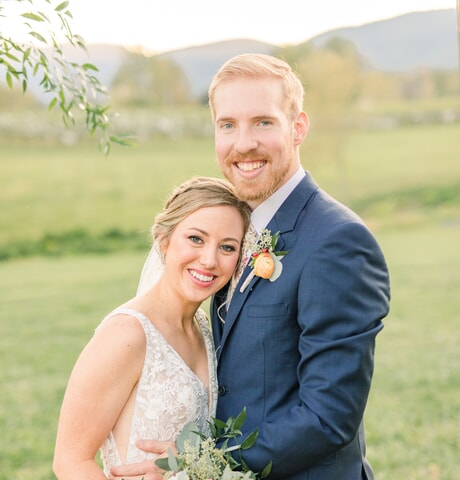 October set the stage for Sarah and Scott’s enchanting wedding at Veritas Vineyard & Winery in Afton, Virginia. Embracing the season’s beauty, the couple chose a warm, rustic-chic palette of rich reds, deep greens, and soft peach tones, perfectly complementing the vineyard’s rolling hills and breathtaking mountain views. Their ceremony took place outdoors on the vineyard’s picturesque event lawn, framed by towering oak trees and a stunning Blue Ridge backdrop. Guests were welcomed by lush greenery and floral arrangements in vibrant shades of red, orange, and pink by Foxtail Cottage Floral. White garden chairs lined the aisle leading to an elegant wooden arch adorned with a cascading floral display, creating a breathtaking setting for Sarah and Scott’s heartfelt vows.