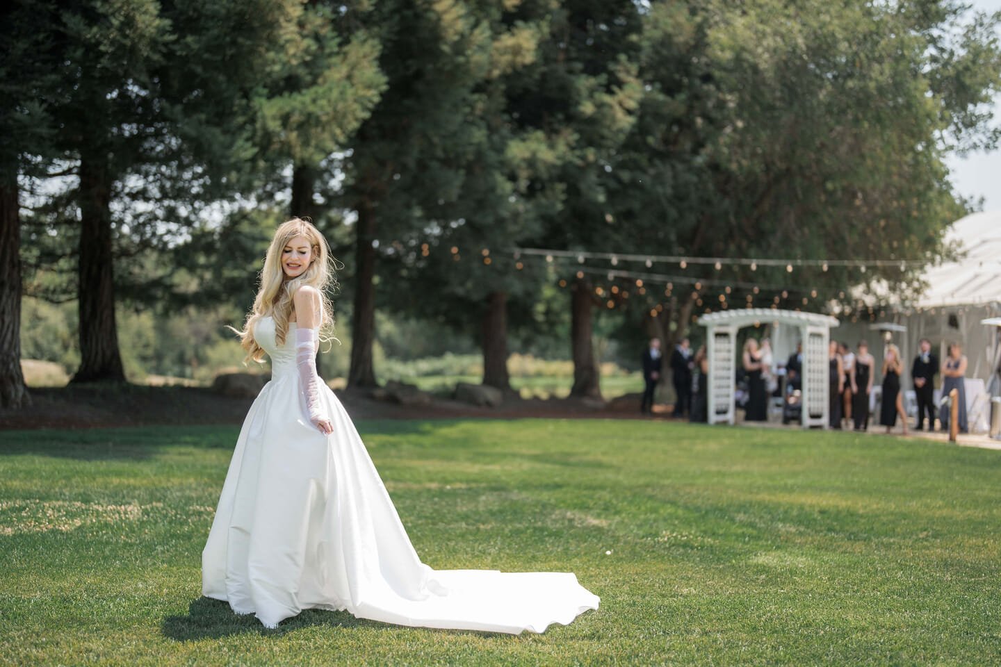 Their ceremony unfolded beneath towering cypress trees, where a white draped arch accented with delicate blooms framed their vows. Soft sunlight filtered through the branches, casting a gentle glow across the scene. Lush arrangements of hydrangeas, roses, and eucalyptus added texture throughout the celebration, enhancing the romantic atmosphere while honoring the venue’s natural beauty.
