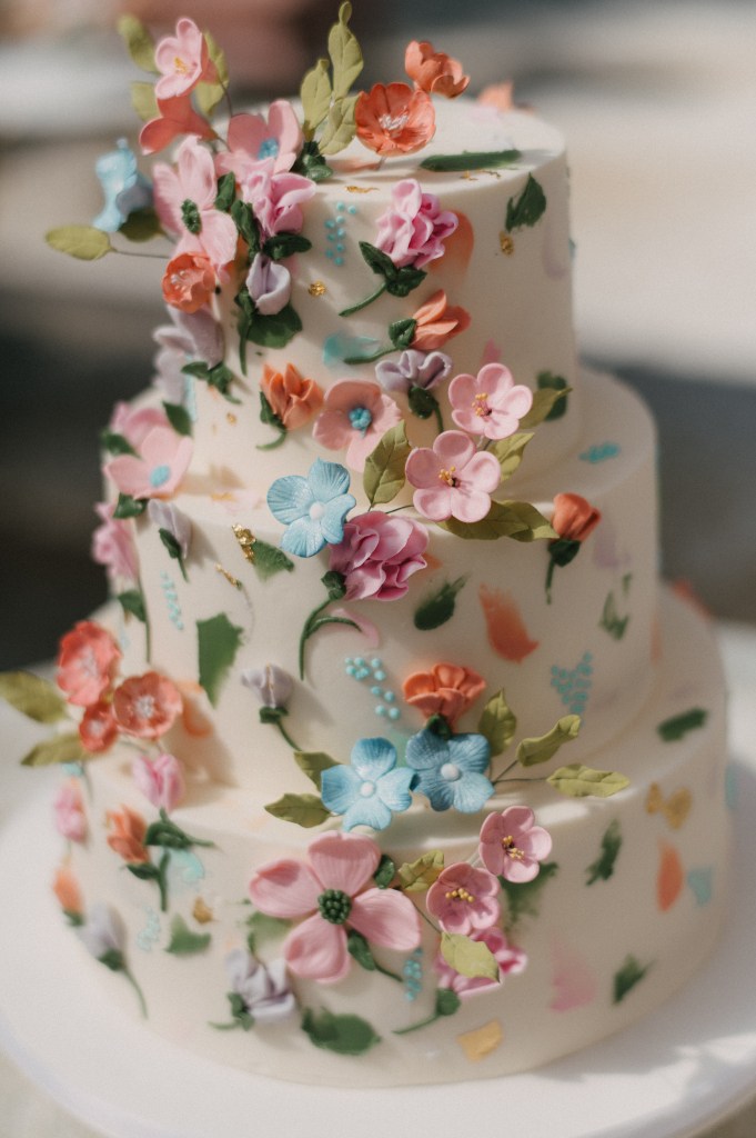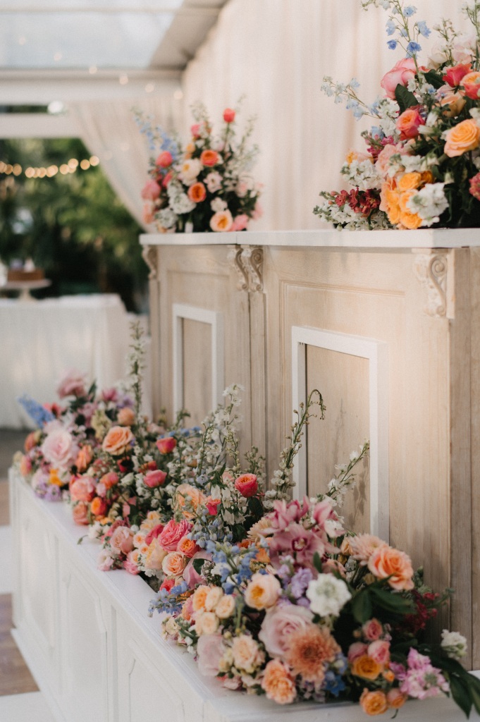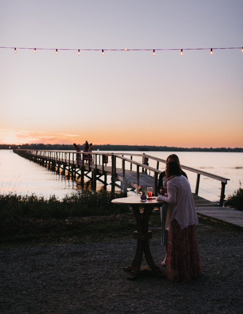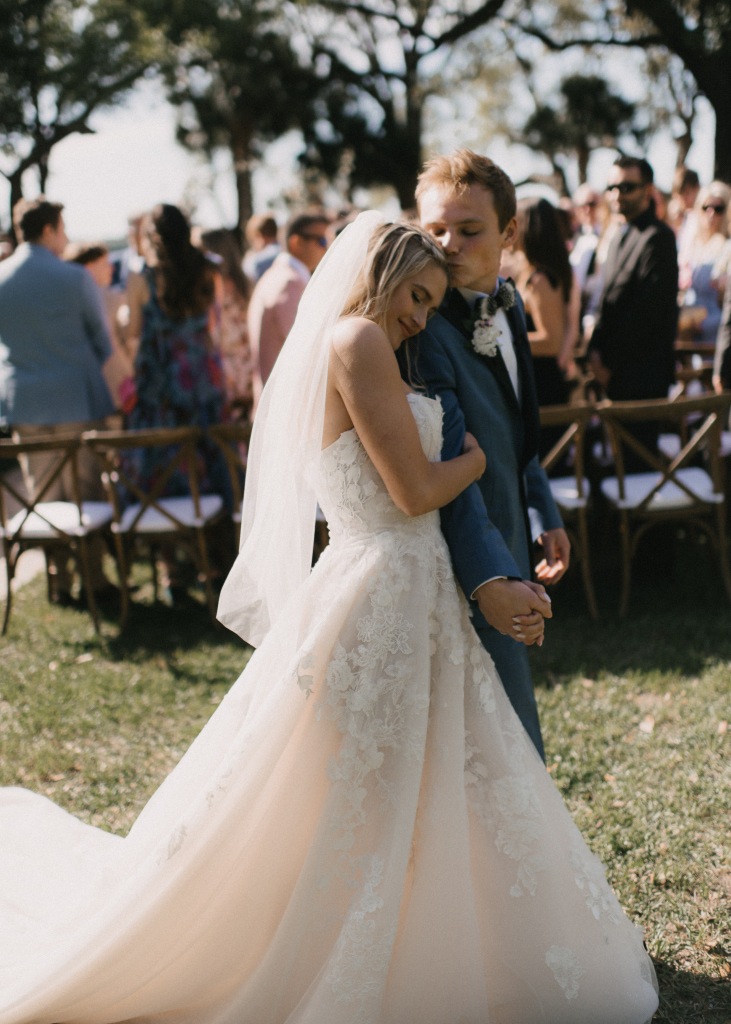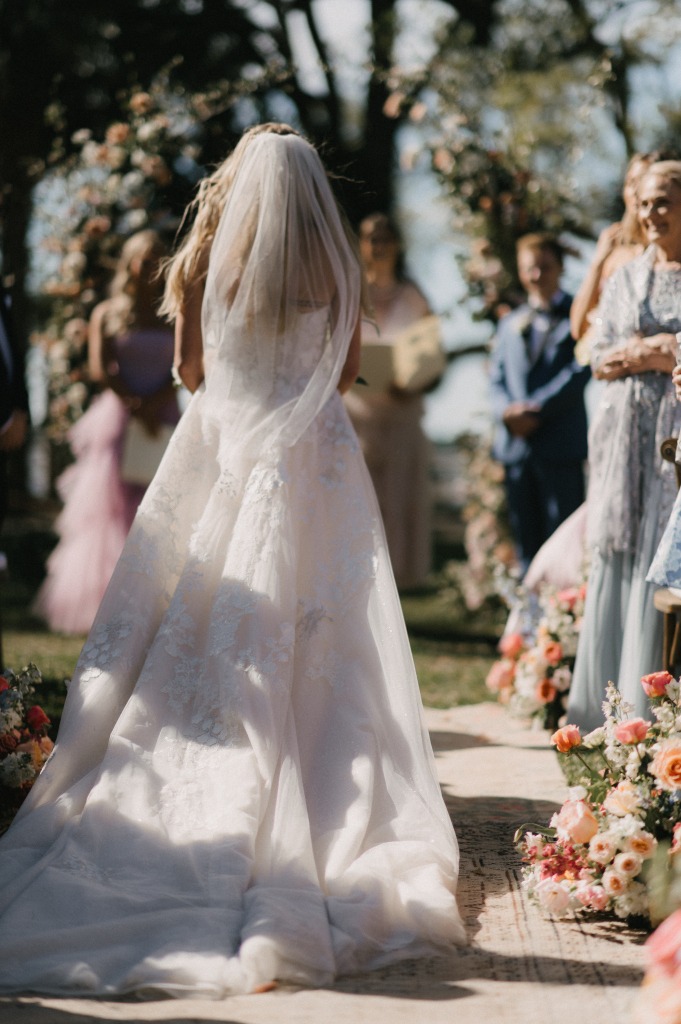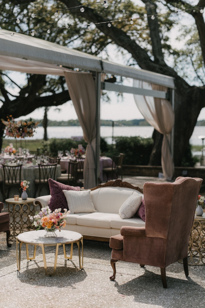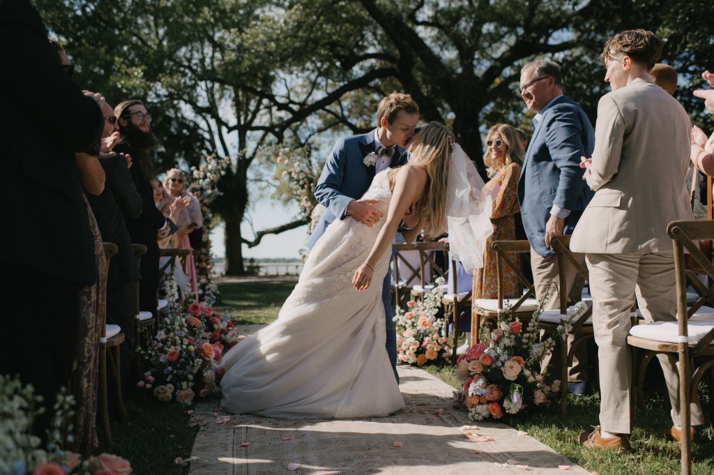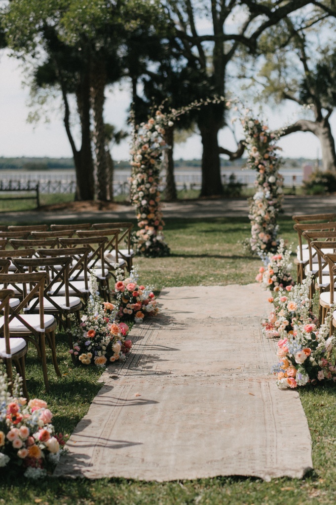 The ceremony took place on the lawn overlooking the water, where lush aisle arrangements in coral, peach, blush, and cream blooms by The Bearded Florist created a vibrant garden atmosphere. Beneath the open sky, the couple exchanged vows surrounded by layered florals and the soft movement of the marsh beyond.