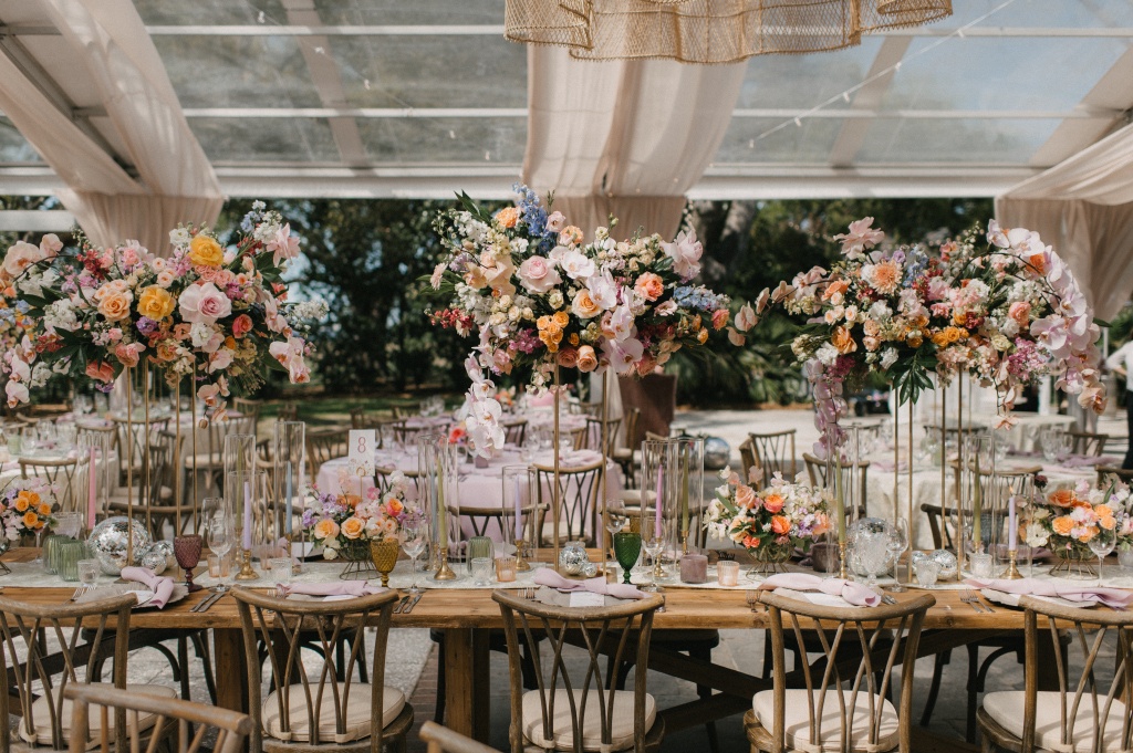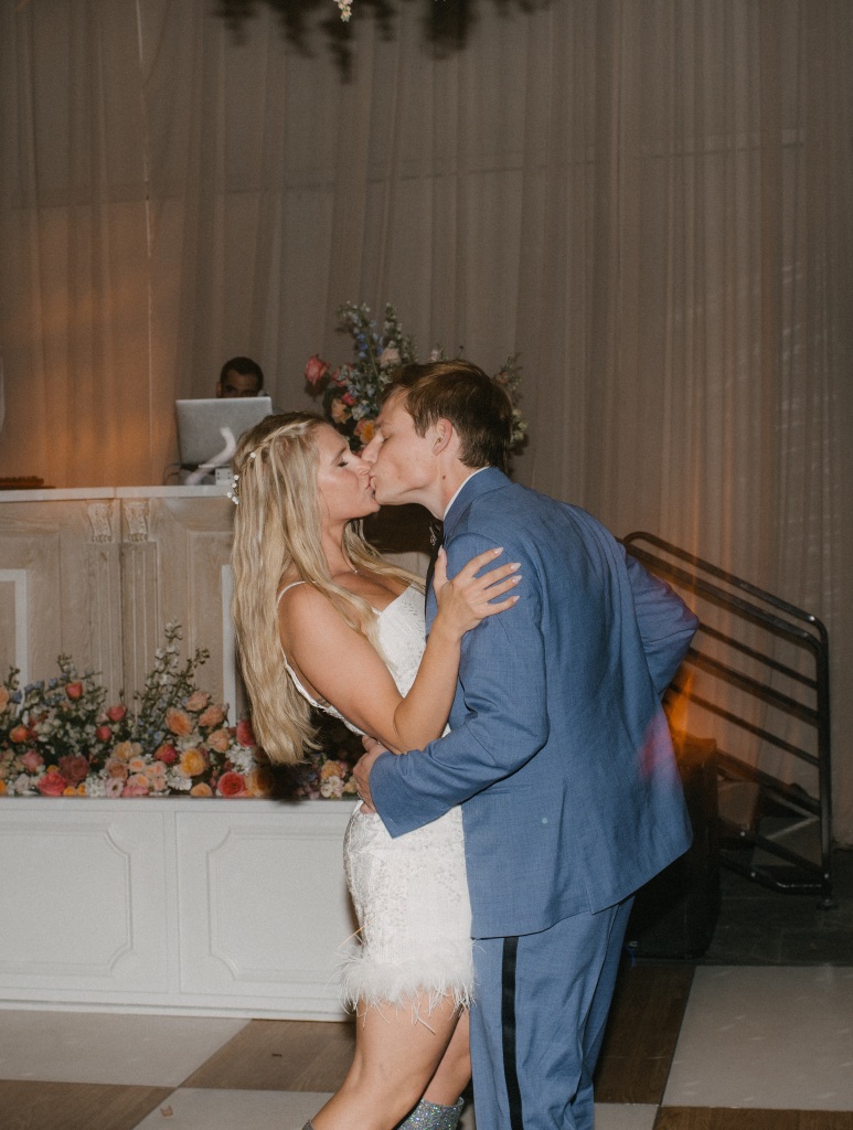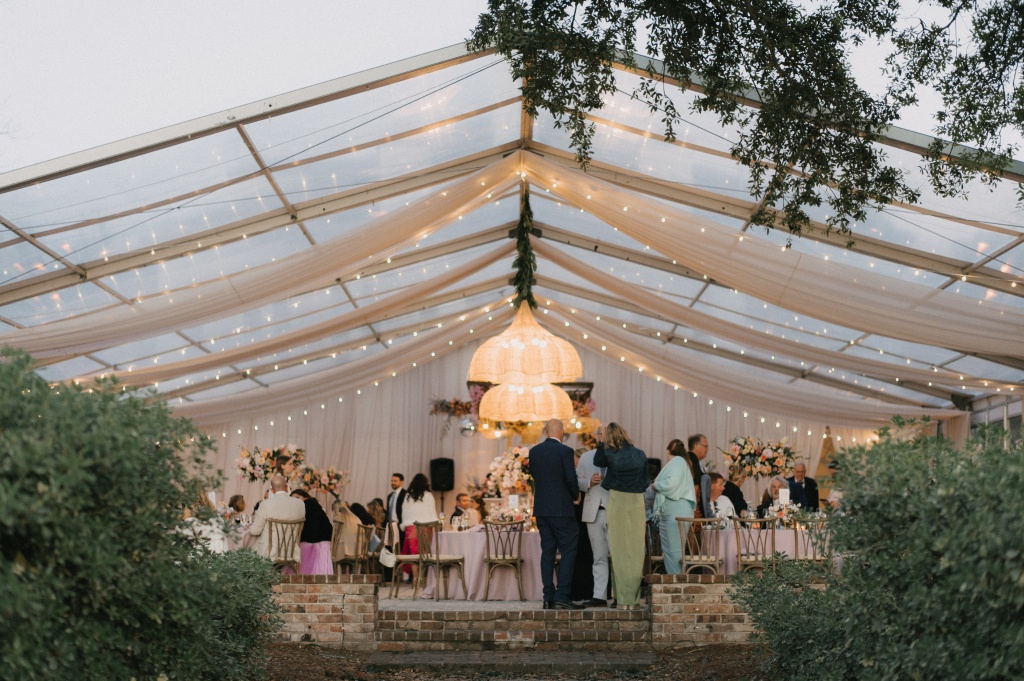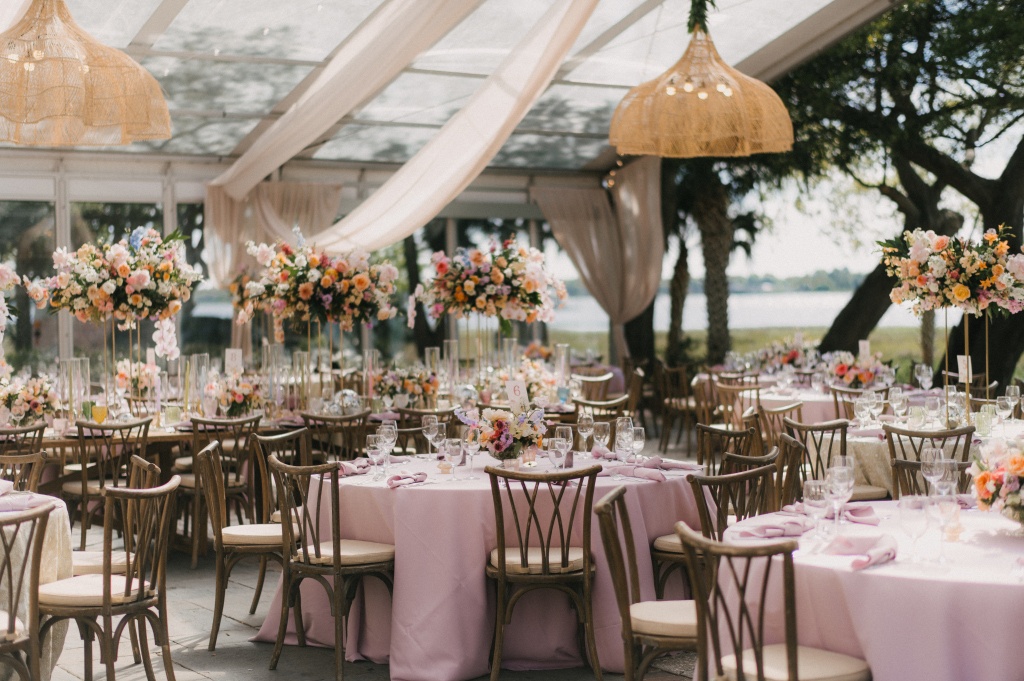 The reception carried that same lively spirit indoors, where live oaks stretched through the space and rattan pendant lights glowed alongside ivory draping and strands of café lights enhanced by lighting from LIT Charleston. Rustic farm tables and blush linen rounds from Snyder Events and Curated Events Charleston were styled with lavender napkins, jewel-toned glassware in sage, amber, and amethyst, and playful disco ball accents nestled among the florals. Towering centerpieces of orchids, garden roses, dahlias, delphinium, and ranunculus added vibrant texture throughout the space. Guests cheered as Hannah and Alex made their reception entrance through a swirl of bubbles, setting the tone for a night filled with laughter and celebration. Sean Money & Elizabeth Fay photographed the day with a refined editorial eye, while Elephant Memories preserved the celebration on film.