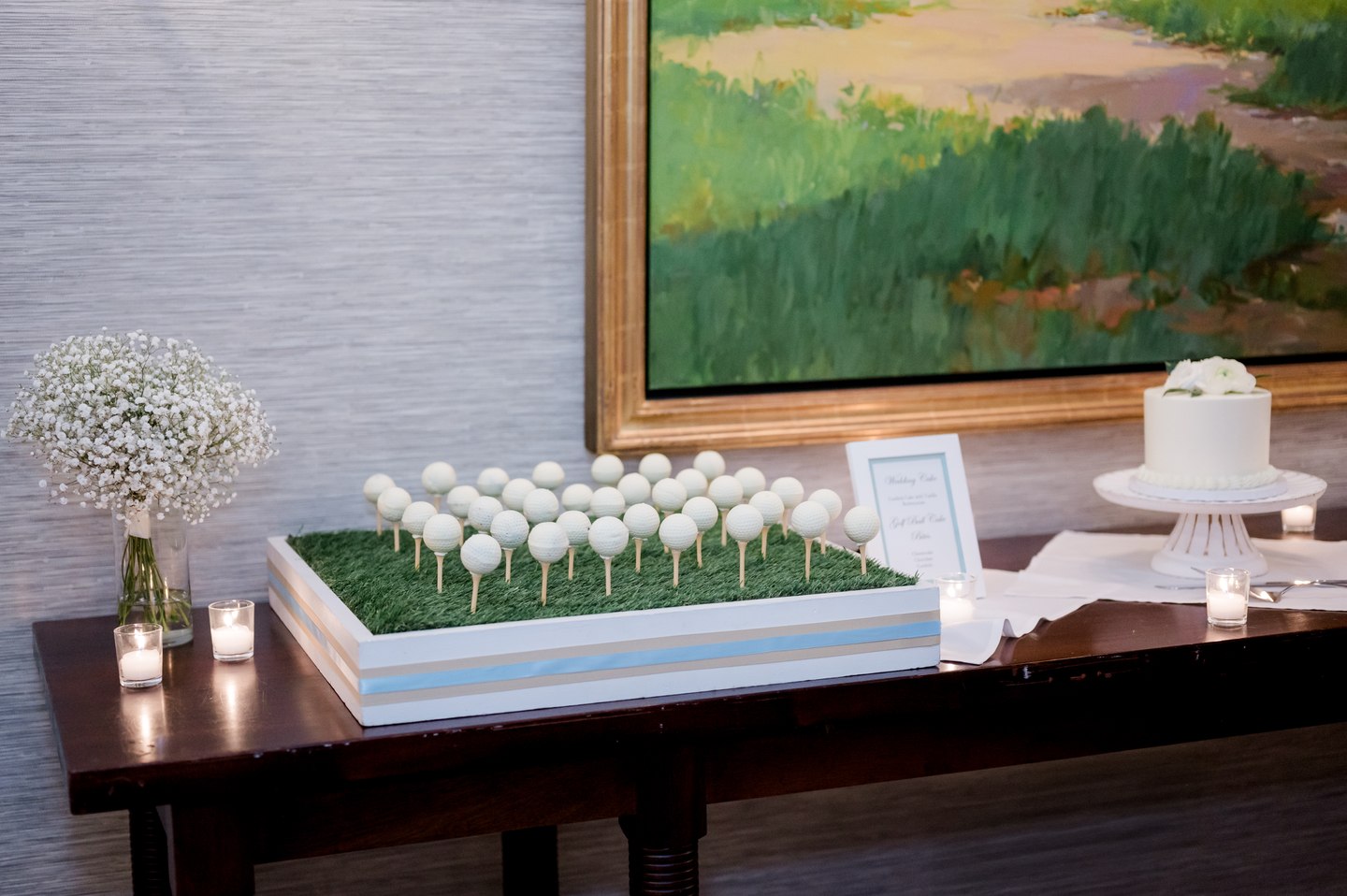 The reception carried an air of understated elegance, with a long table draped in white linen, gold chairs gleaming in the candlelight, and a magnificent chandelier casting a warm glow. Engaging Events designed delicate centerpieces of white florals and greenery that elevated the serene setting. Kiawah Island Golf Resort delighted guests with a menu that showcased coastal flavors, followed by a whimsical dessert display featuring cake pops arranged on a green “putting green.” A simple tiered cake adorned with white blooms stood as the evening’s sweetest symbol.