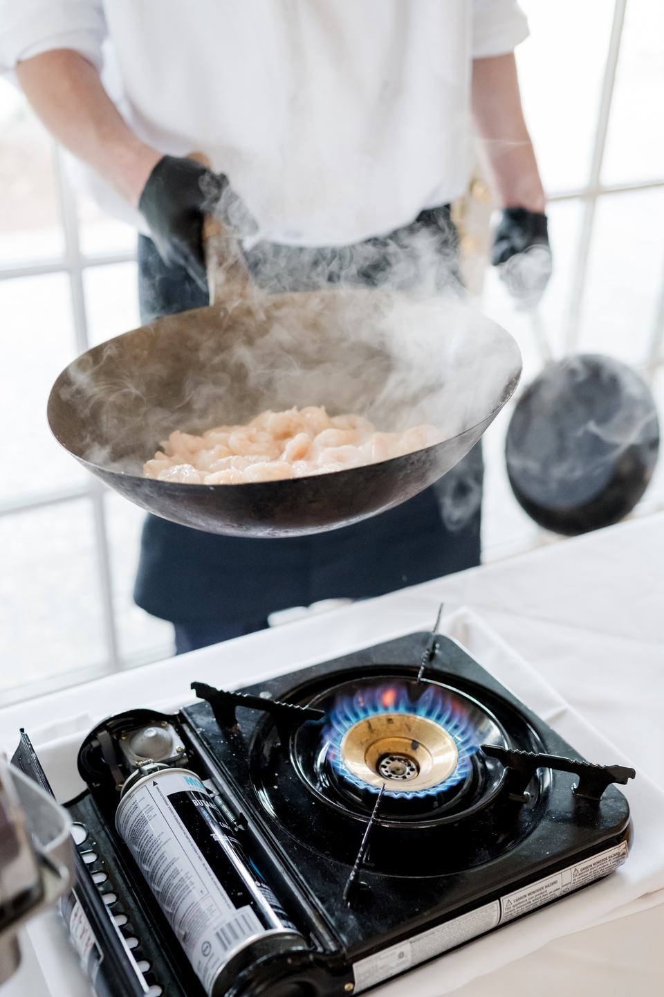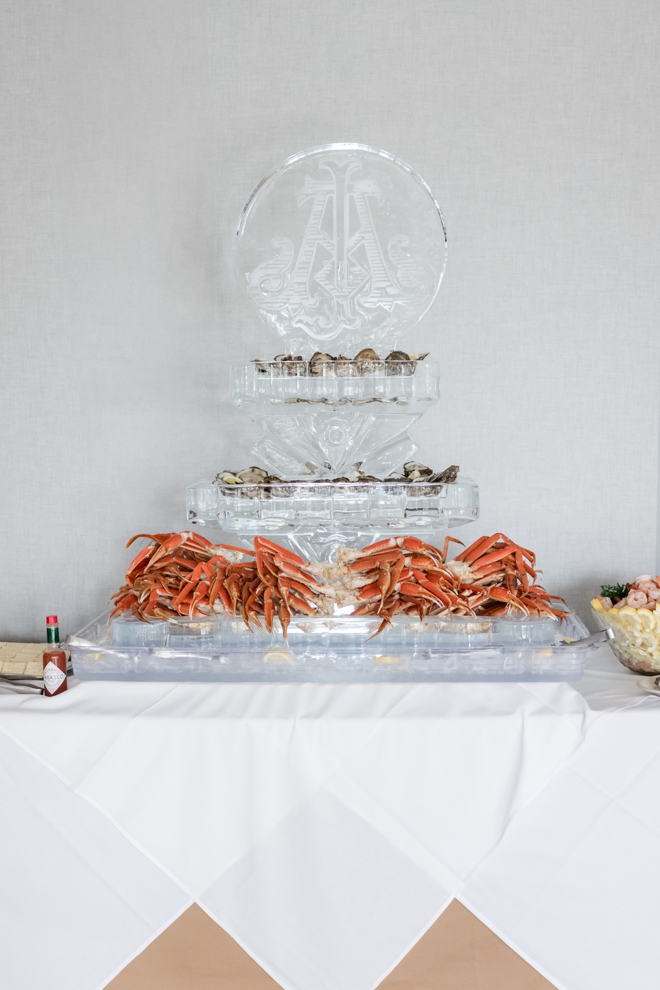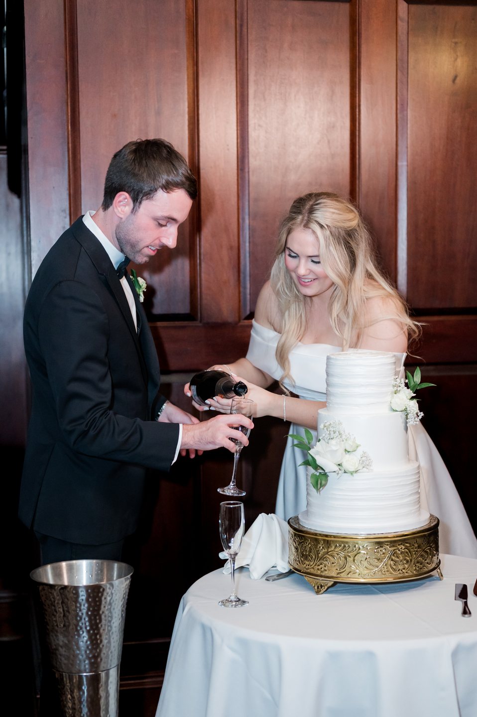 The reception glowed with natural light streaming through floor-to-ceiling windows. White hydrangeas adorned each table, blending elegance with a touch of Lowcountry charm. Guests enjoyed a seafood display crowned with a multi-tiered ice sculpture of crab and oysters, along with a menu that celebrated Charleston’s coastal cuisine. A refined cake by Tenacious Tart served as a sweet centerpiece for the evening.
