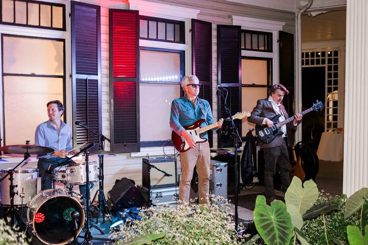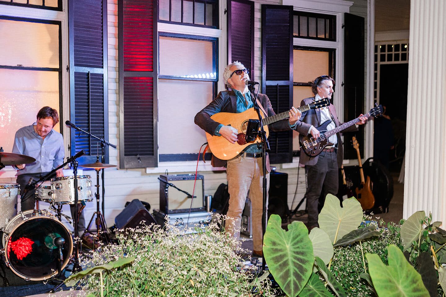 Restaurant Associates curated a dining experience that complemented the venue’s lush surroundings. Tables bloomed with colorful floral centerpieces in pink, yellow, and green, while a hand-painted cake from Pearl’s Bake Shoppe, adorned with intricate botanical details, echoed the garden’s artistry. The celebration came alive with the sounds of Jackass Flats, whose live performance filled the night with energy and joy.