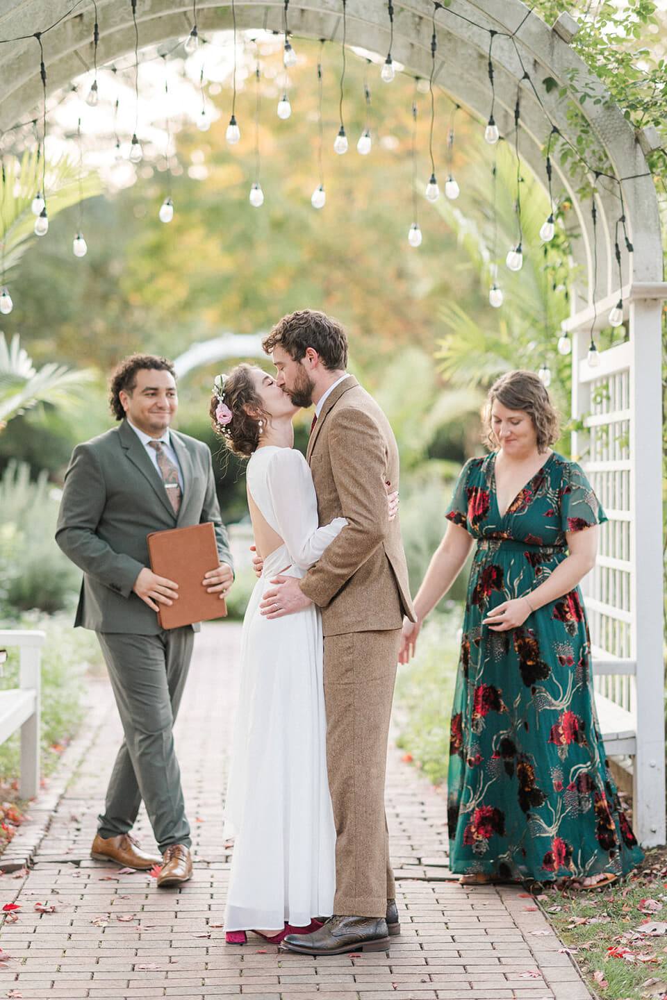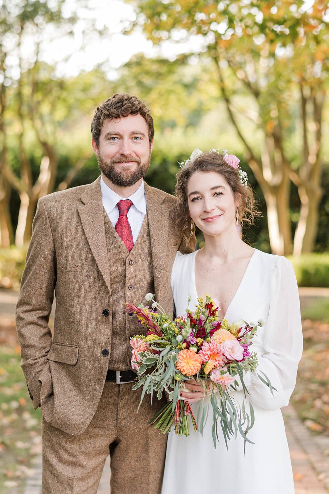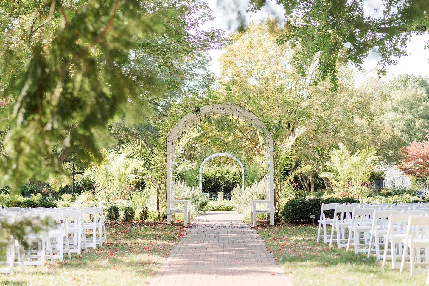 Caroline and Chris’s October wedding at Lewis Ginter Botanical Garden unfolded in a breathtaking display of autumn beauty, where golden sunlight filtered through lush foliage and palm fronds to create an atmosphere of quiet enchantment.