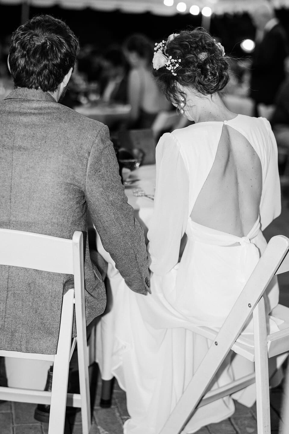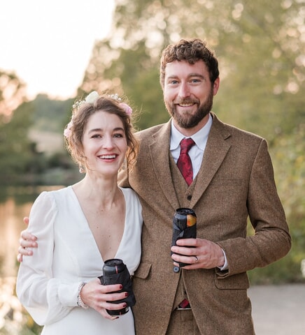 CCS Events designed a day that balanced rustic charm with refined sophistication. Caroline wore a long-sleeved gown with a deep V-neckline and delicate floral hairpiece, while Chris looked sharp in a warm brown tweed suit with a bold red tie—an elegant nod to the season’s palette. Beneath a canopy of twinkling lights, the couple exchanged vows surrounded by the garden’s natural splendor.