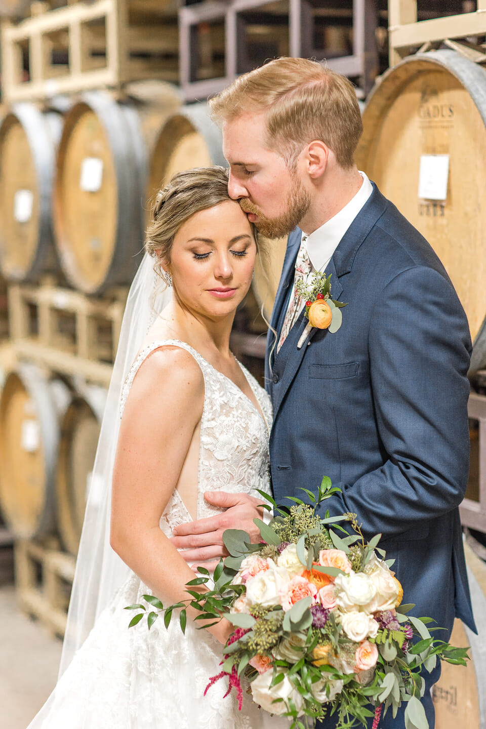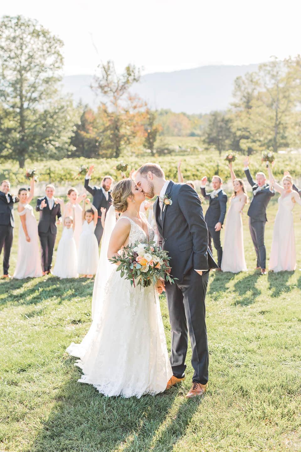 The celebration continued inside the winery’s light-filled event hall, where wooden farmhouse tables were dressed in crisp white linens and adorned with vintage vases brimming with roses, dahlias, and eucalyptus. Gold-rimmed glassware and warm globe string lights added a romantic glow, while dramatic curtain-draped windows framed the scenic vineyard views. A true showstopper, the couple’s three-tier wedding cake from Salt & Light Pastry Co. featured delicate rose and peach florals cascading down the sides, crowned with a striking geode topper. Guests savored Veritas’ exceptional wines and gourmet hors d’oeuvres while Sound Enforcement DJ Service kept the dance floor lively all night long.