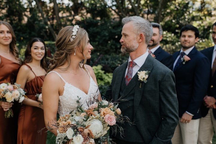 The reception sparkled with carefully crafted details. Aquarian Catering delighted guests with a menu that celebrated Southern flavors, while Bunn DJ Company kept the dance floor alive with perfectly timed selections. As evening descended, the newlyweds cut into their three-tiered buttercream cake, its fresh floral accents echoing the day's romantic garden-inspired theme.