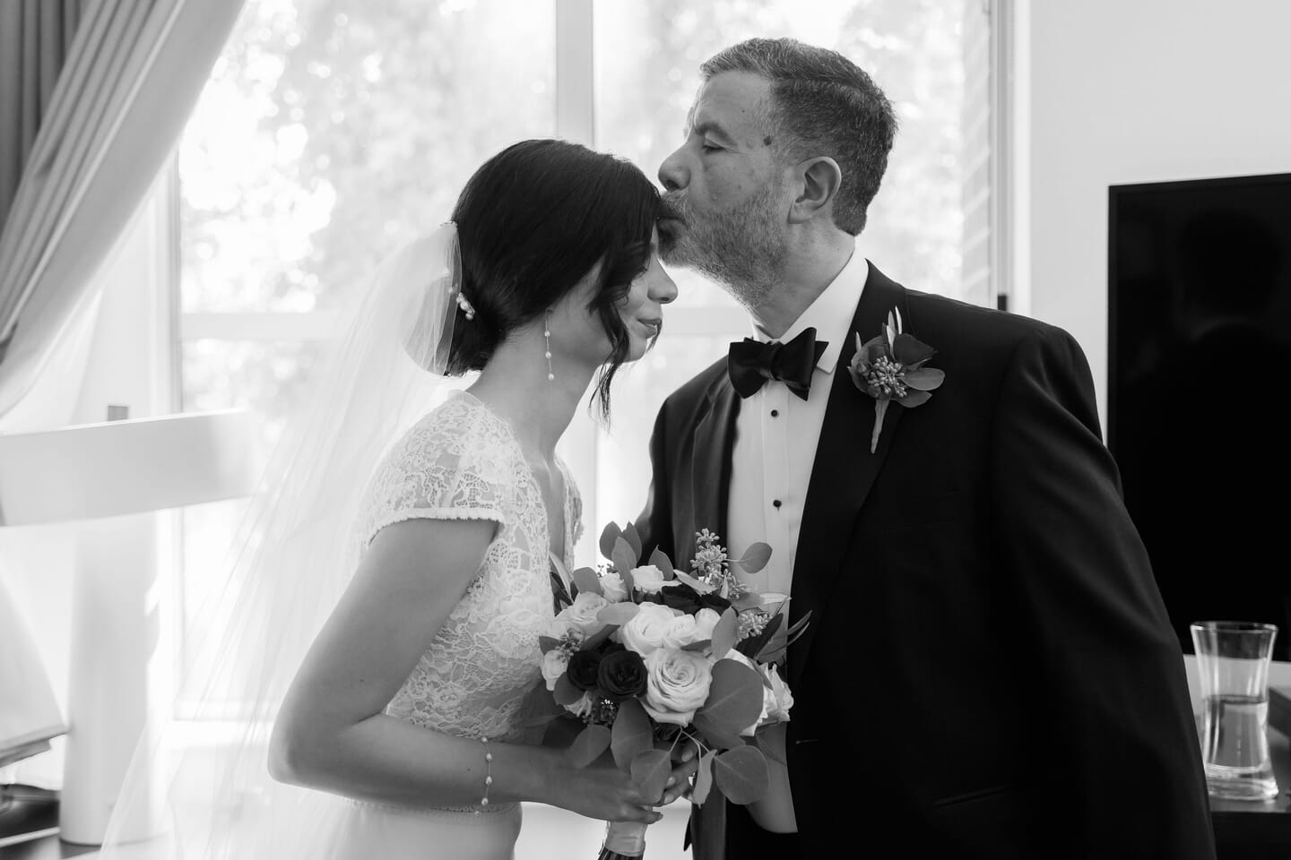 Inside Westwood’s grand ballroom, crystal chandeliers cast a soft glow over tables draped in crisp white linens and delicate floral centerpieces. Sweeping windows framed views of the manicured grounds, blending indoor refinement with the beauty beyond. Edibles Incredible Desserts crafted an exquisite confection, while guests dined and celebrated under the expert coordination of Westwood’s in-house team. Giorgina and Kevin’s wedding was a portrait of autumn romance and filled with enduring love.