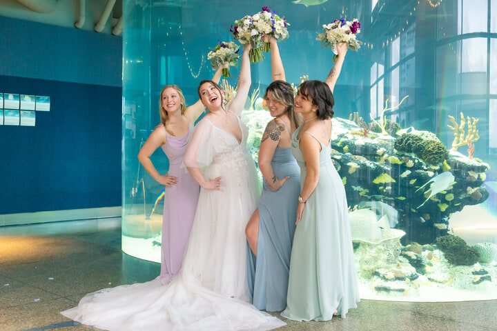 The reception offered a feast for the senses, with Duvall Catering & Events presenting imaginative coastal-inspired fare and a three-tiered cake adorned with florals that mirrored the day’s palette. Under twinkling string lights, the dance floor came alive, inviting guests to celebrate as the aquarium’s ethereal ambiance enveloped the modern architecture and sleek glass walls. Every element, from décor to entertainment, flowed with intention and grace, leaving Marianna and Josh’s celebration as unforgettable as it was enchanting—a day where love, elegance, and joy moved together as effortlessly as the ocean currents themselves.