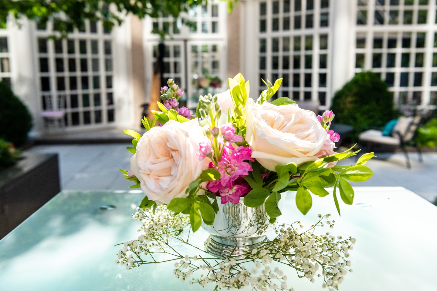 Guests stepped into a beautifully designed reception featuring silver Chiavari chairs, crisp white linens, and lush centerpieces by Petal’s Edge Floral Design. Hydrangeas, roses, and airy greenery added soft texture, complemented by pink napkins and gold accents. Fairmont Washington elevated the experience with gourmet appetizers, refined entrées, curated wine pairings, and a five-tier cake that completed the evening’s elegant ambiance. Photos From the Harty preserved it all with clarity and emotion, capturing every tender moment and intentional detail.