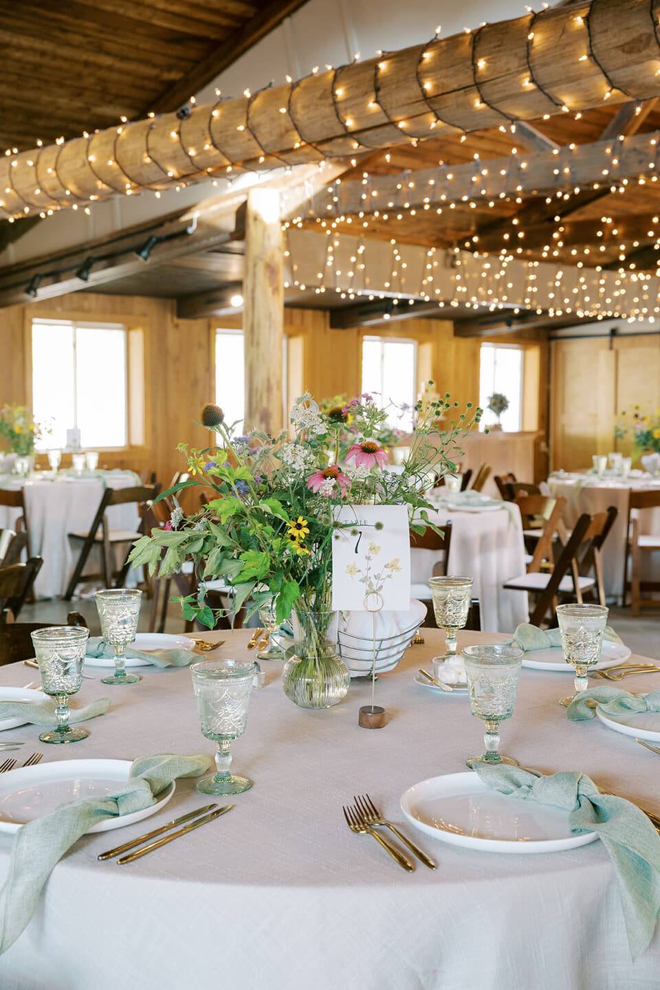 The celebration continued beneath a canopy of twinkling string lights, where tables draped in soft linen runners were adorned with garden-fresh arrangements by Spring Creek Blooms—a lush medley of blooms and greenery nestled in ornate vases. Gold flatware, delicate glassware, and elegant place cards completed the romantic tablescape, while Exchange Events & Catering served a delightful meal that matched the setting’s quiet elegance.