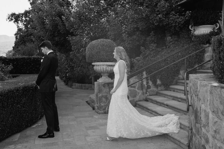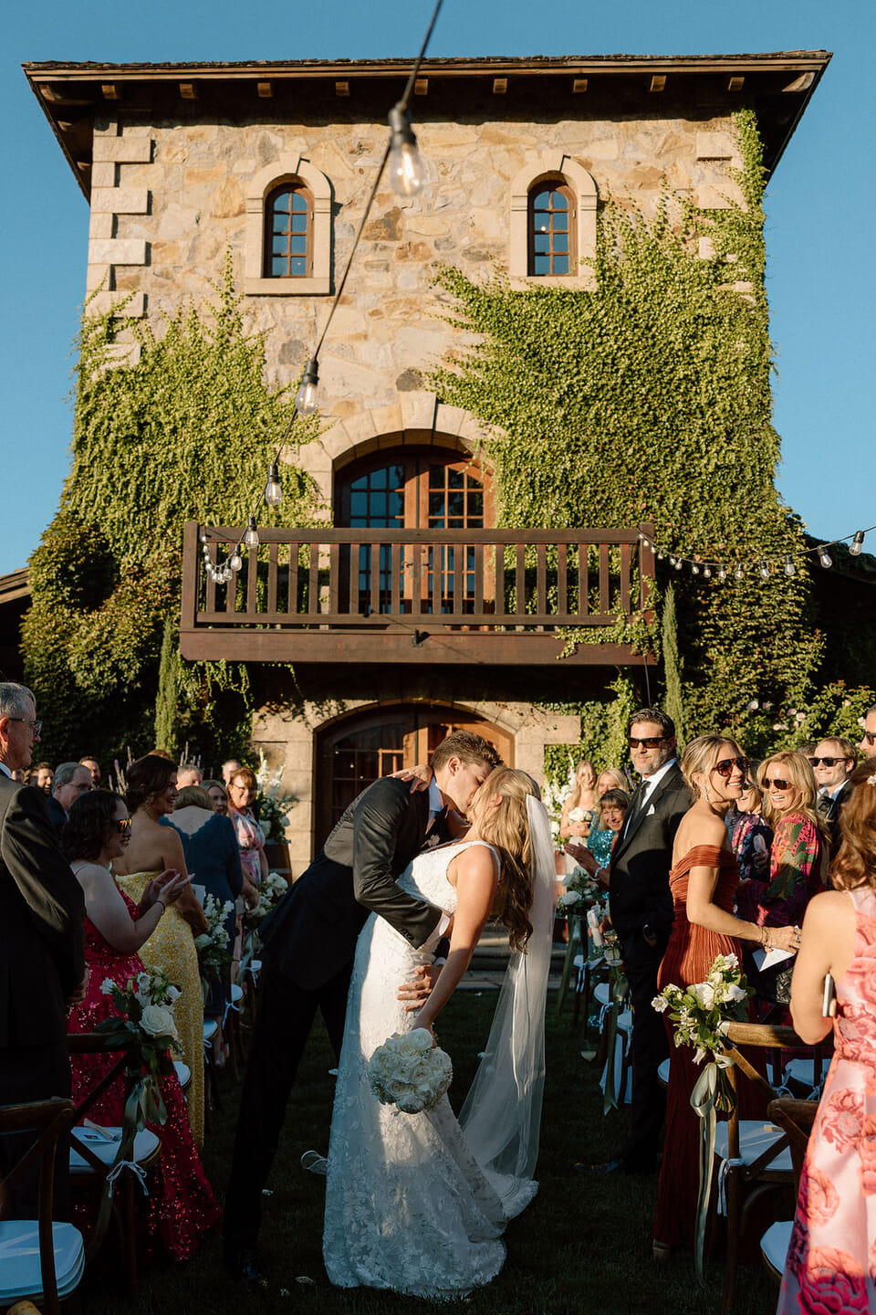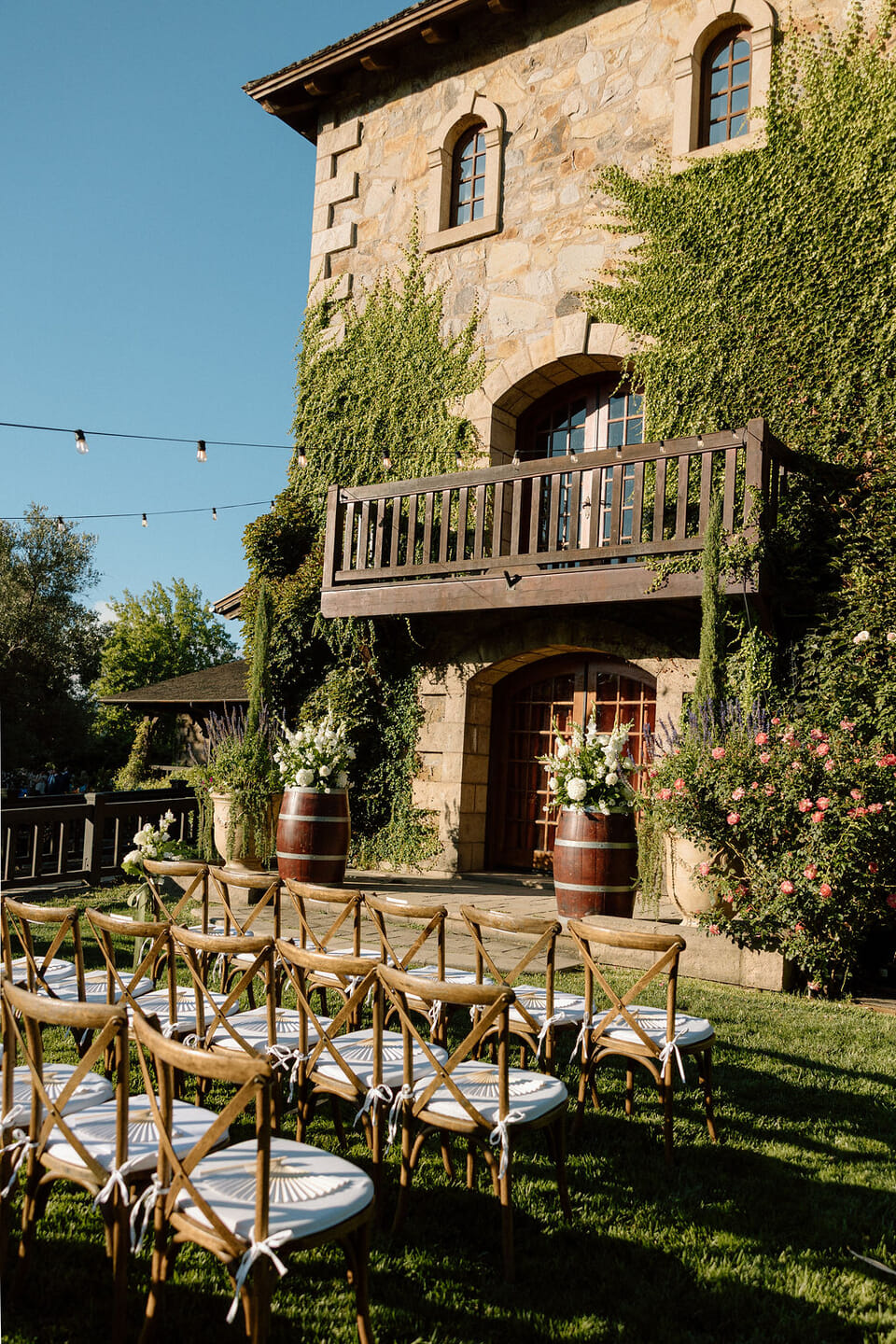 Their ceremony took place on the winery lawn beneath the iconic stone tower. Wooden cross-back chairs from Encore Events Rentals were accented with soft white blooms and sage-green ribbons, while wine barrels framed the aisle for a rustic yet refined entrance. Garaventa’s designed airy arrangements of white hydrangeas and blush roses that echoed the surrounding vineyards, as A Beautiful Ceremony Napa Valley led a heartfelt exchange of vows.