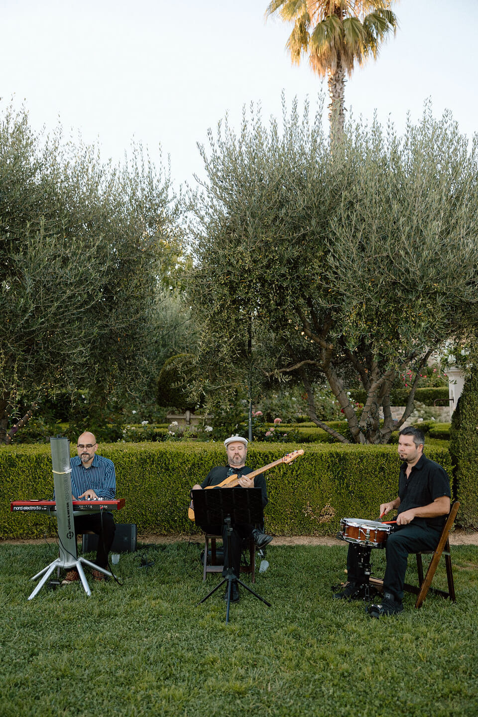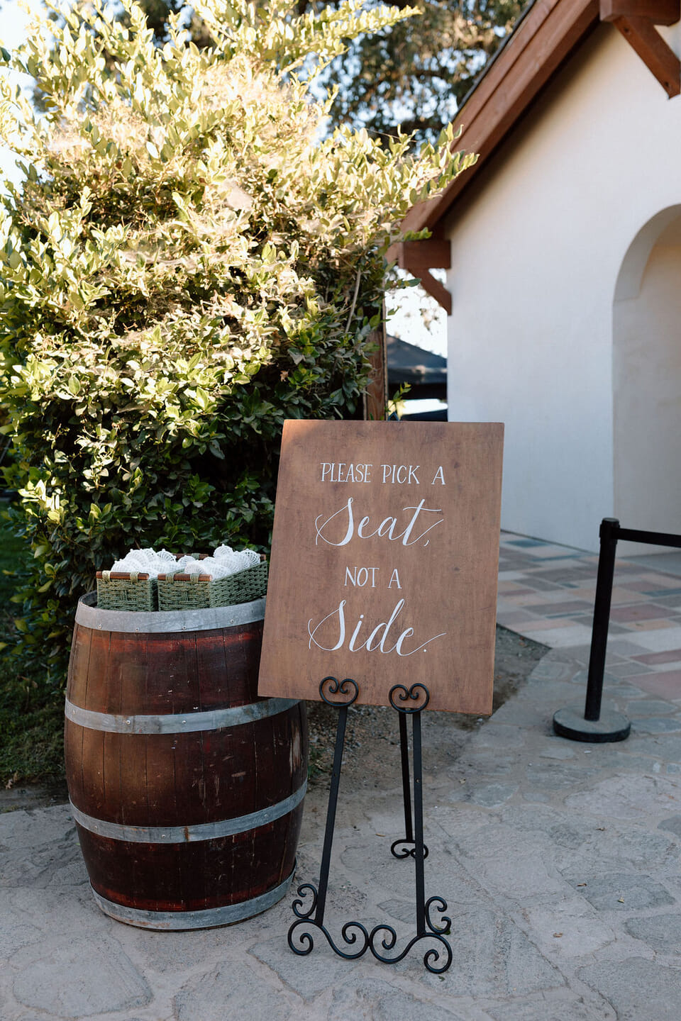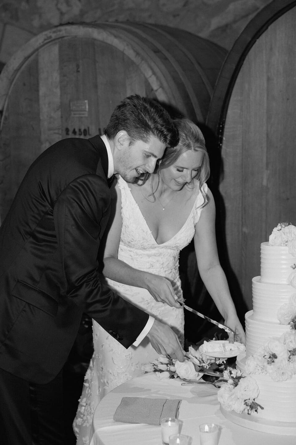 Their ceremony took place on the winery lawn beneath the iconic stone tower. Wooden cross-back chairs from Encore Events Rentals were accented with soft white blooms and sage-green ribbons, while wine barrels framed the aisle for a rustic yet refined entrance. Garaventa’s designed airy arrangements of white hydrangeas and blush roses that echoed the surrounding vineyards, as A Beautiful Ceremony Napa Valley led a heartfelt exchange of vows.