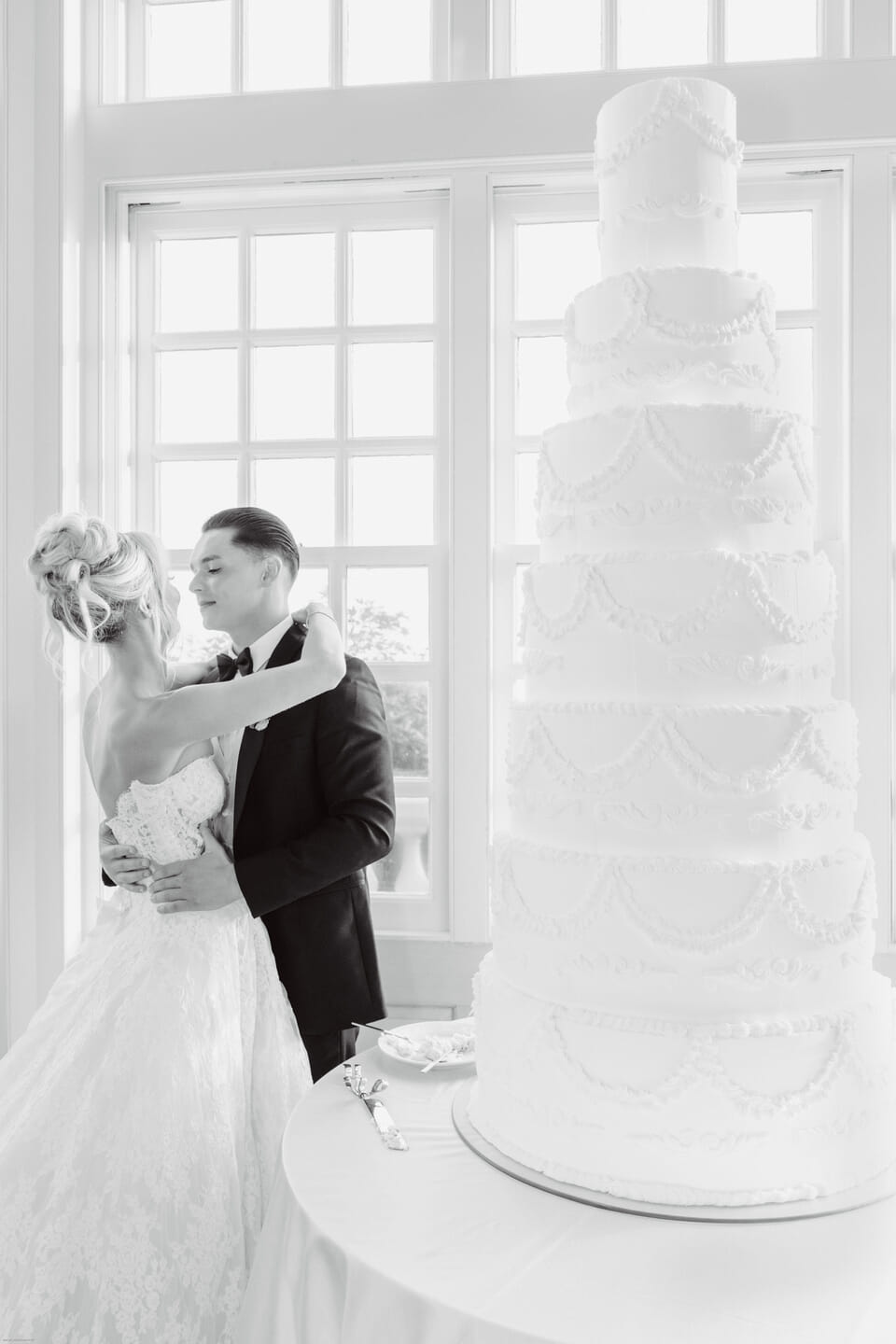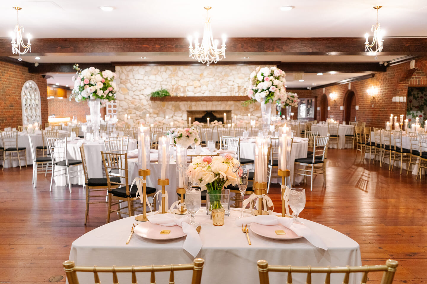 Inside, the reception glowed beneath crystal chandeliers. Rent E-Quip rentals set the stage with gold Chiavari chairs and crisp linens, complemented by lush floral centerpieces and flickering candlelight. Groovin’ Gourmets crafted a memorable dining experience, and Richmond Photobooth added a spirited touch to the evening. A towering seven-tier cake stood as a stunning focal point, echoing the sophistication of the day. AmKay Photography portrayed the celebration with an eye for emotion and beauty, preserving each tender moment in timeless imagery.