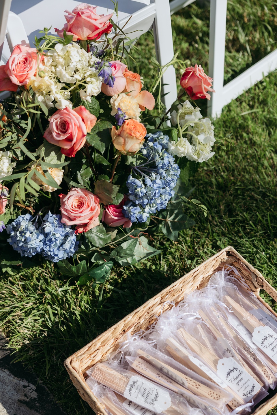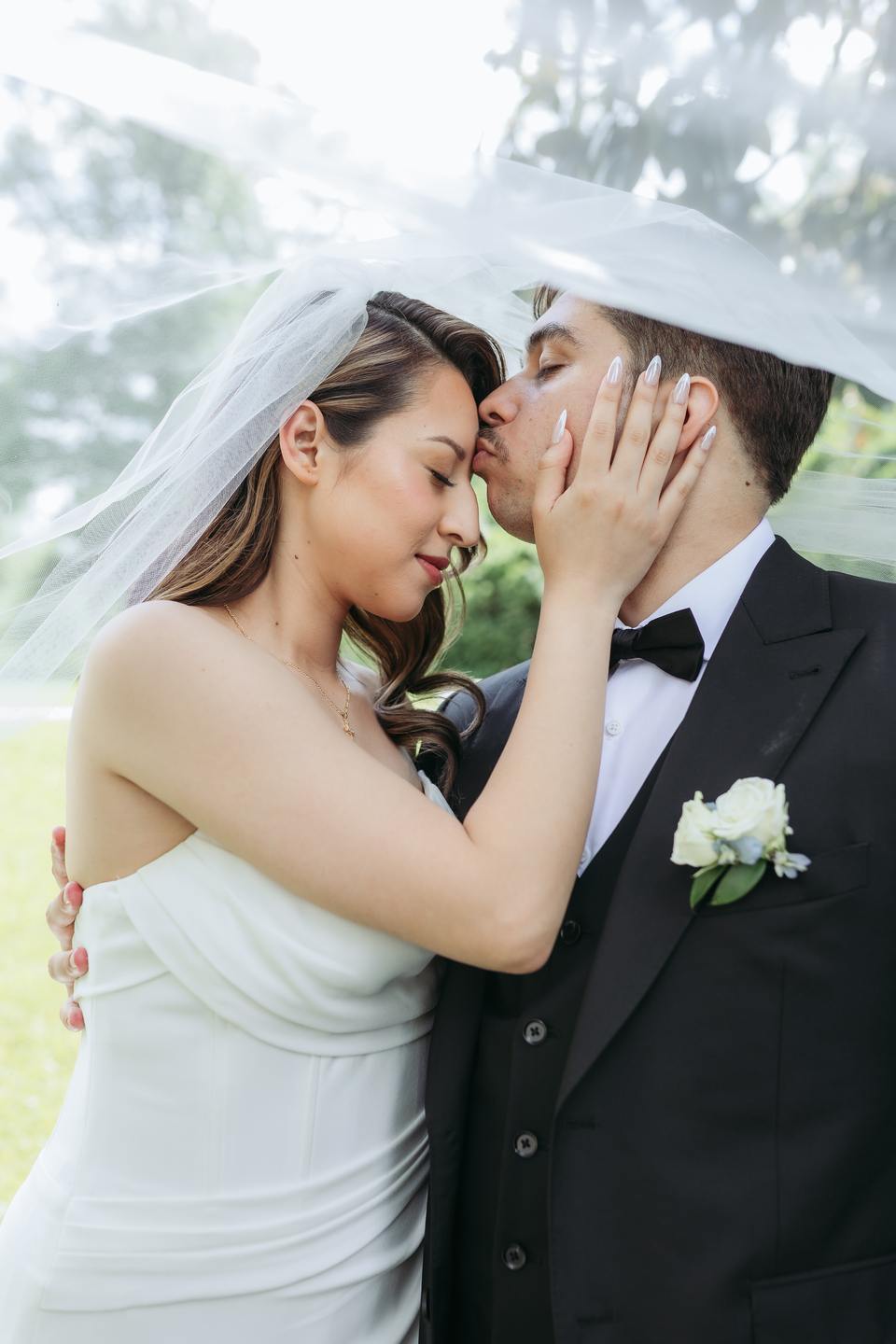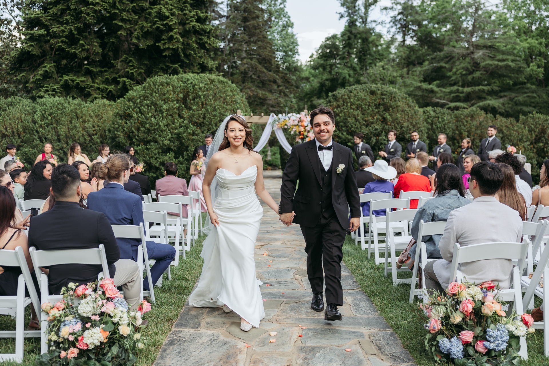 Their ceremony unfolded on the manicured lawn beneath a floral-draped arch bursting with white, yellow, pink, and orange blooms. Roses, peonies, wildflowers, and soft blue hydrangeas cascaded over airy white fabric, creating a romantic focal point against the natural landscape. Keila wore a strapless gown with effortless elegance, her soft waves complementing the relaxed garden setting, while David looked timeless in a classic black tuxedo finished with a crisp white boutonnière.