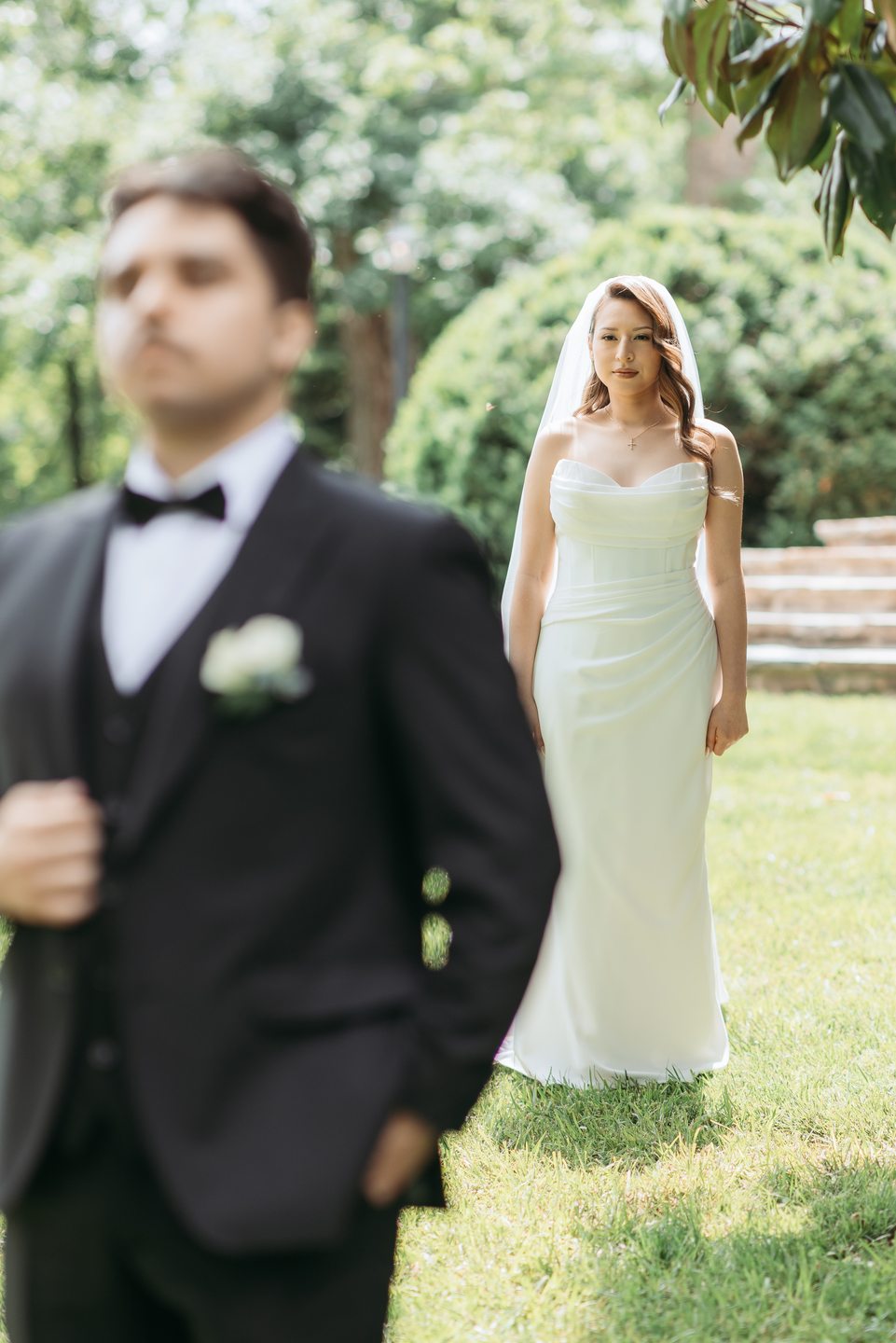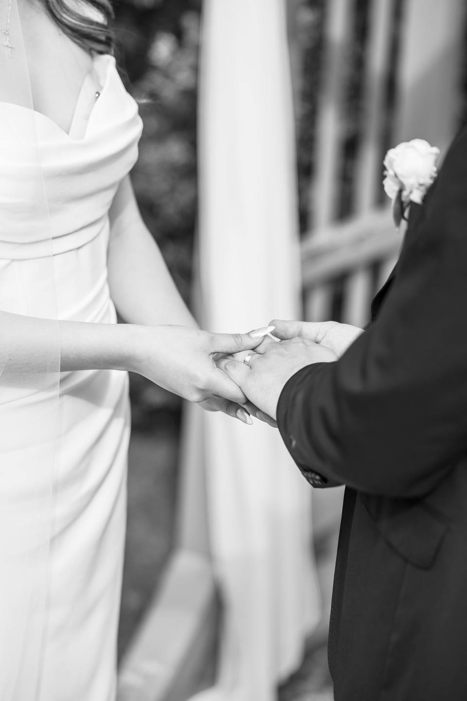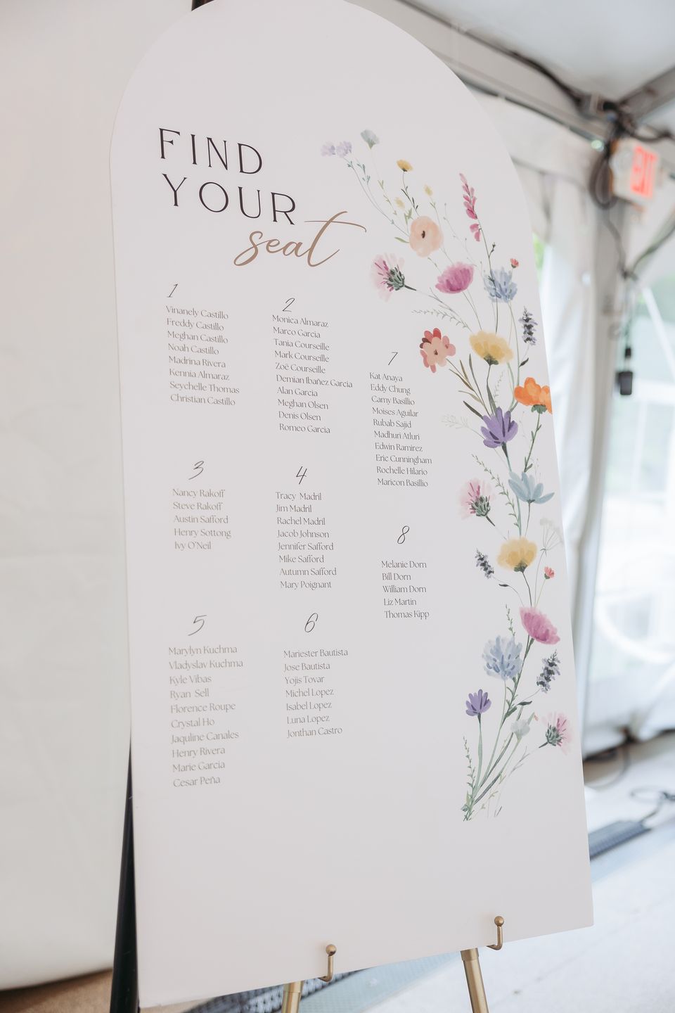 Their ceremony unfolded on the manicured lawn beneath a floral-draped arch bursting with white, yellow, pink, and orange blooms. Roses, peonies, wildflowers, and soft blue hydrangeas cascaded over airy white fabric, creating a romantic focal point against the natural landscape. Keila wore a strapless gown with effortless elegance, her soft waves complementing the relaxed garden setting, while David looked timeless in a classic black tuxedo finished with a crisp white boutonnière.