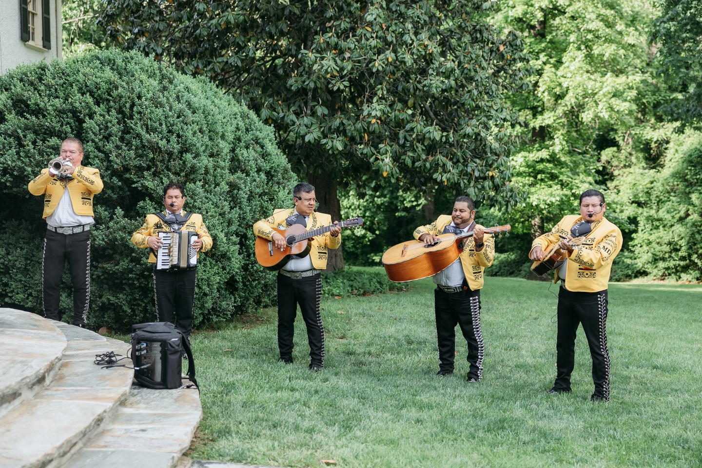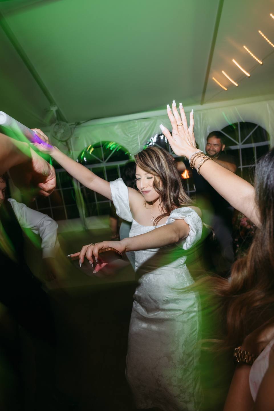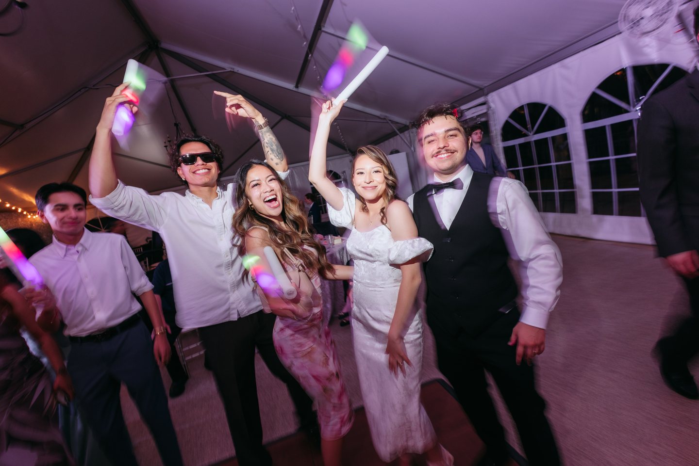 The celebration continued beneath a white tent glowing with vibrant green lighting and infectious energy. A lively mariachi band brought a meaningful cultural touch, filling the space with music as guests danced, waved colorful light sticks, and joined in the joy. A whimsical, artfully detailed cake by Mark Courseille added a playful statement to the reception, echoing the couple’s lighthearted spirit.