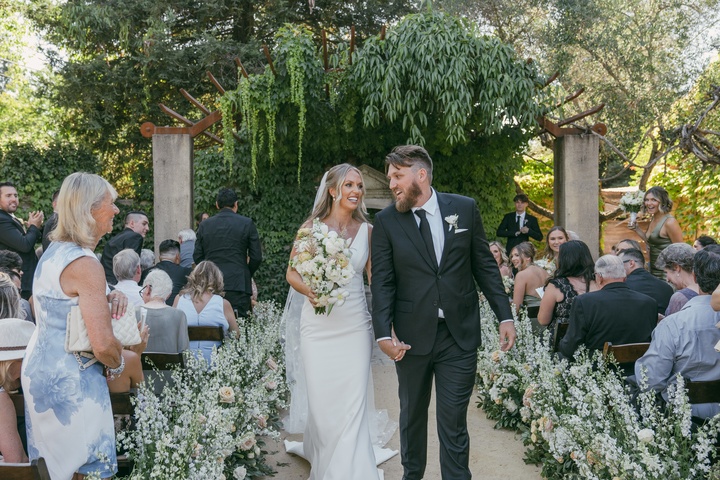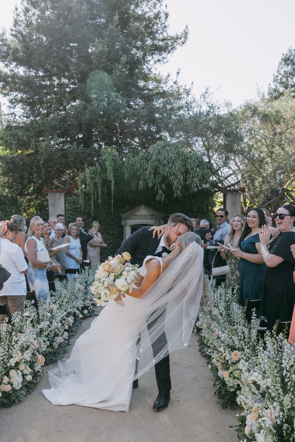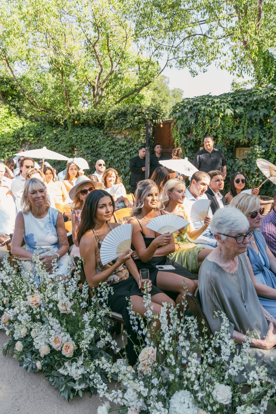 The ceremony unfolded beneath the trees, with wooden chairs lining a garden-inspired aisle layered in white and blush roses, wispy florals, and verdant greenery. A stone arch framed the vows as sunlight filtered through the leaves, while thoughtful touches like white parasols and fans kept guests comfortable during the outdoor exchange.