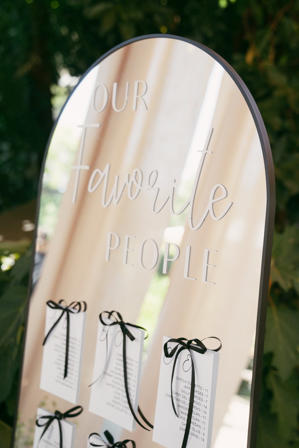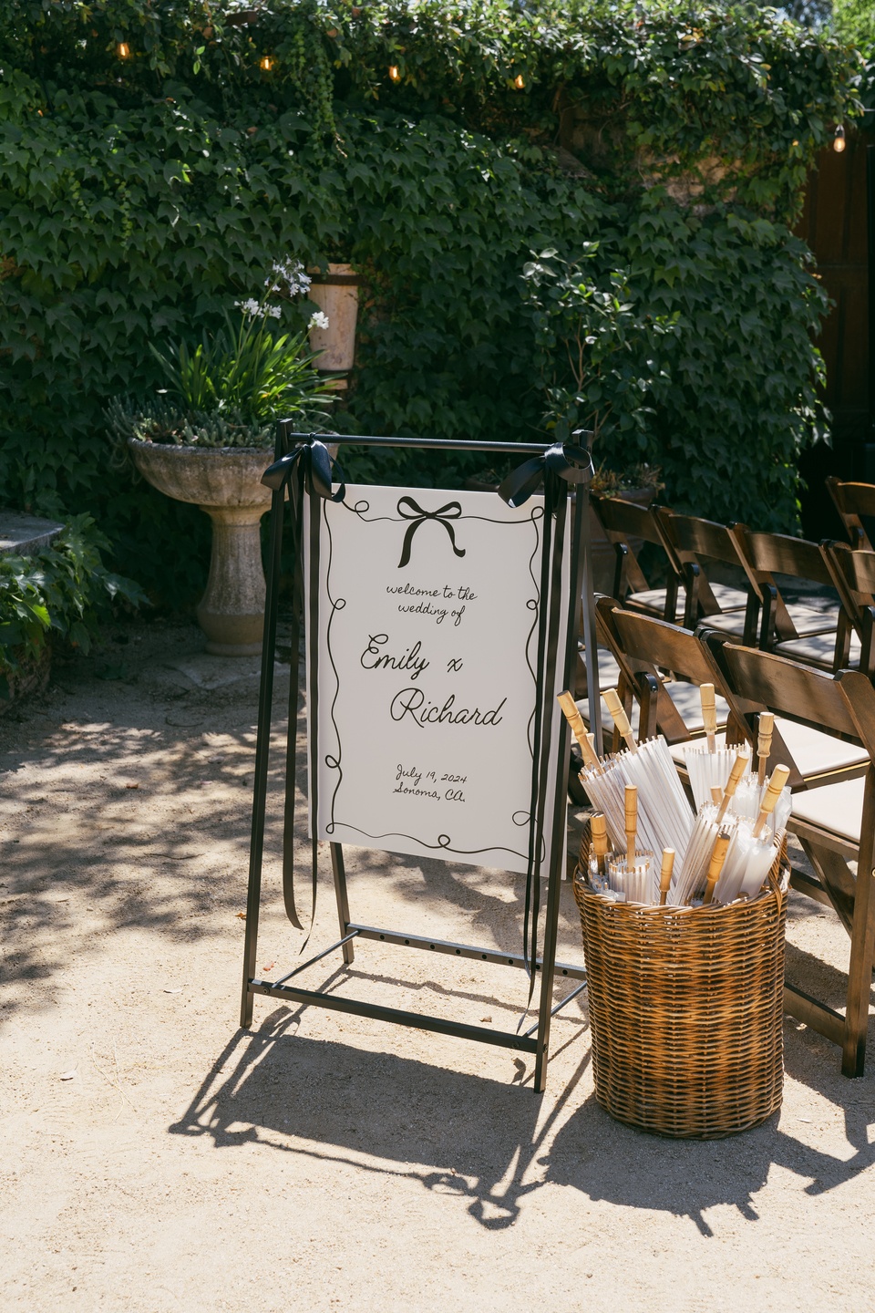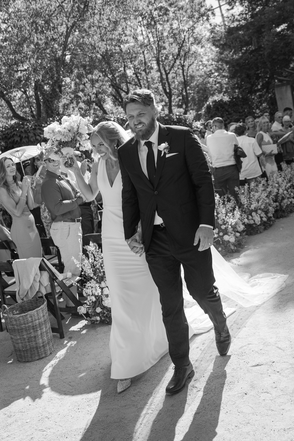 The ceremony unfolded beneath the trees, with wooden chairs lining a garden-inspired aisle layered in white and blush roses, wispy florals, and verdant greenery. A stone arch framed the vows as sunlight filtered through the leaves, while thoughtful touches like white parasols and fans kept guests comfortable during the outdoor exchange.