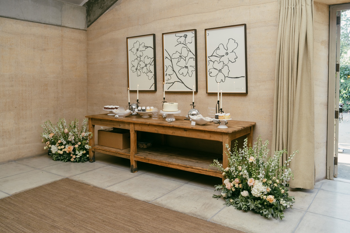 The reception carried the same understated elegance. A rustic table showcased a curated cake and dessert spread by Noble Folk, while Folktable Catering highlighted the region’s farm-to-table spirit with beautifully plated appetizers and seasonal bites finished with edible florals.