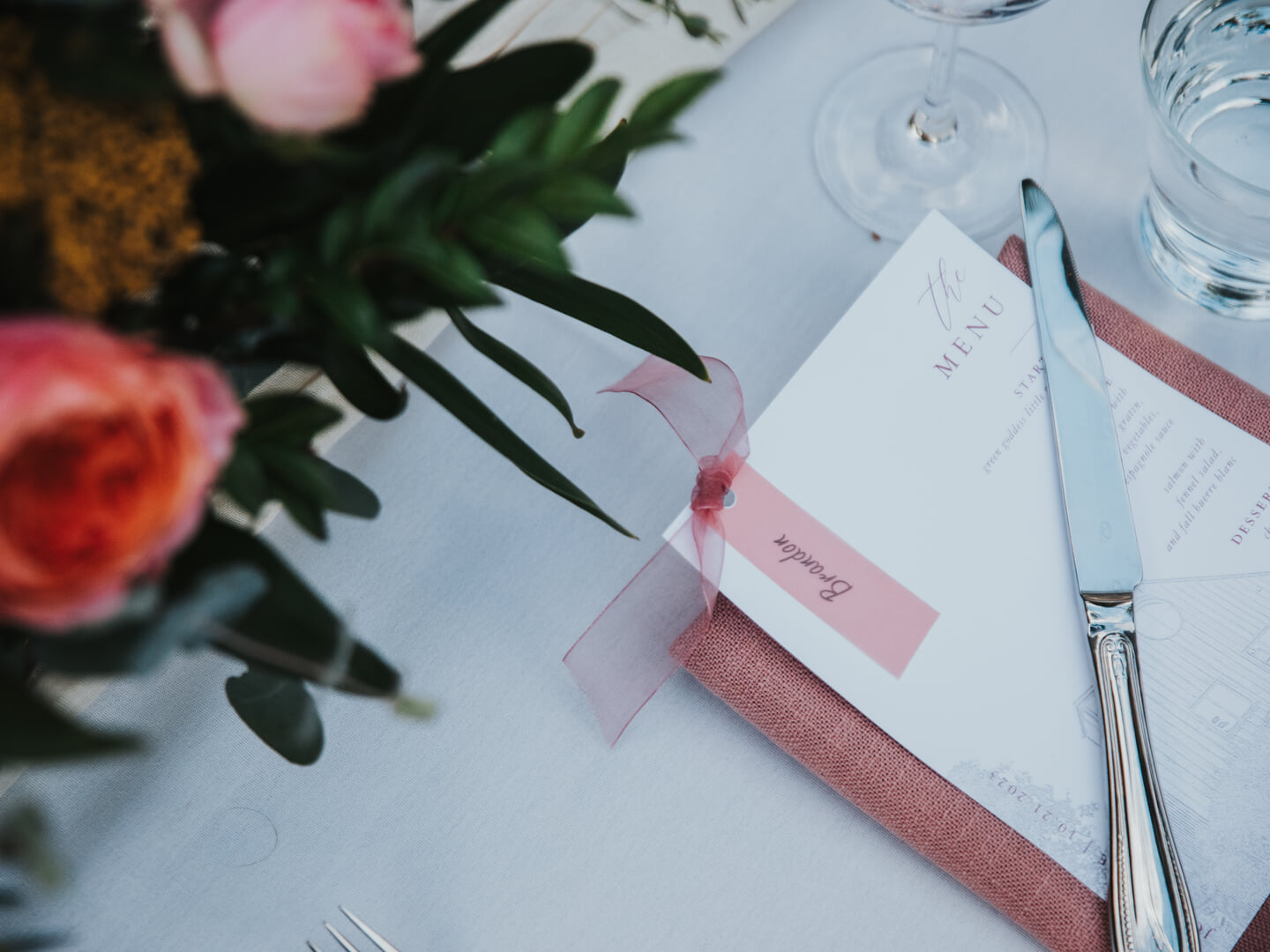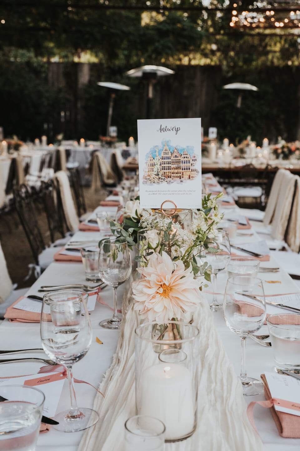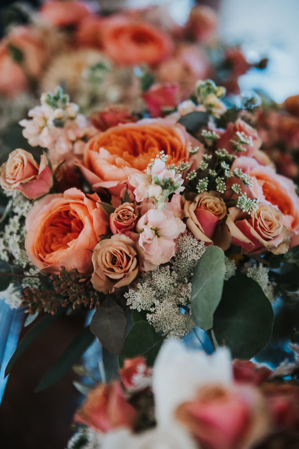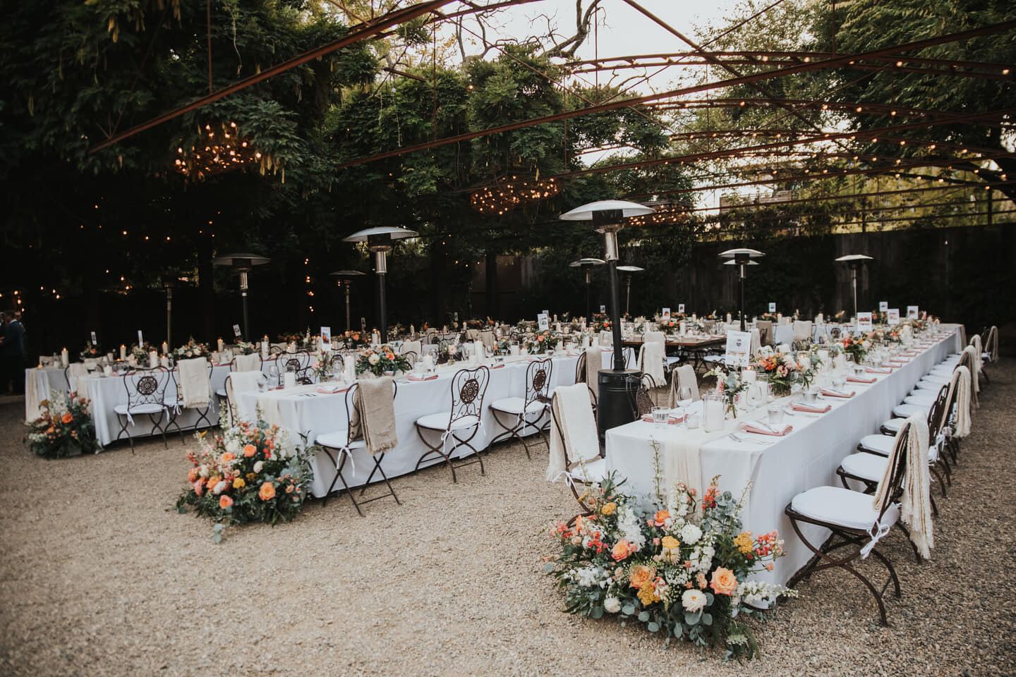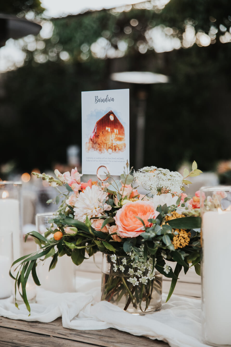 Their design centered on a soft, romantic palette of blush, peach, and warm sunset tones. Dragonfly Floral brought the vision to life with garden roses, dahlias, and eucalyptus that spilled organically across the tables, creating arrangements that felt lush yet natural and perfectly in tune with Barndiva’s garden setting.