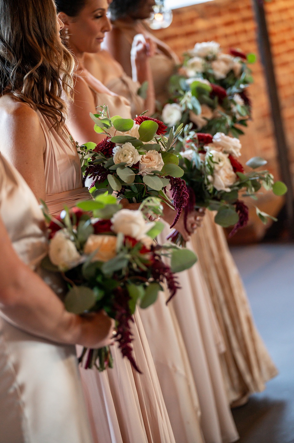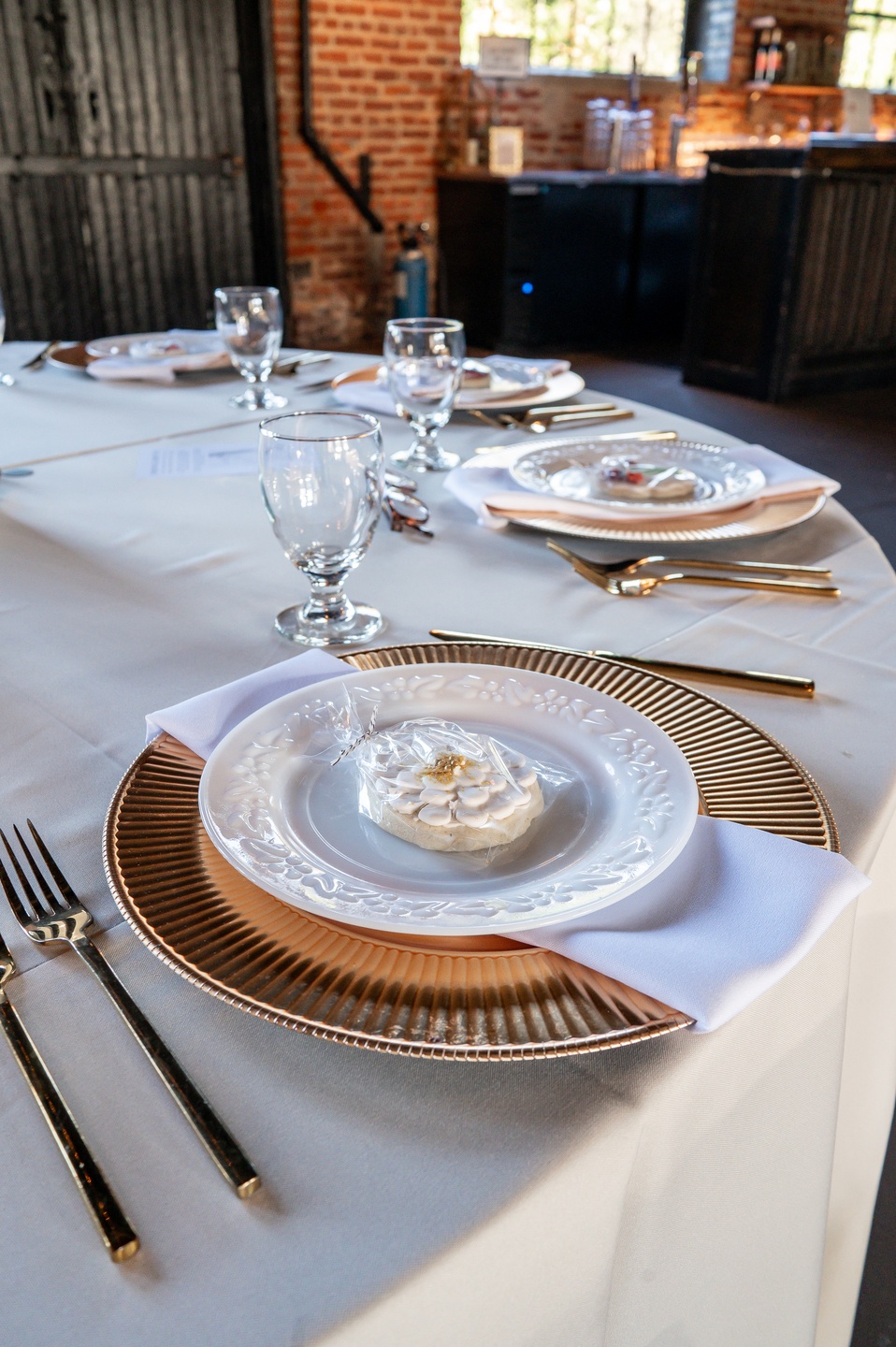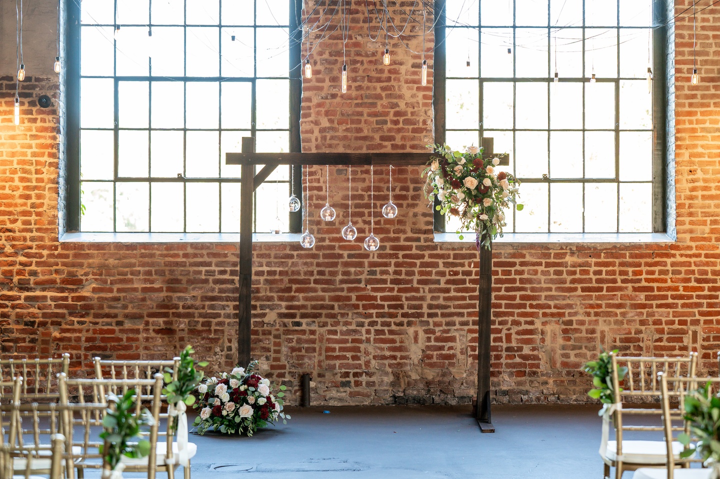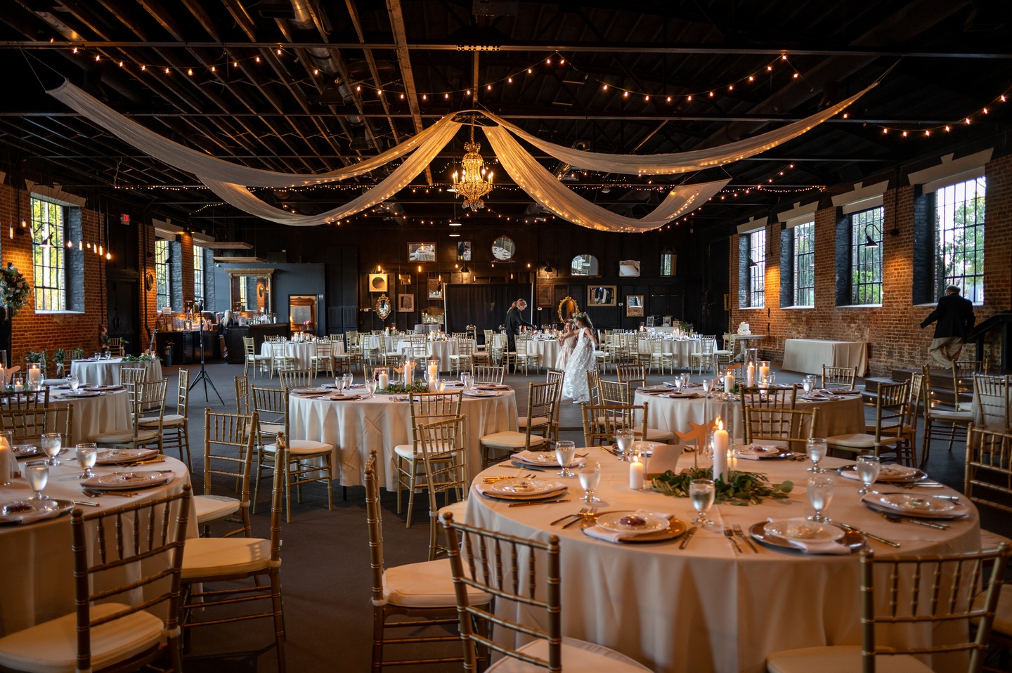 Channing and Jimmy’s wedding at The Silk Mill in Fredericksburg was a seamless blend of industrial charm and romantic elegance. The ceremony space was thoughtfully styled with gold Chiavari chairs accented by soft greenery, leading guests into an intimate scene illuminated by suspended glass orbs filled with flickering candles. Deep burgundy dahlias, blush roses, and cascading eucalyptus by Thompson’s – Westwood Florist added autumnal richness that softened the industrial setting.