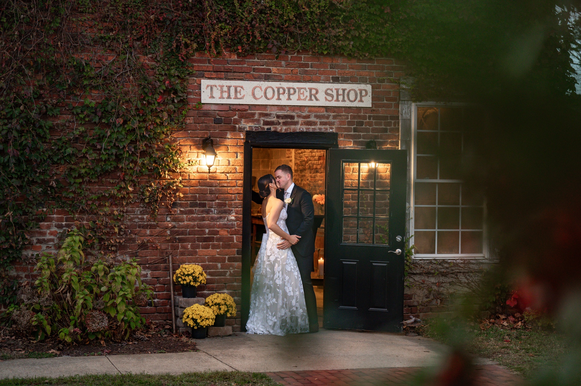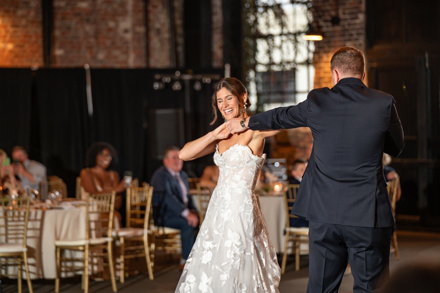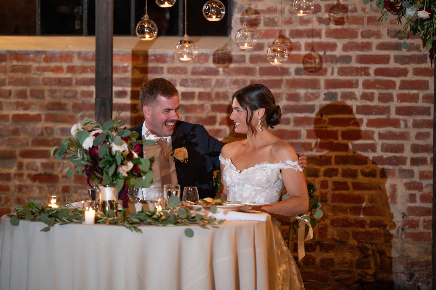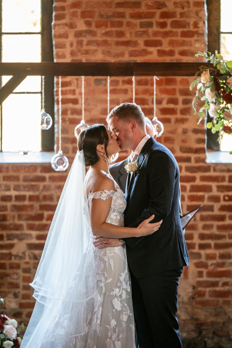Channing and Jimmy’s wedding at The Silk Mill in Fredericksburg was a seamless blend of industrial charm and romantic elegance. The ceremony space was thoughtfully styled with gold Chiavari chairs accented by soft greenery, leading guests into an intimate scene illuminated by suspended glass orbs filled with flickering candles. Deep burgundy dahlias, blush roses, and cascading eucalyptus by Thompson’s – Westwood Florist added autumnal richness that softened the industrial setting.