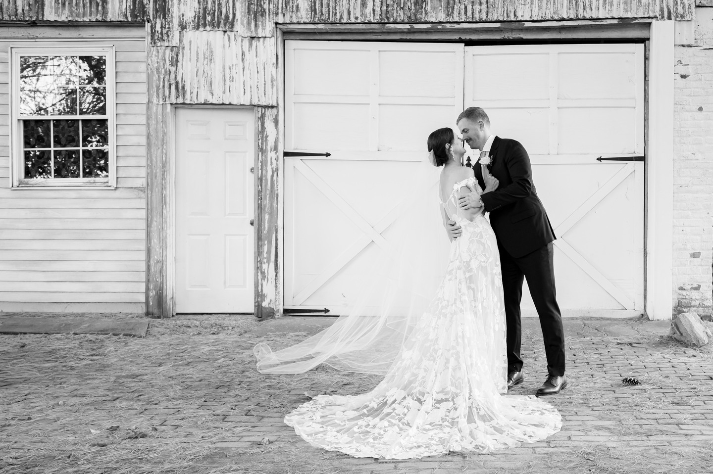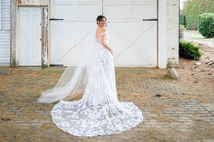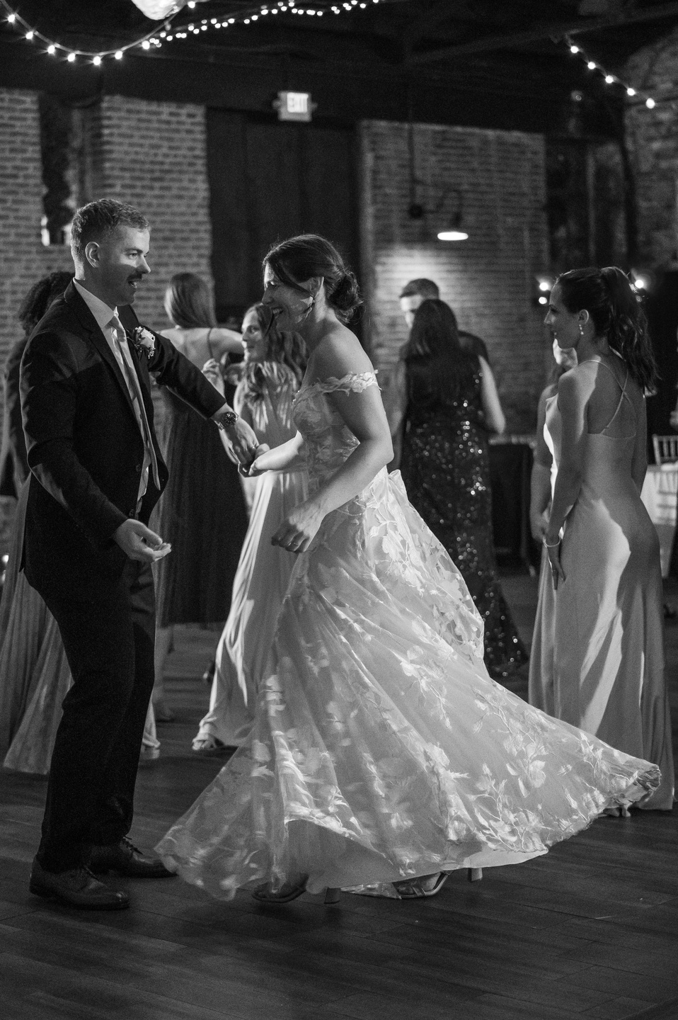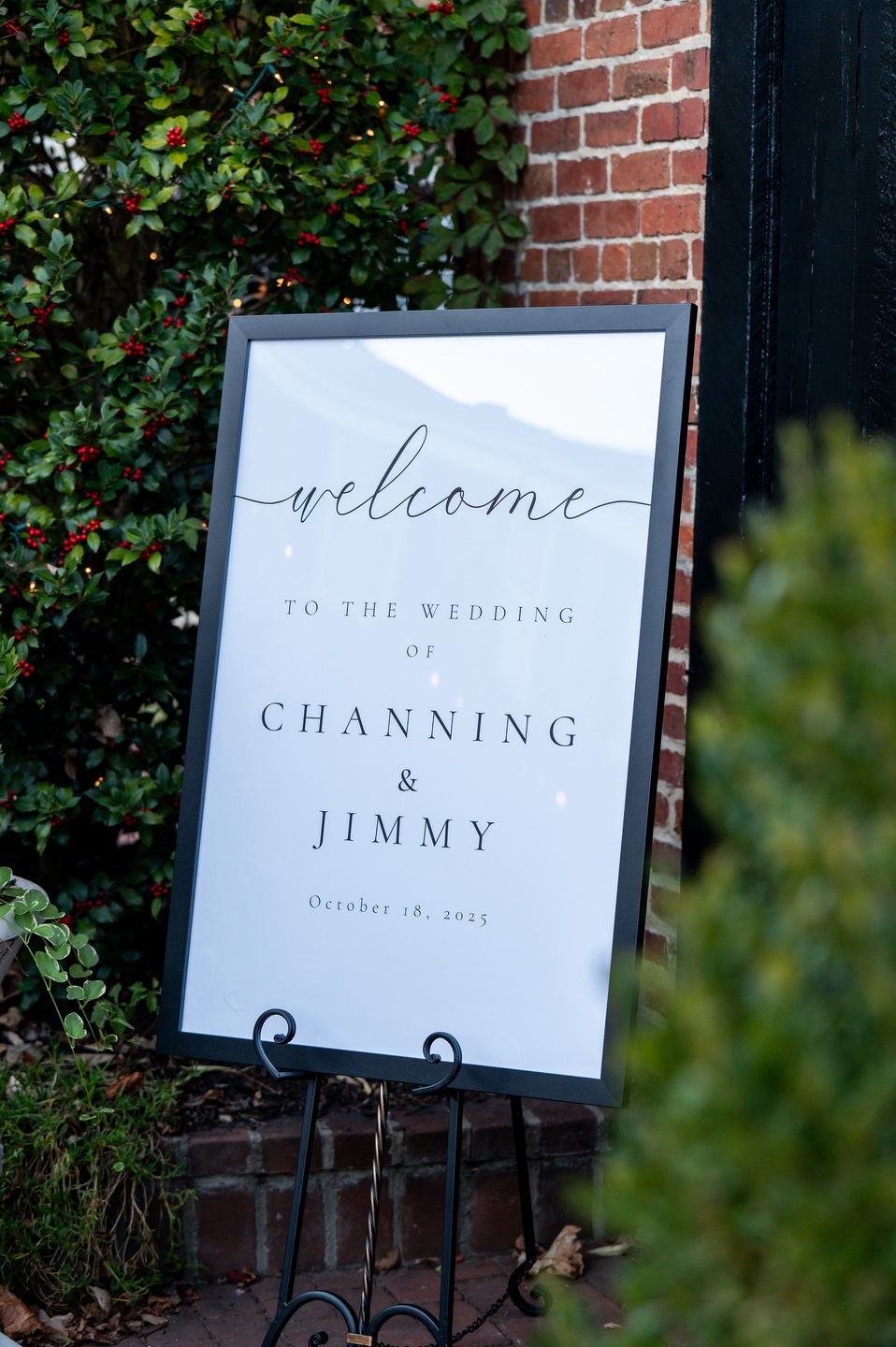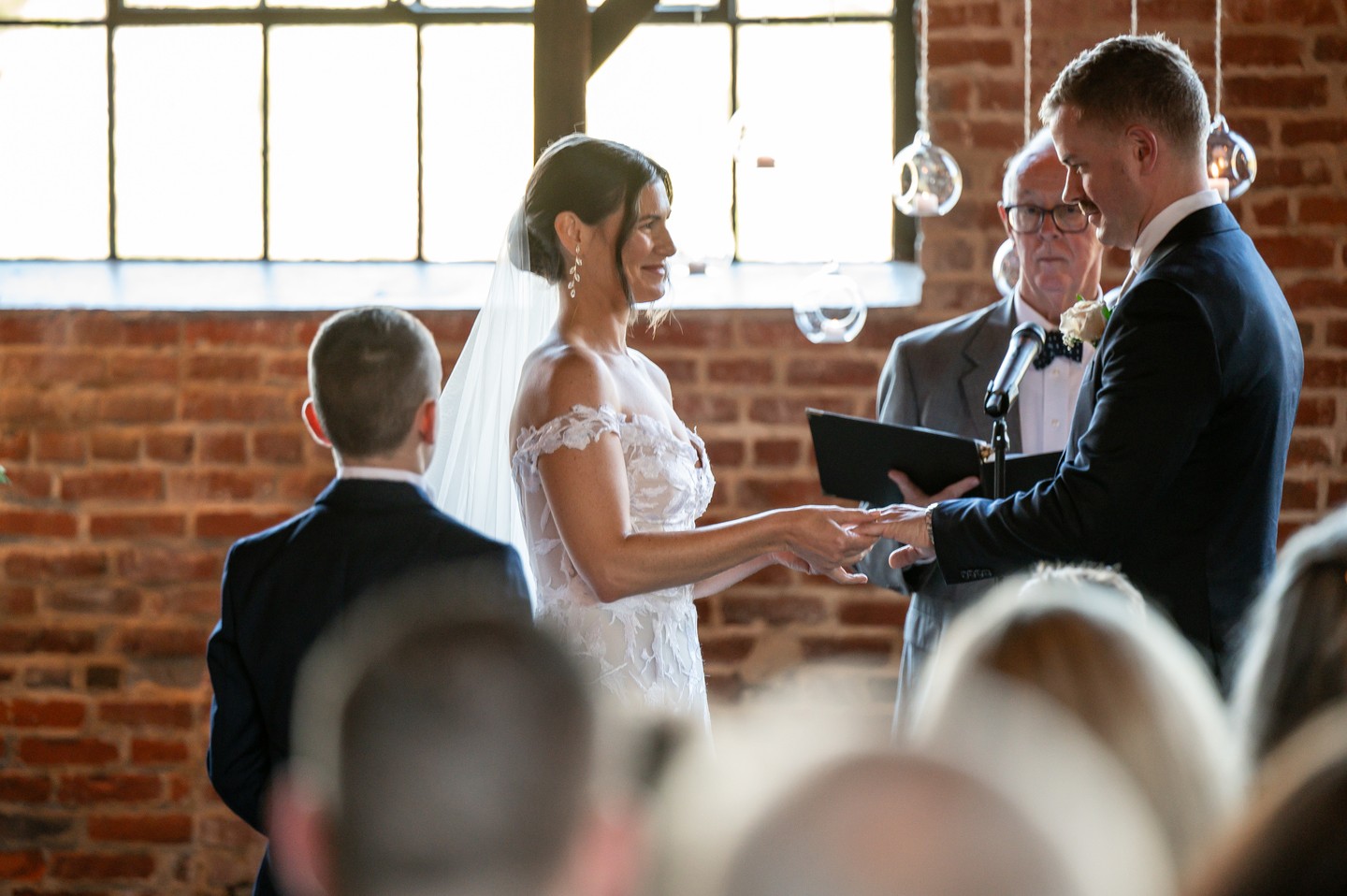 Channing and Jimmy’s wedding at The Silk Mill in Fredericksburg was a seamless blend of industrial charm and romantic elegance. The ceremony space was thoughtfully styled with gold Chiavari chairs accented by soft greenery, leading guests into an intimate scene illuminated by suspended glass orbs filled with flickering candles. Deep burgundy dahlias, blush roses, and cascading eucalyptus by Thompson’s – Westwood Florist added autumnal richness that softened the industrial setting.