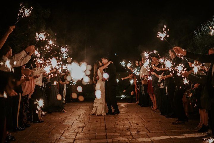 Their ceremony unfolded beneath a canopy of trees, where a white-draped arbor softened with hydrangeas framed sweeping farmland and distant mountains. Amanda wore a lace gown with floral detailing, finished with a lavender and baby’s breath flower crown that echoed the farm’s natural beauty.