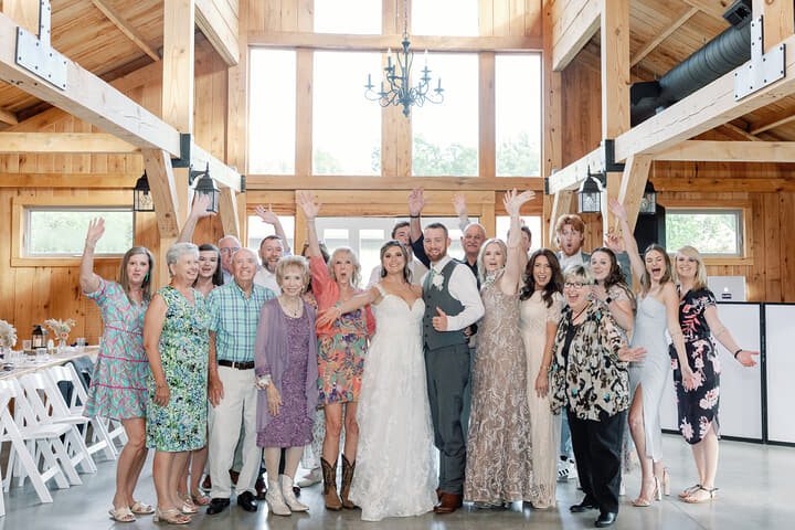The reception unfolded inside the timber frame barn, where a stone fireplace wall and a glowing “The Taylors” sign framed the sweetheart table. Tables were styled with lace runners, lanterns, and blush florals, while guests enjoyed a menu by Deep Run Roadhouse and music by DJ.KO Entertainment kept the dance floor lively.