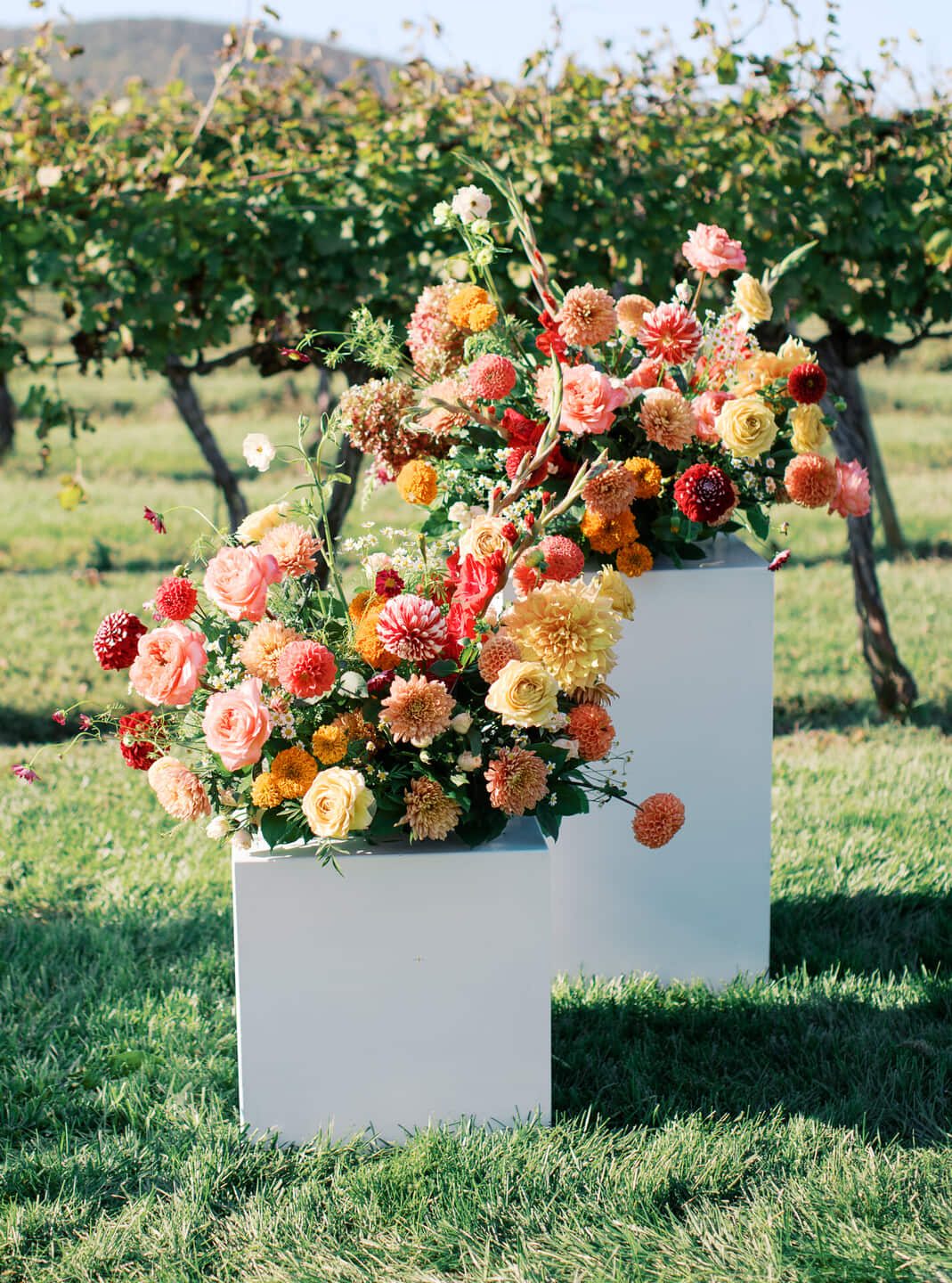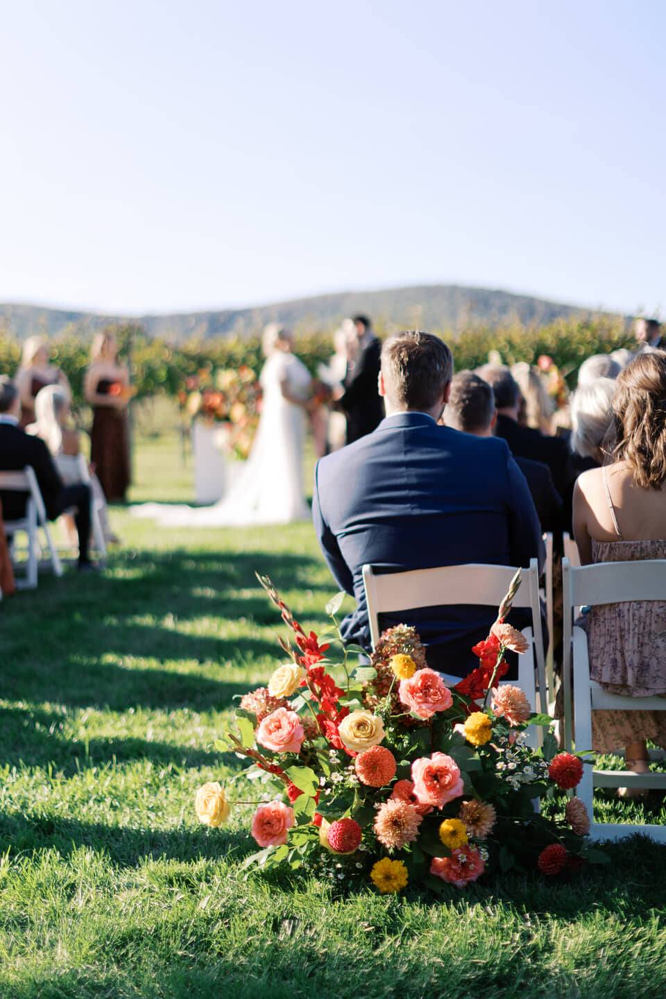 The ceremony, aglow with golden hour light, was tender and heartfelt—an unforgettable moment surrounded by the people they love most. They exchanged vows flanked by floral arrangements by Fleuressence, where red, peach, and golden blooms echoed the richness of the autumn landscape. Afterward, the celebration continued beneath twinkling string lights. Tables glowed with candlelight and warm autumn textures as guests mingled and toasted under the stars. A lavish sweets table, featuring a white heart couquette cake and decadent treats, set the tone for a joyful evening filled with music, laughter, and dancing to a vibrant set by Prime Time Event Group.