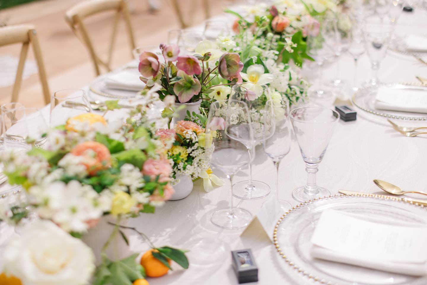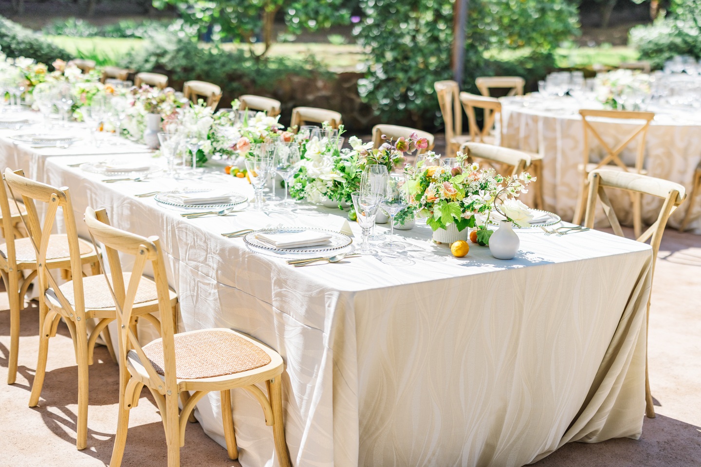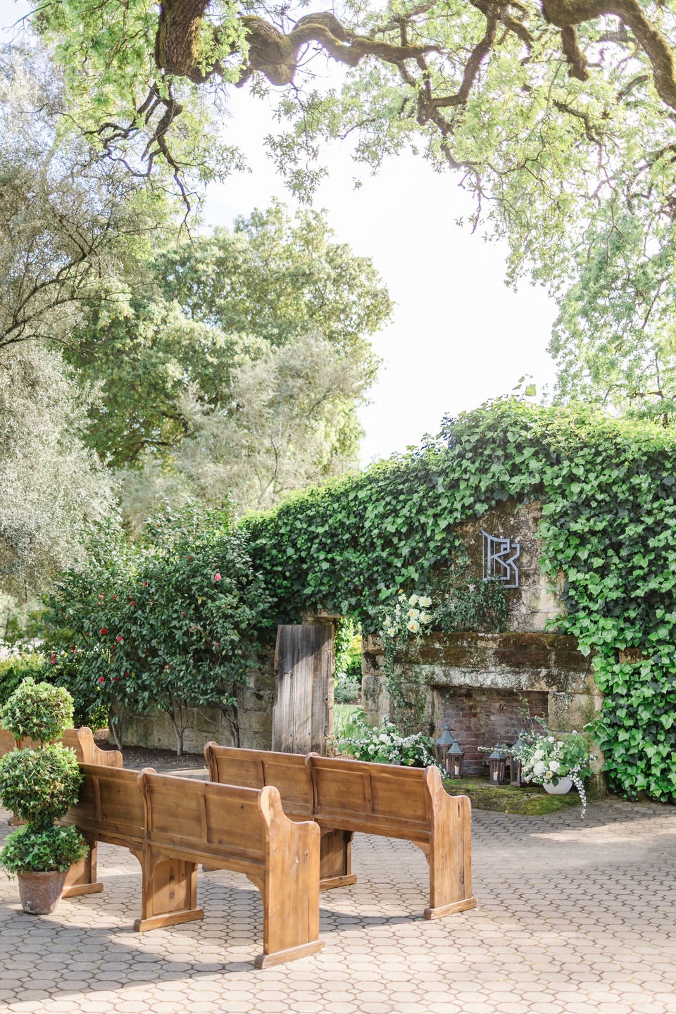 The Grove emerged as an enchanting setting, envisioned as both ceremony and reception space. Surrounded by century-old redwood trees, ivy-covered stone walls, and weathered wood accents, the area offered a rustic yet polished atmosphere deeply connected to the land. Even with minimal design, its quiet simplicity felt entirely unforgettable. Lounge furnishings from Bright Event Rentals added understated elegance throughout the space, while reception tables dressed in refined linens by Napa Valley Linens set a polished foundation. Loose, organic floral arrangements in soft whites and greens by EV Floral Design, accented with white ranunculus, green hydrangeas, and subtle hints of yellow tulips, flowed effortlessly across the tables, completing the look with romantic ease.
