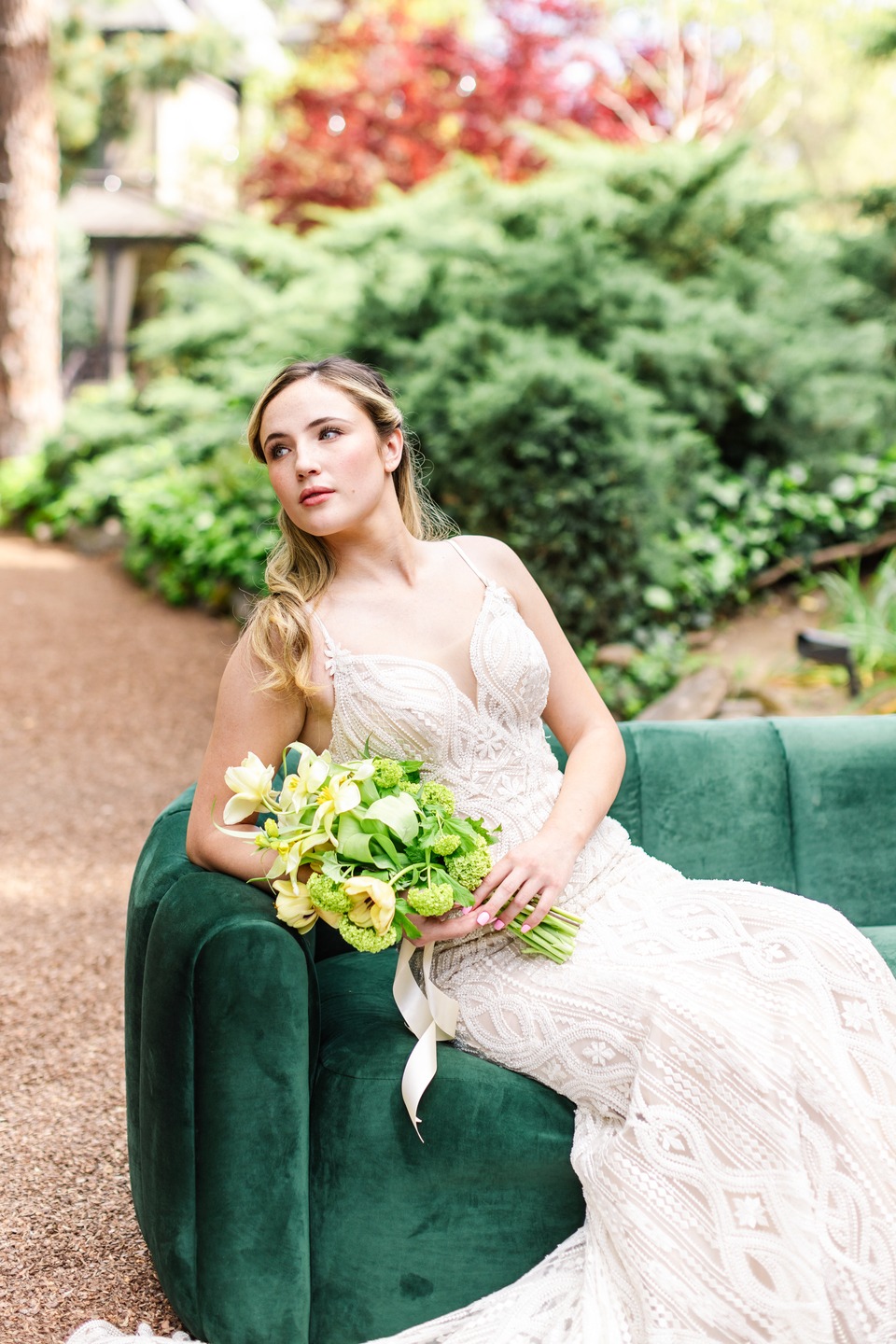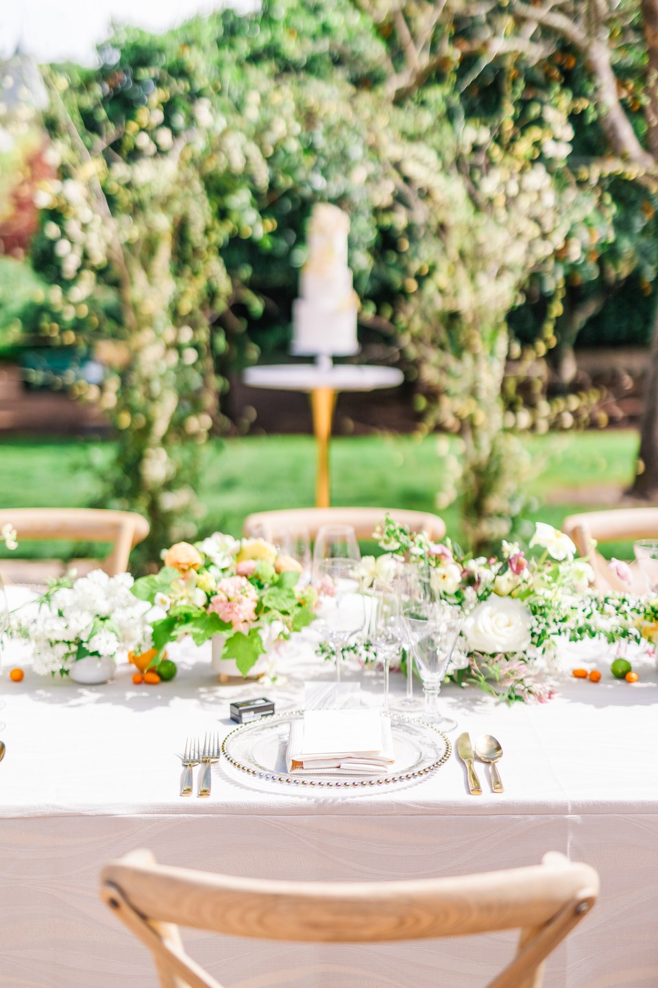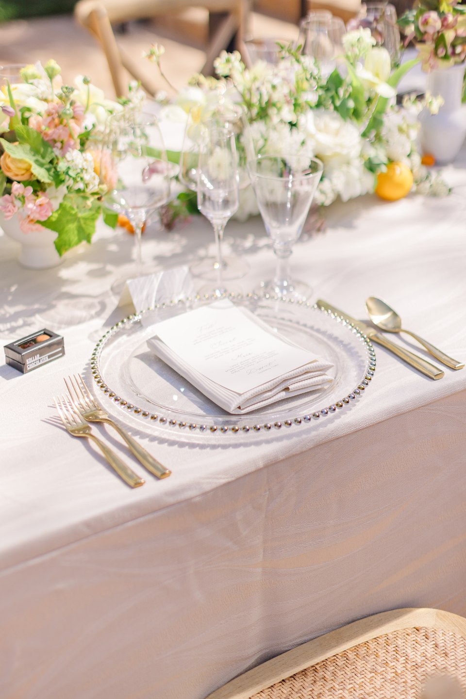 The Grove emerged as an enchanting setting, envisioned as both ceremony and reception space. Surrounded by century-old redwood trees, ivy-covered stone walls, and weathered wood accents, the area offered a rustic yet polished atmosphere deeply connected to the land. Even with minimal design, its quiet simplicity felt entirely unforgettable. Lounge furnishings from Bright Event Rentals added understated elegance throughout the space, while reception tables dressed in refined linens by Napa Valley Linens set a polished foundation. Loose, organic floral arrangements in soft whites and greens by EV Floral Design, accented with white ranunculus, green hydrangeas, and subtle hints of yellow tulips, flowed effortlessly across the tables, completing the look with romantic ease.