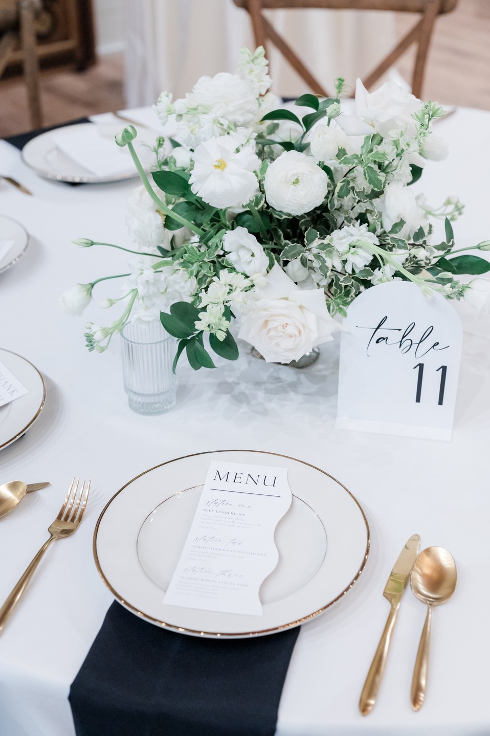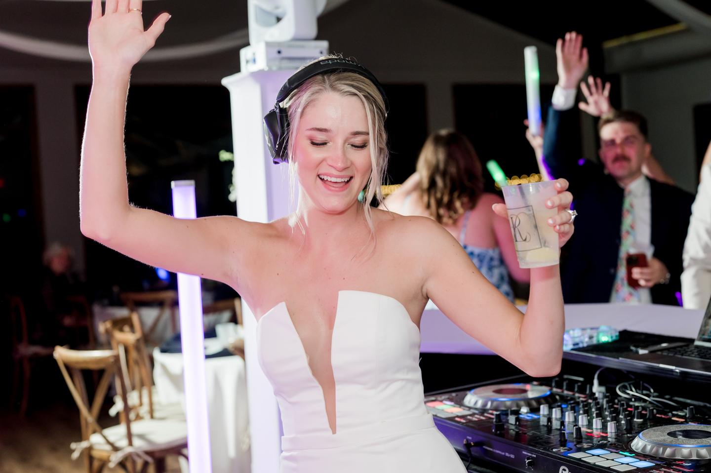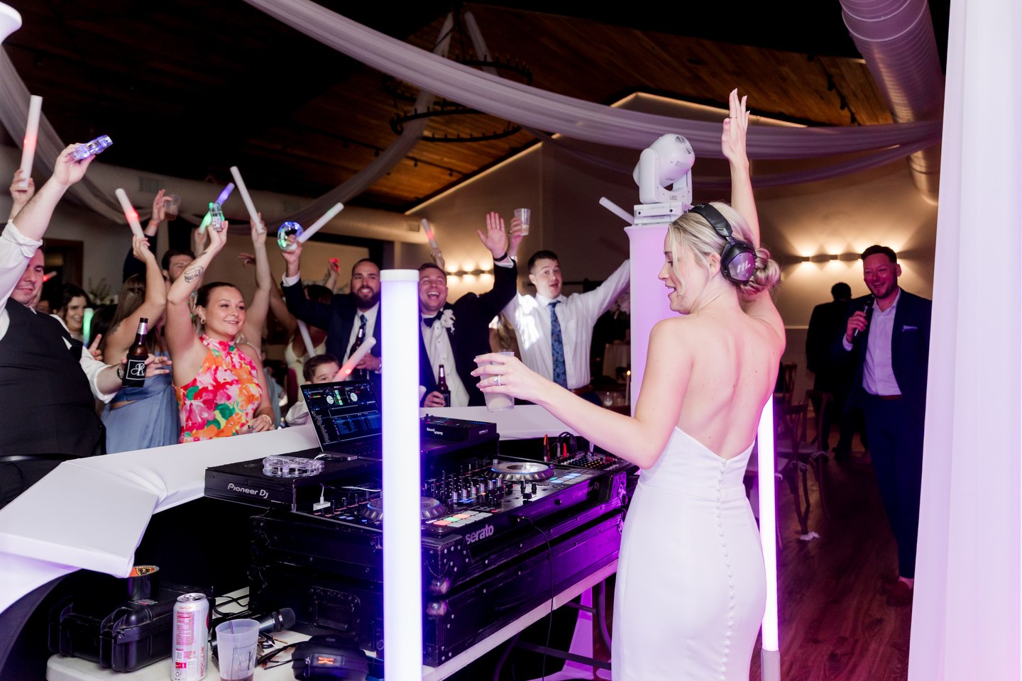 For the reception, Simply Elegant Event Rentals and EventWorks transformed the barn-style space with cross-back chairs, white linens, and centerpieces of roses and greenery. A magnificent chandelier and glowing string lights set the tone for an evening of warmth and celebration. Guests enjoyed exquisite menus prepared by Duvall Catering & Events and Best Impressions Caterers before taking to the dance floor, where the bride herself stepped into the DJ booth. Glowsticks lit up the night as laughter and music carried the celebration to its spirited finale.
