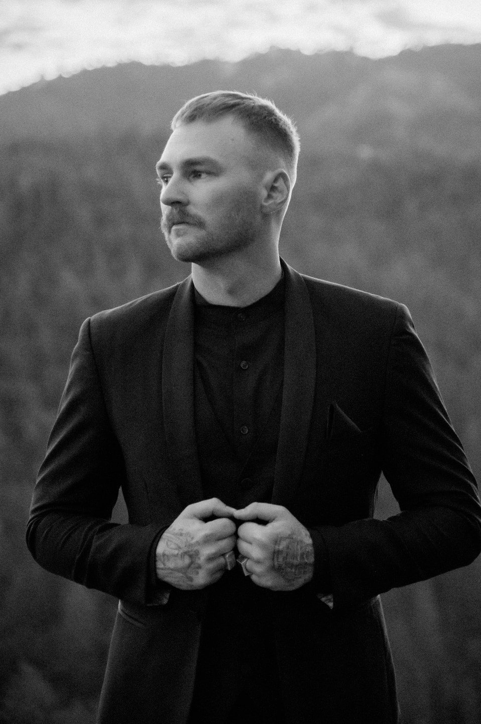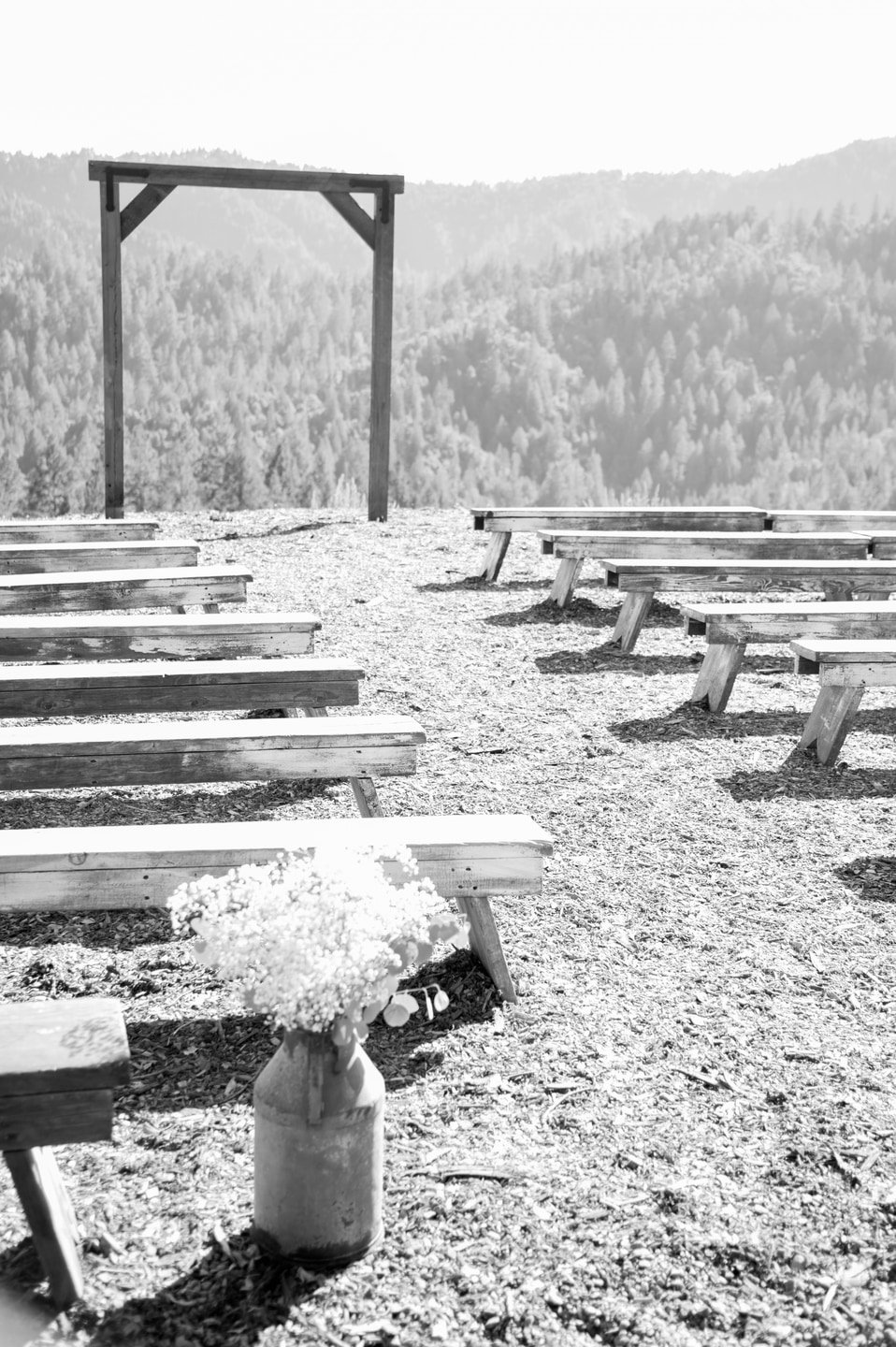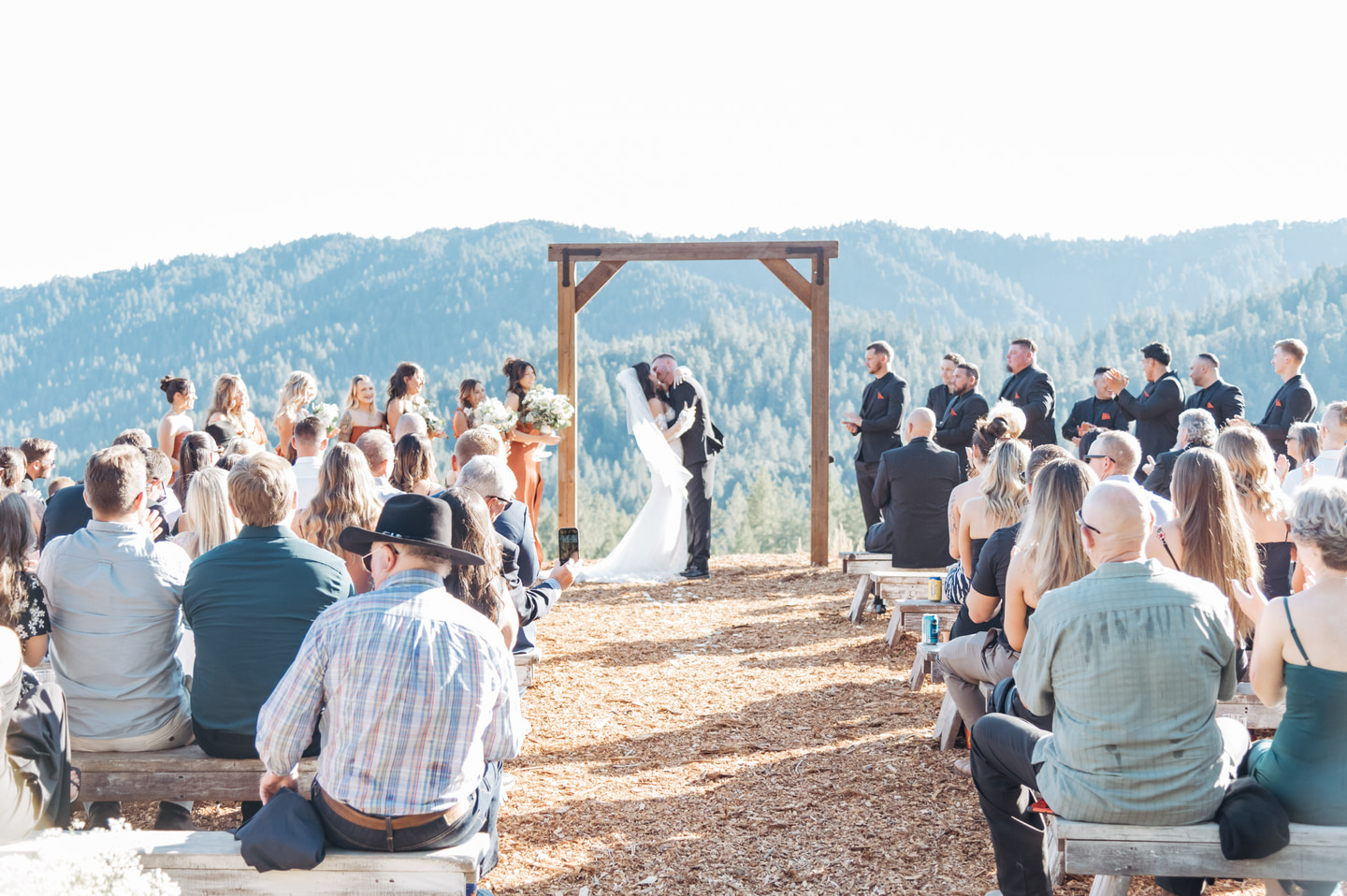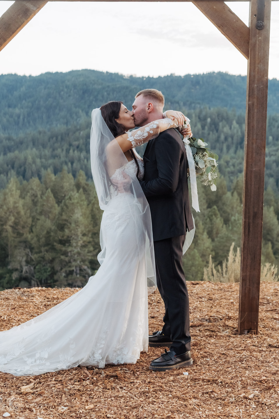 The ceremony unfolded on a wooden platform overlooking the forest canopy, with soft wood chips underfoot adding an organic texture to the mountainside setting. The moment felt intimate and expansive all at once, framed by uninterrupted views of towering trees and open sky.