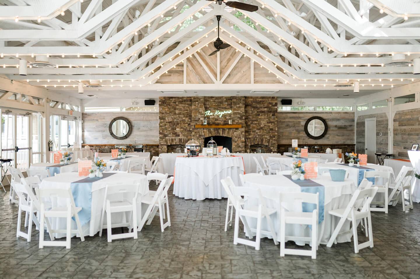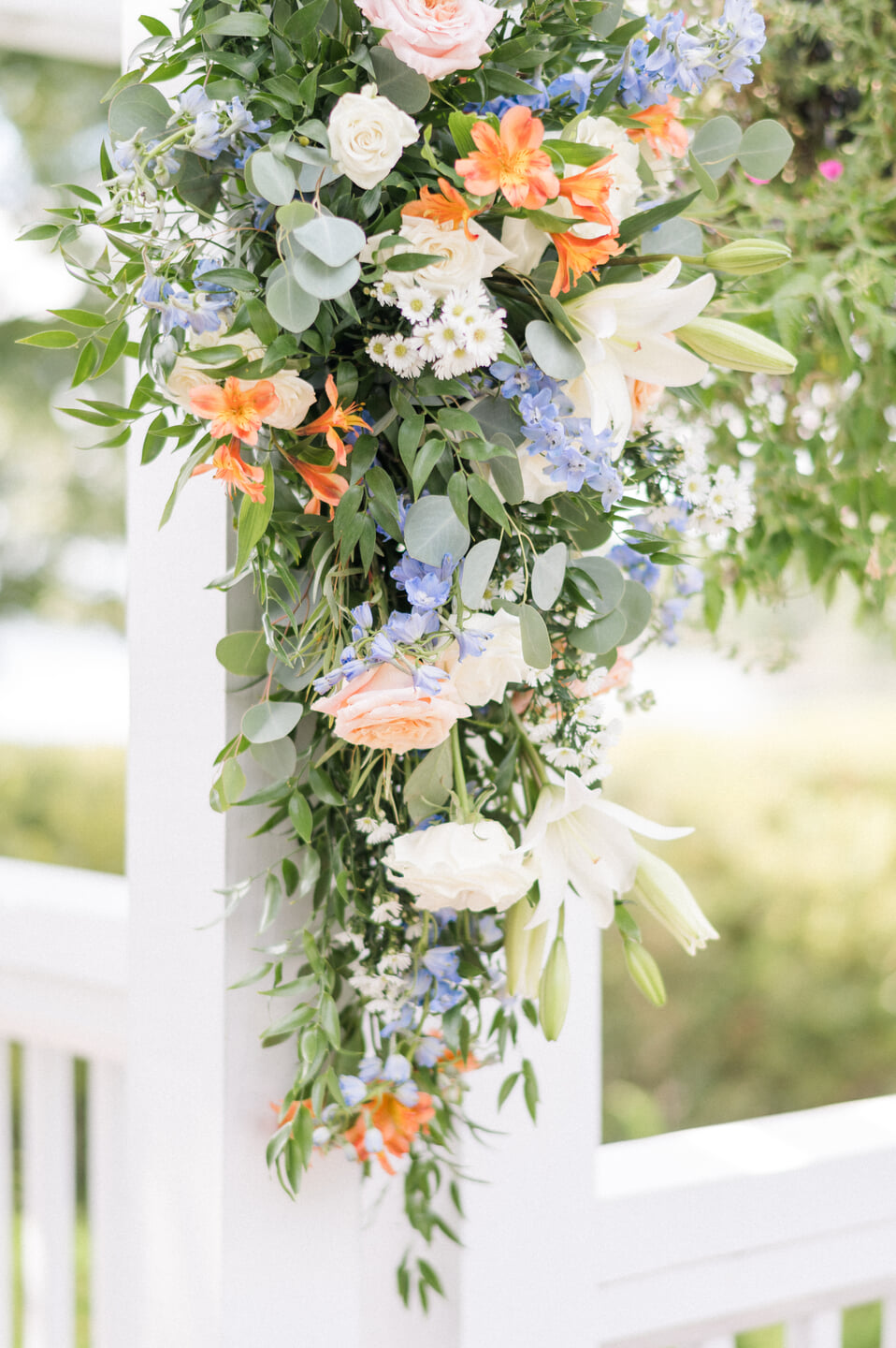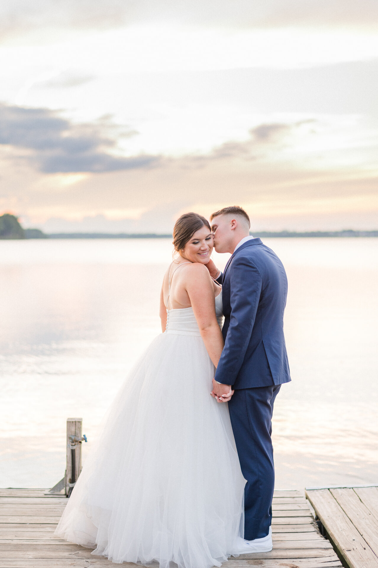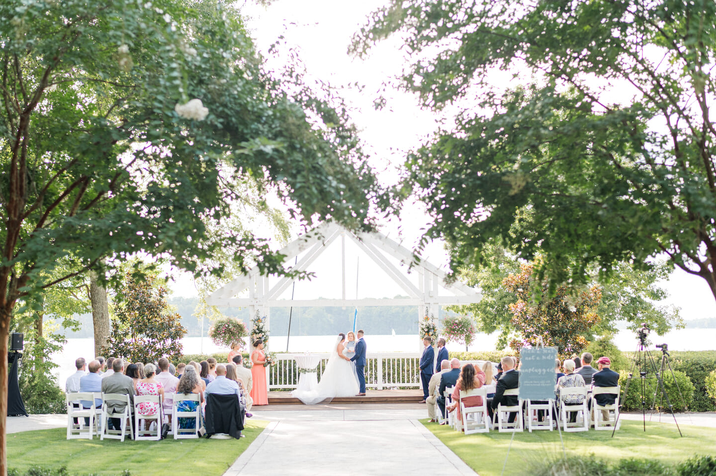 Their ceremony unfolded beneath a white-framed pavilion overlooking the lake, where Flowers by Zoie adorned the space with peach and pale blue blooms. Surrounded by lush greenery and the shimmer of the water, the couple exchanged vows in an atmosphere of soft romance and natural beauty.