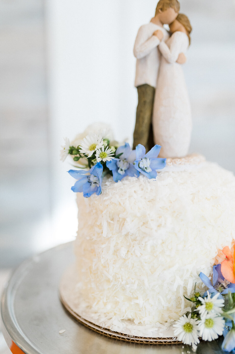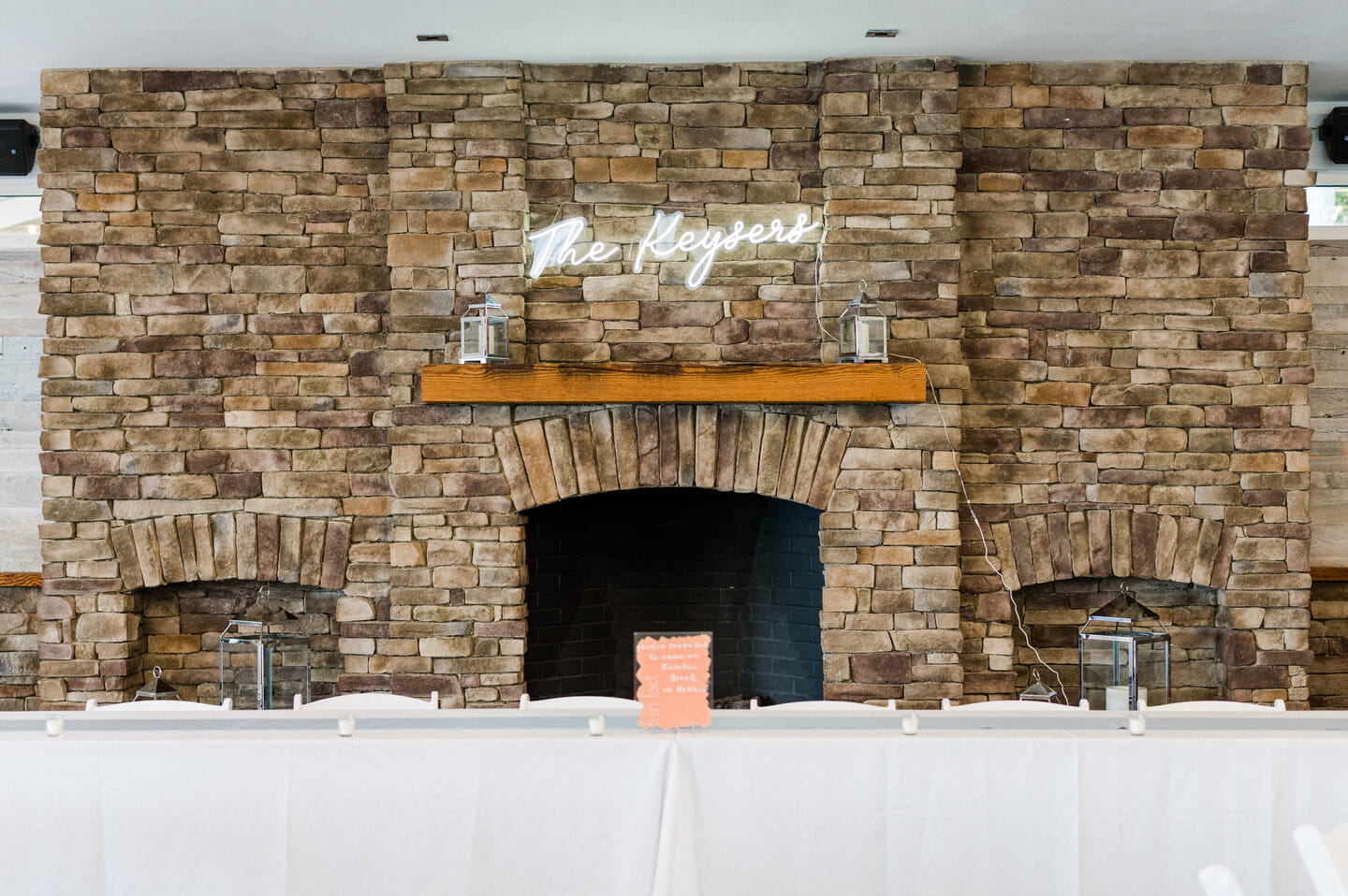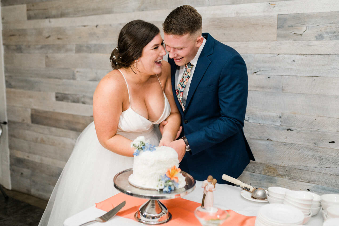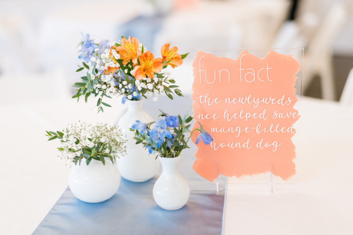 Their ceremony unfolded beneath a white-framed pavilion overlooking the lake, where Flowers by Zoie adorned the space with peach and pale blue blooms. Surrounded by lush greenery and the shimmer of the water, the couple exchanged vows in an atmosphere of soft romance and natural beauty.