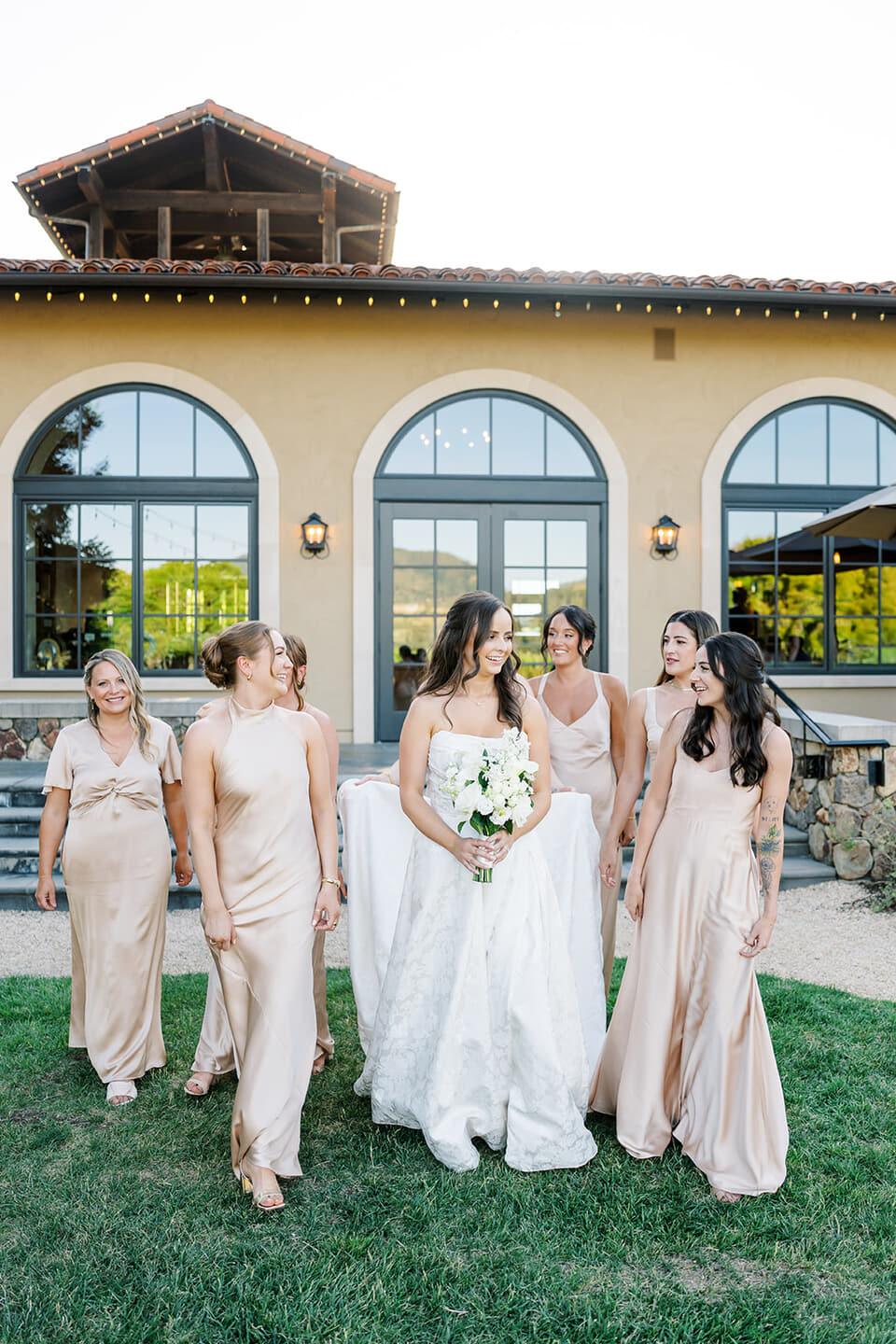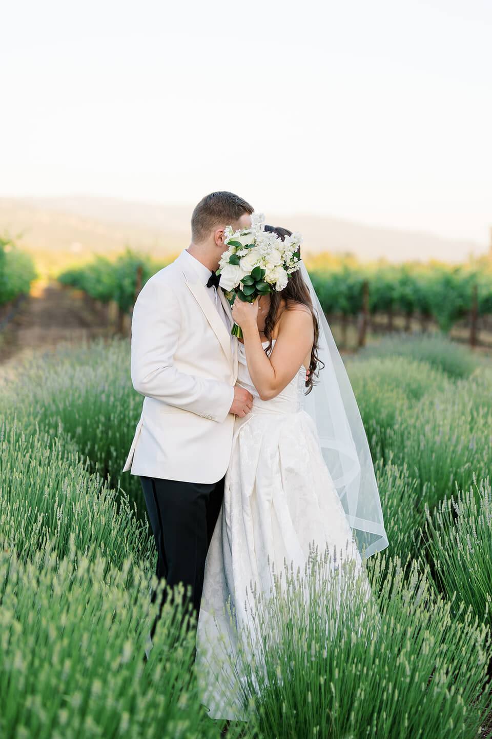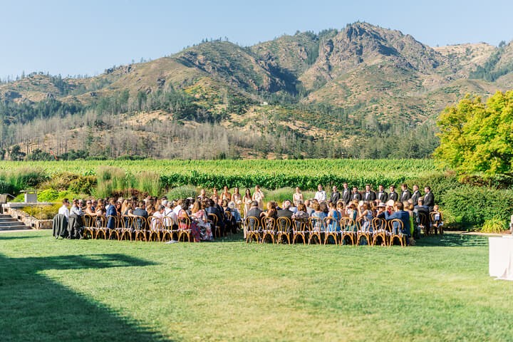 Matt and Becky’s late May wedding at St. Francis Winery in Santa Rosa unfolded with effortless elegance, perfectly mirroring their vision of refined simplicity set within California wine country. Warm light, sweeping vineyard views, and a serene palette created a celebration that felt timeless and deeply personal. The ceremony took place on the winery’s manicured lawn, framed by dramatic mountain ranges and rolling vineyards. Elegant chairs lined the aisle as the couple exchanged vows surrounded by native grasses and open skies, a setting that felt both expansive and intimate. Pristine white roses and delicate greenery designed by Flowers by Rebekah softened the space, adding a romantic, ethereal touch that echoed the natural landscape.