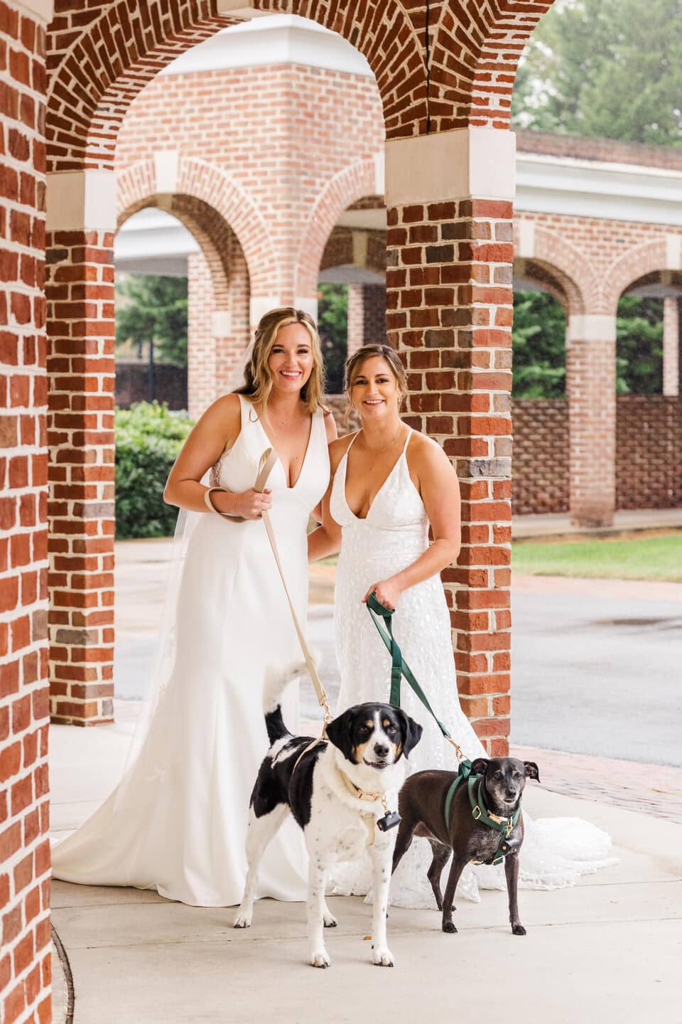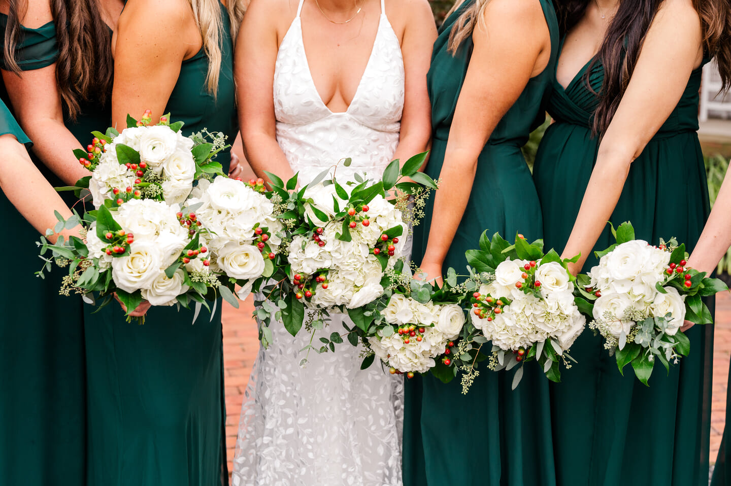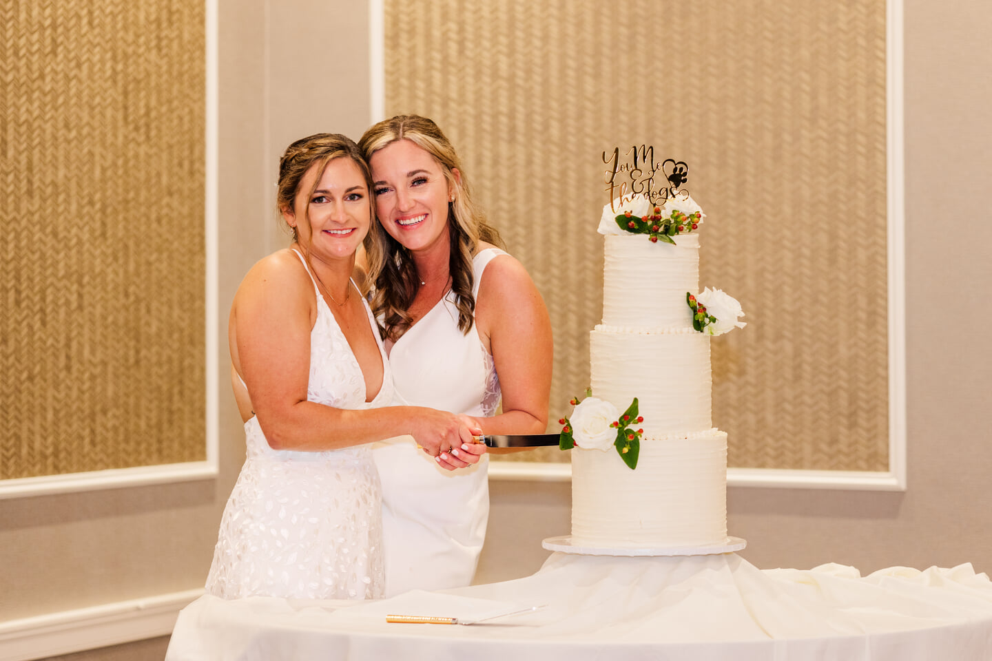 Planned and catered by the venue’s expert team, the celebration unfolded in a sophisticated palette of white, emerald green, and crimson red. Tommy’s Garden designed lush floral arrangements of hydrangeas, roses, and red berries that brought vibrance to both ceremony and reception. Beneath a white pergola framed by greenery, the brides exchanged heartfelt vows surrounded by loved ones—and their two beloved dogs, who added extra warmth to the moment.