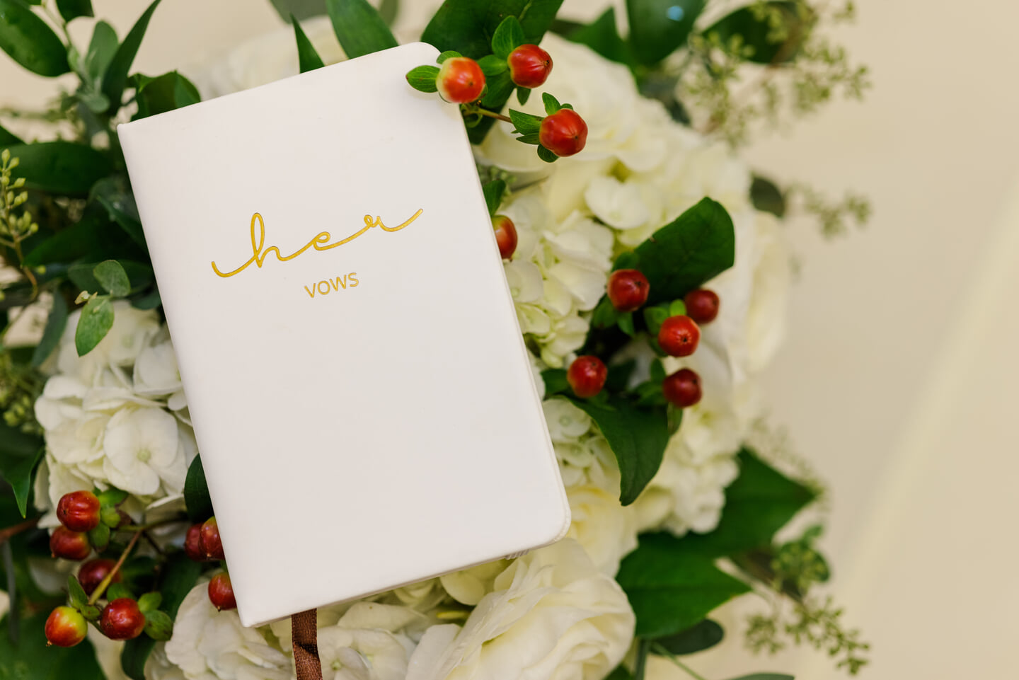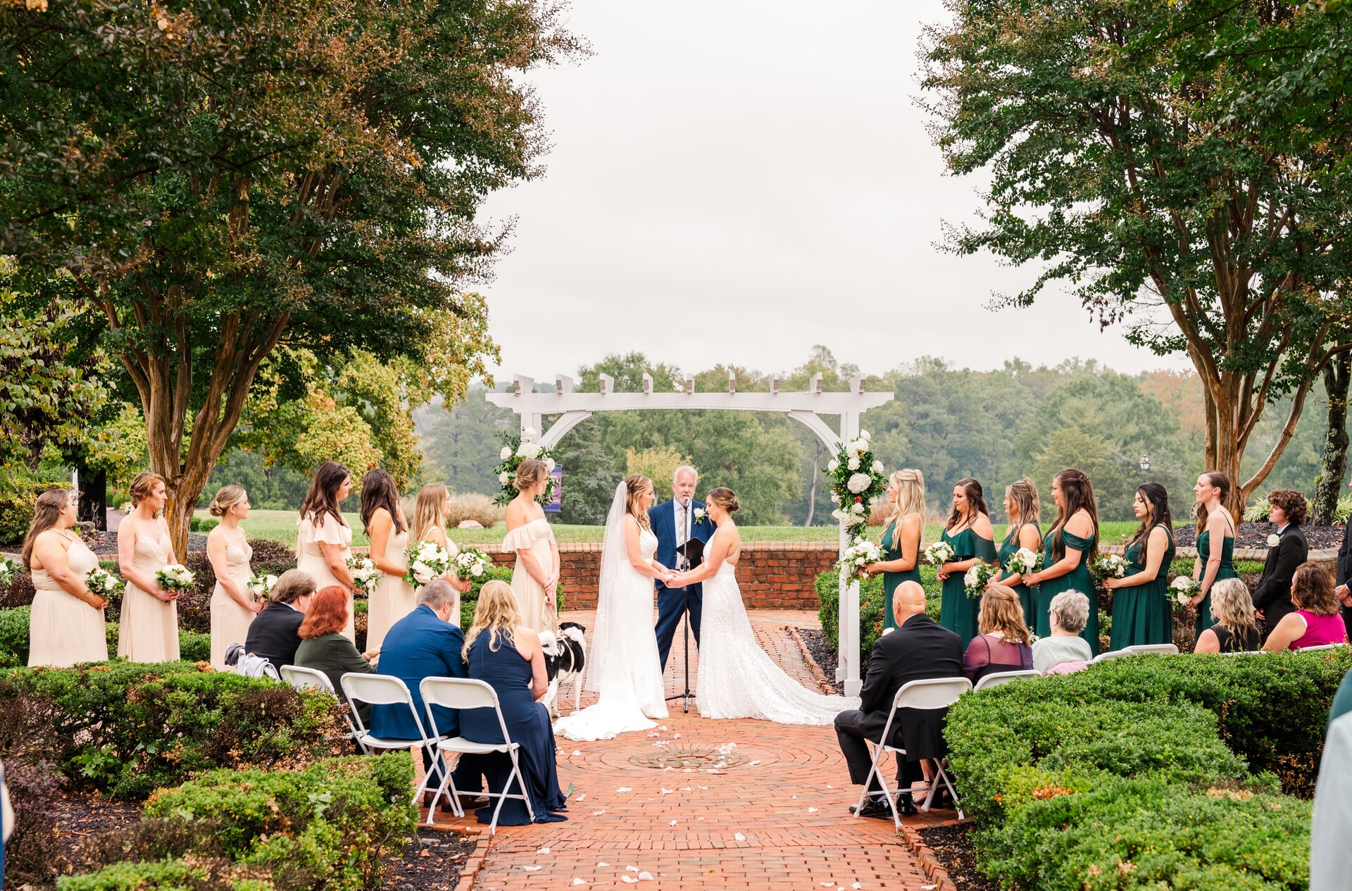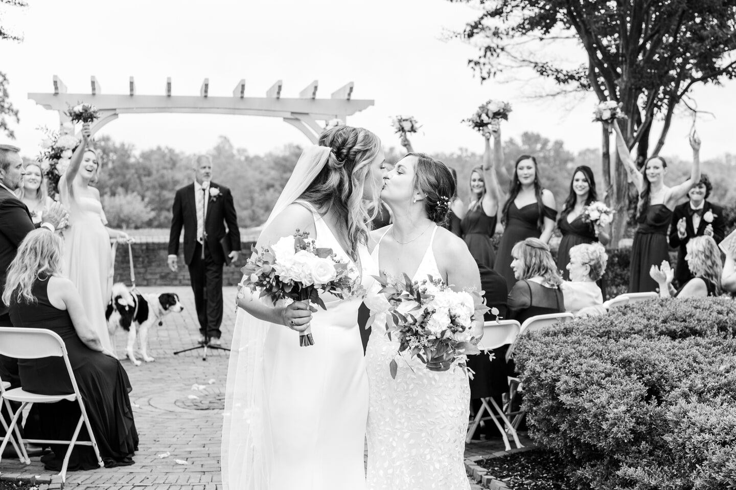 Planned and catered by the venue’s expert team, the celebration unfolded in a sophisticated palette of white, emerald green, and crimson red. Tommy’s Garden designed lush floral arrangements of hydrangeas, roses, and red berries that brought vibrance to both ceremony and reception. Beneath a white pergola framed by greenery, the brides exchanged heartfelt vows surrounded by loved ones—and their two beloved dogs, who added extra warmth to the moment.