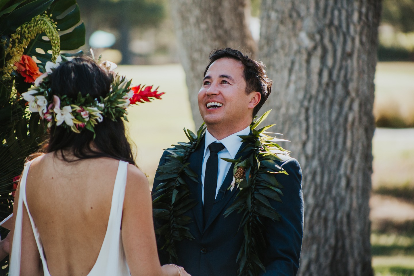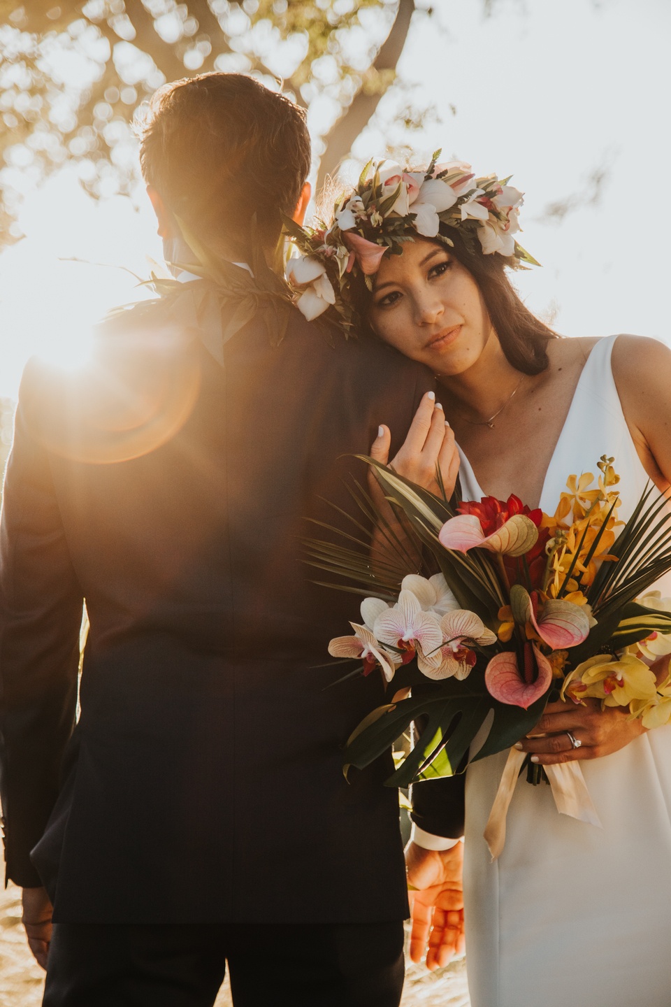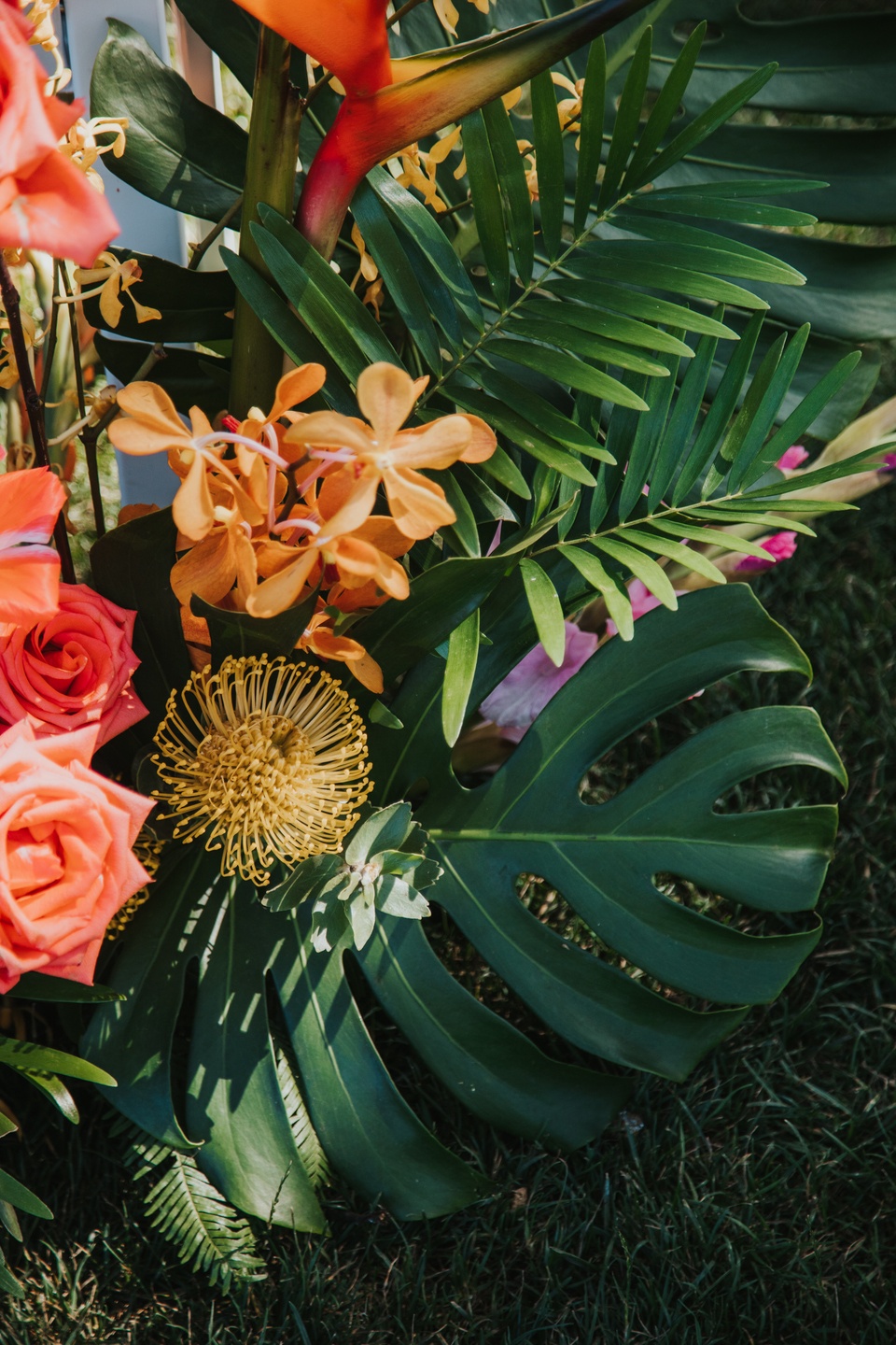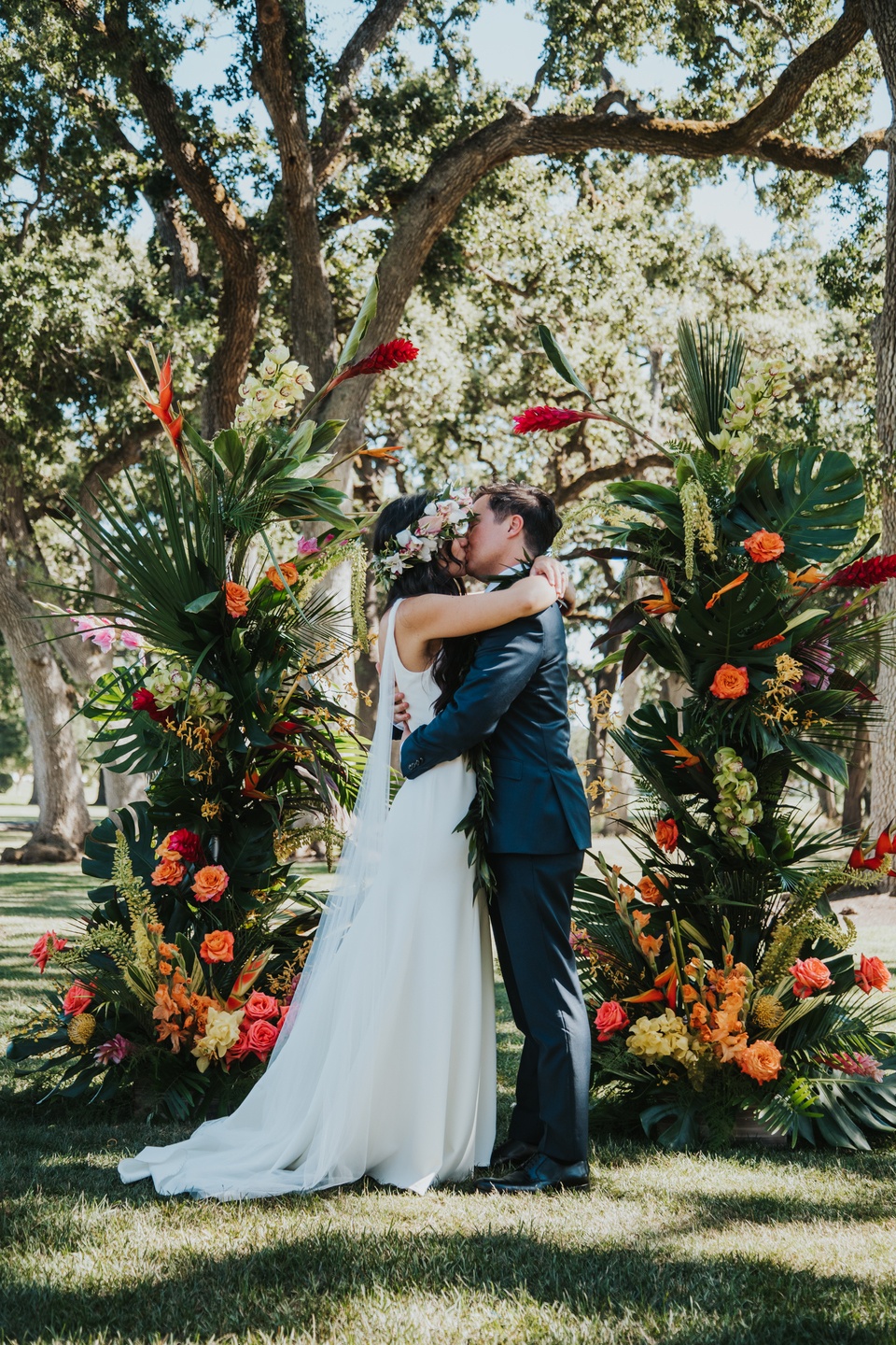 The ceremony unfolded beneath towering trees, framed by a dramatic floral arch by Jacqueline Ching Design. Oversized monstera leaves, red ginger, yellow orchids, coral roses, and layered tropical foliage created a rich, jungle-like backdrop as the couple exchanged vows. Anna wore a clean, elegant gown paired with a striking orchid floral crown, while James complemented her look in a navy suit finished with a traditional Hawaiian lei. Their bouquet echoed the scene with bird of paradise, orchids, anthurium, and palm leaves in vibrant sunset hues.