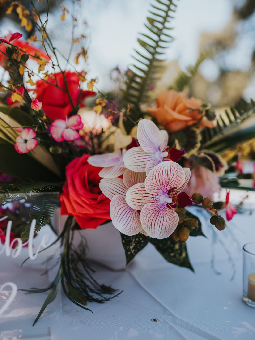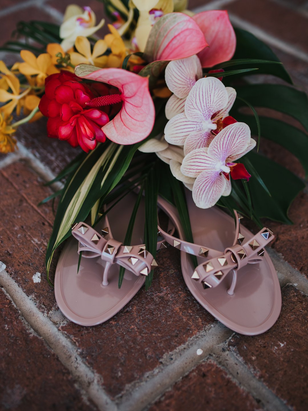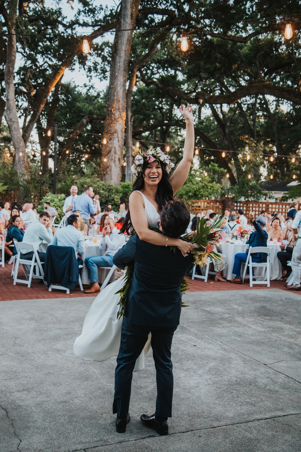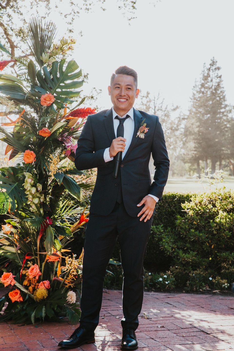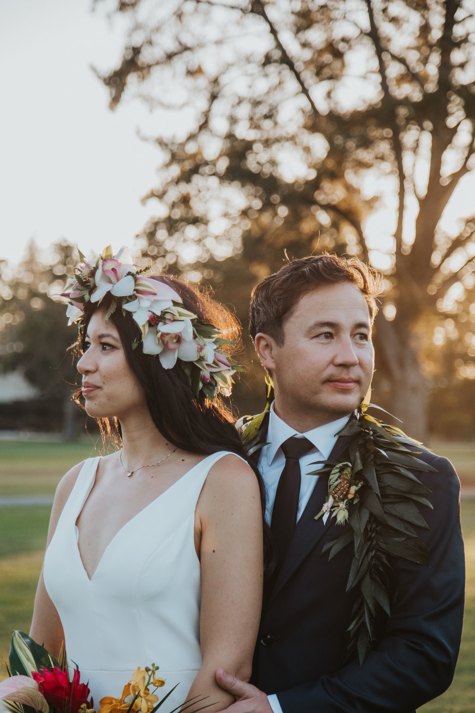 The ceremony unfolded beneath towering trees, framed by a dramatic floral arch by Jacqueline Ching Design. Oversized monstera leaves, red ginger, yellow orchids, coral roses, and layered tropical foliage created a rich, jungle-like backdrop as the couple exchanged vows. Anna wore a clean, elegant gown paired with a striking orchid floral crown, while James complemented her look in a navy suit finished with a traditional Hawaiian lei. Their bouquet echoed the scene with bird of paradise, orchids, anthurium, and palm leaves in vibrant sunset hues.