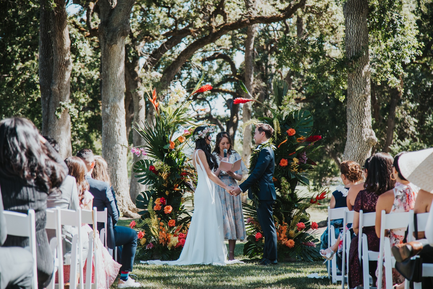 Anna and James’ June wedding at Silverado Resort & Spa brought tropical romance to Napa Valley, blending bold color, lush florals, and joyful energy beneath the estate’s oak-filled grounds. Planned by Under The Vine Events, the celebration transformed classic wine country into a Hawaiian-inspired escape.