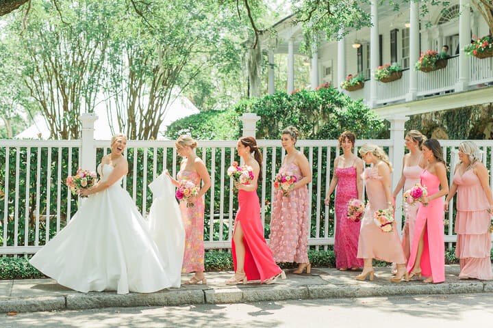 The ceremony space was framed by an exquisite floral arch created by Festoon Charleston, featuring pink and coral peonies, garden roses, ranunculus, and lush greenery. Tori’s bouquet perfectly mirrored this radiant palette, while her bridesmaids dazzled in blush and coral dresses, adding to the visual harmony. The couple exchanged vows as laughter and happy tears filled the air, with live music provided by Kiral Artists adding an elegant touch to the moment.