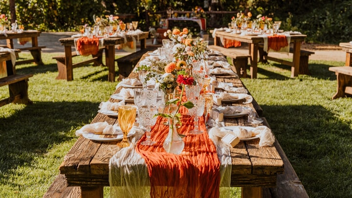 The reception continued in the Garden Grove, where tables dressed in crisp white linens and delicate florals reflected the day’s understated elegance. String lights crisscrossed overhead, casting a warm glow as the sun dipped behind the mountains. Thoughtfully prepared cuisine by the venue’s in-house culinary team highlighted local, seasonal ingredients, elevating the dining experience with beautifully plated courses.