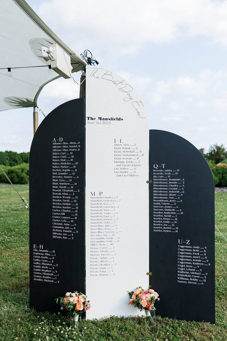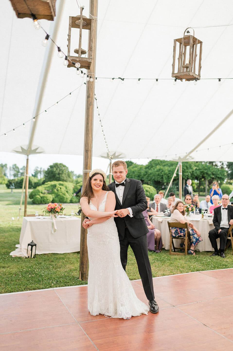 As golden hour bathed the grounds in soft light, Brittany Lowe Photography captured the couple among wheat fields and tree-lined paths, preserving each tender moment with refined artistry. The reception continued beneath a white tent illuminated by delicate string lights and rustic wooden lanterns. Tables draped in crisp linens were adorned with vibrant floral centerpieces, creating an atmosphere both warm and celebratory. With rentals by Party Perfect and music curated by M2M Weddings, the evening carried a joyful rhythm that perfectly reflected the couple’s spirit.