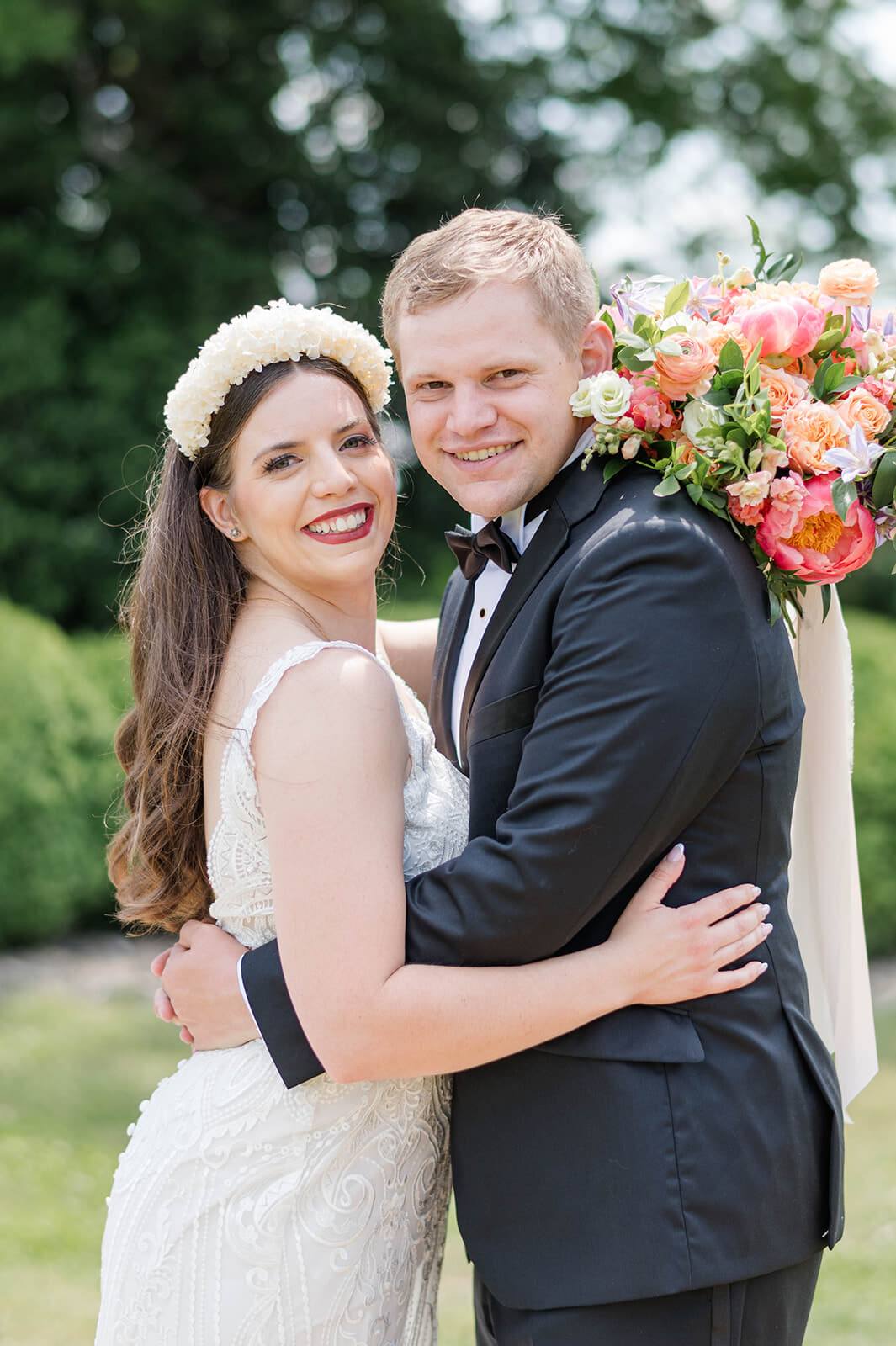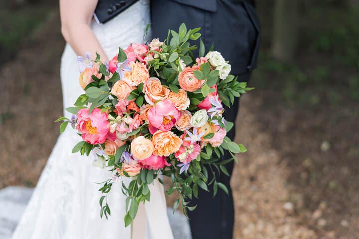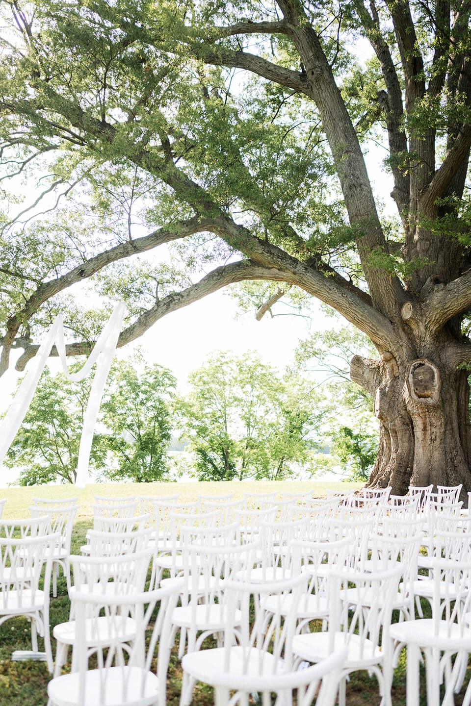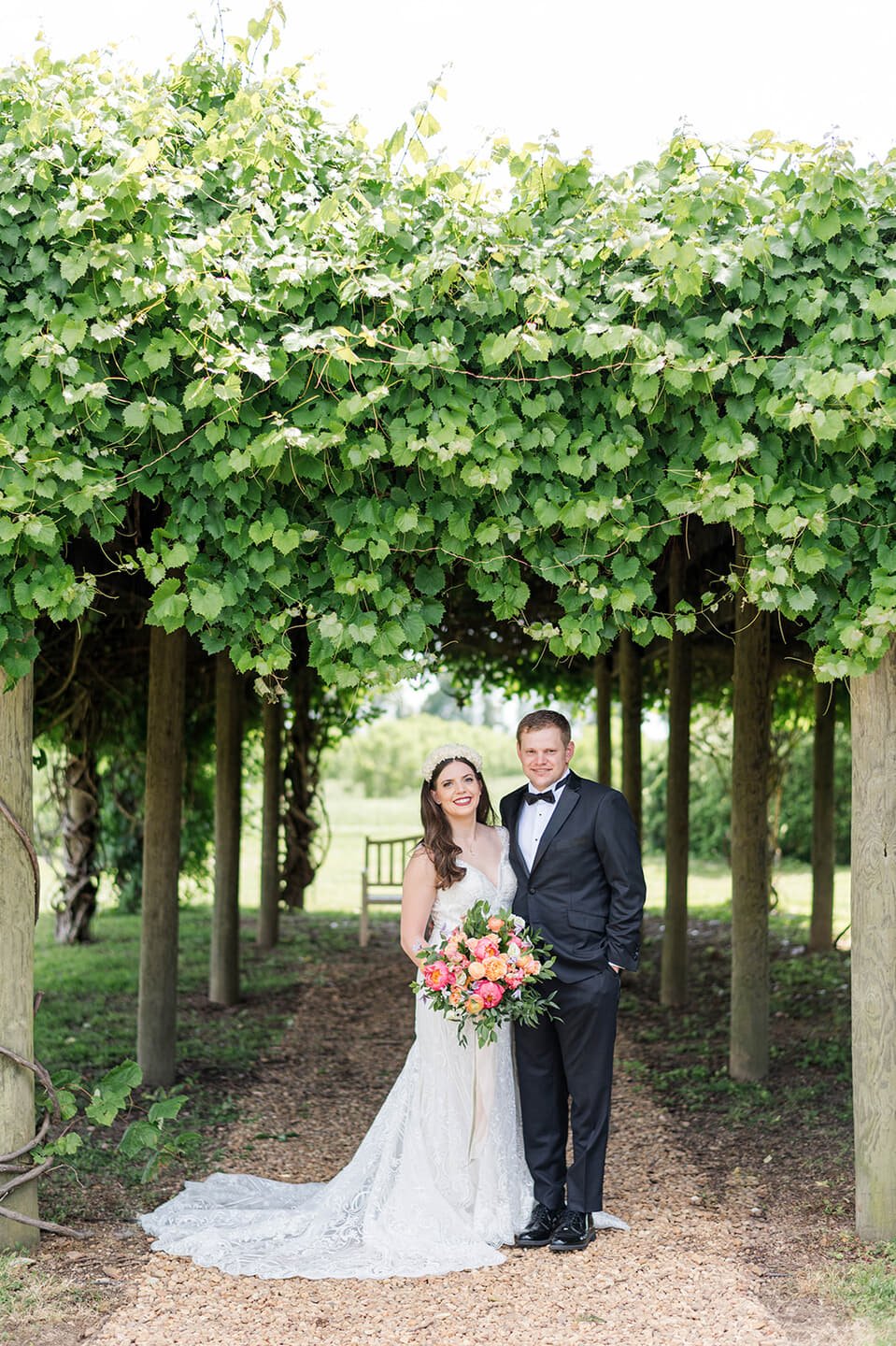 The day featured a joyful palette of coral, peach, and green, brought to life through floral artistry by Strawberry Fields. The bride’s bouquet overflowed with peonies, garden roses, ranunculus, and greenery, while the ceremony unfolded beneath a magnificent oak tree surrounded by white chairs—a scene of simple, natural elegance.