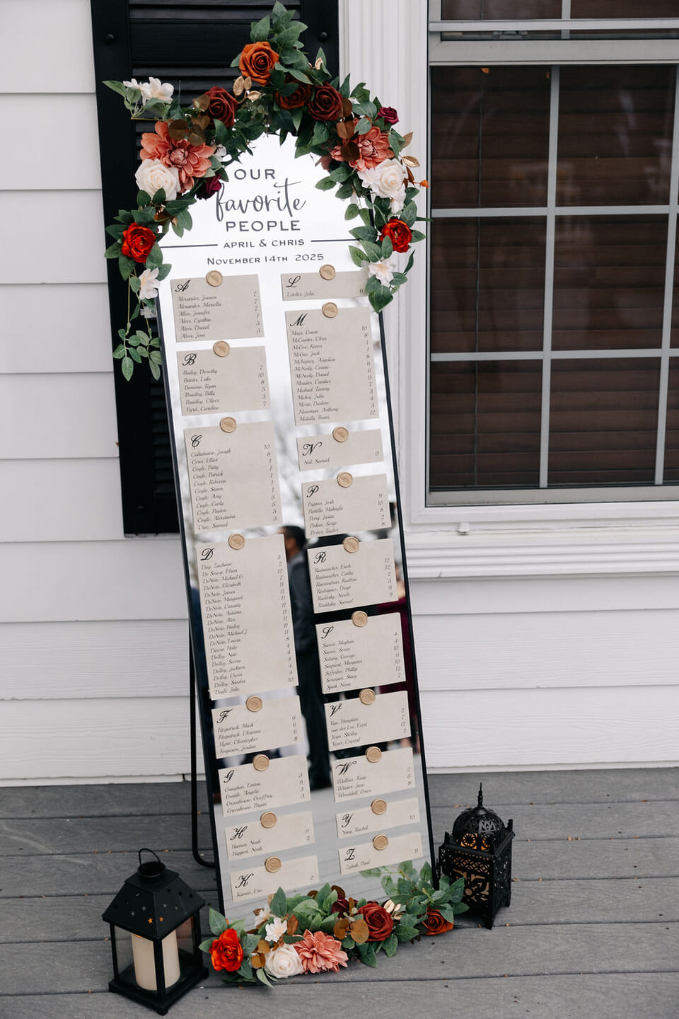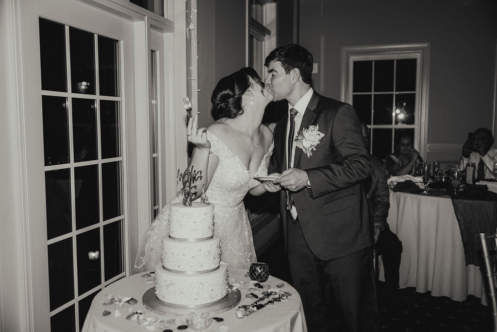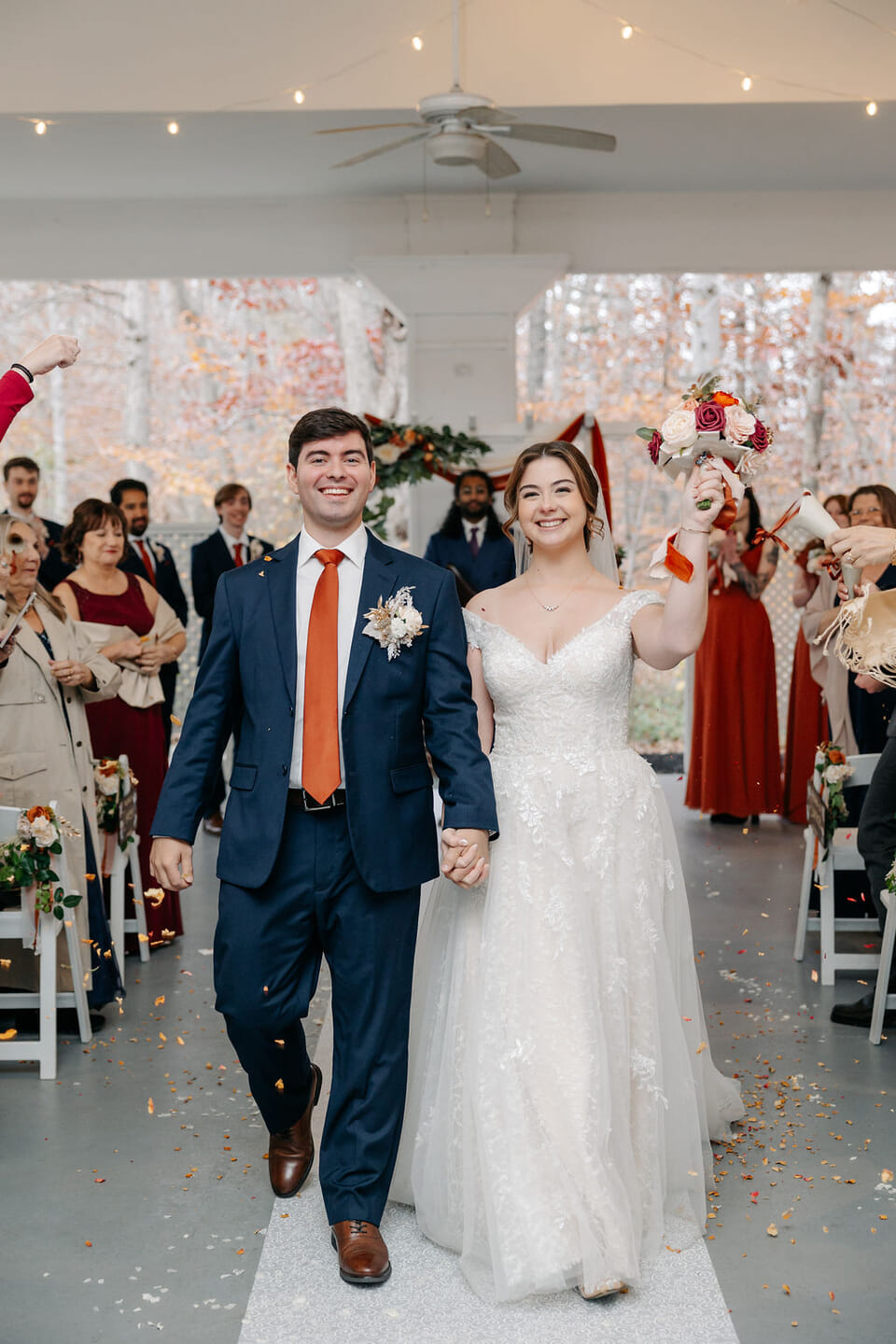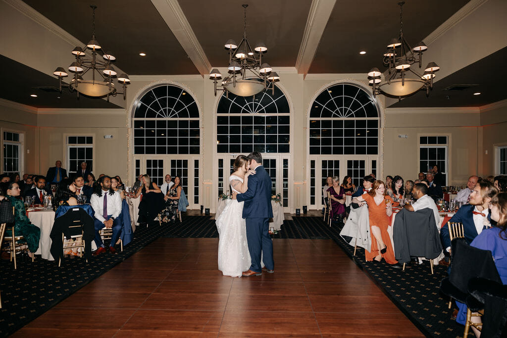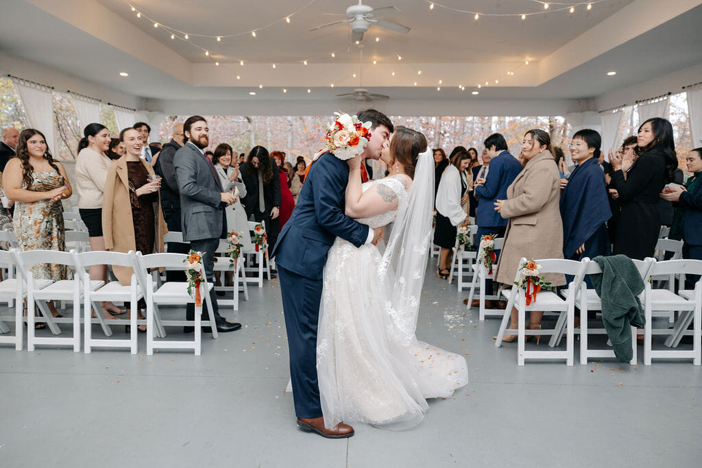 April carried a bouquet of crimson roses, burnt orange dahlias, blush peonies, and gilded leaves, echoing the richness of the season, with beauty by Sandra M. Makeup Artistry completing her radiant look. As the couple shared their first kiss, the room filled with an immediate sense of excitement and heartfelt joy.