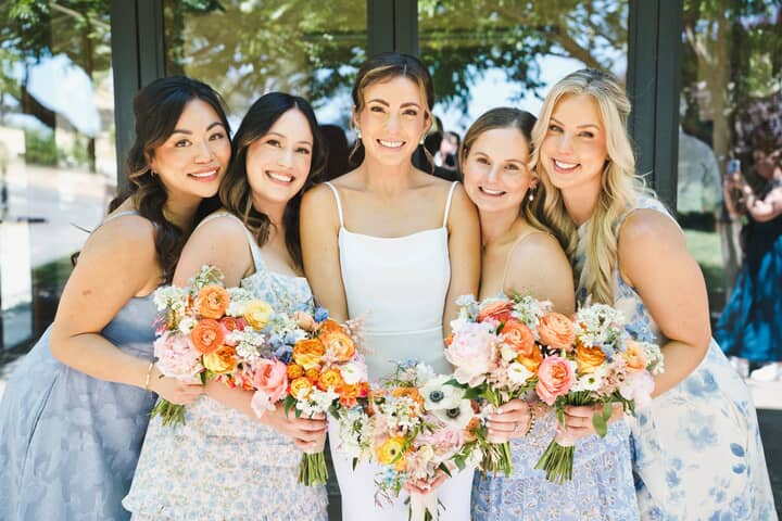 Lauren and Mike celebrated their love with a late summer wedding at DeLoach Vineyards, where rolling vineyards and warm afternoon light set a romantic, relaxed tone for the day. The design embraced a soft palette of blue, white, and blush, reflected in the florals and styling throughout the celebration. Seasonal arrangements by Vanda Floral Design featured dahlias, roses, and delicate greenery, adding natural texture to the vineyard setting.