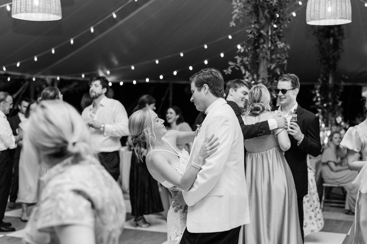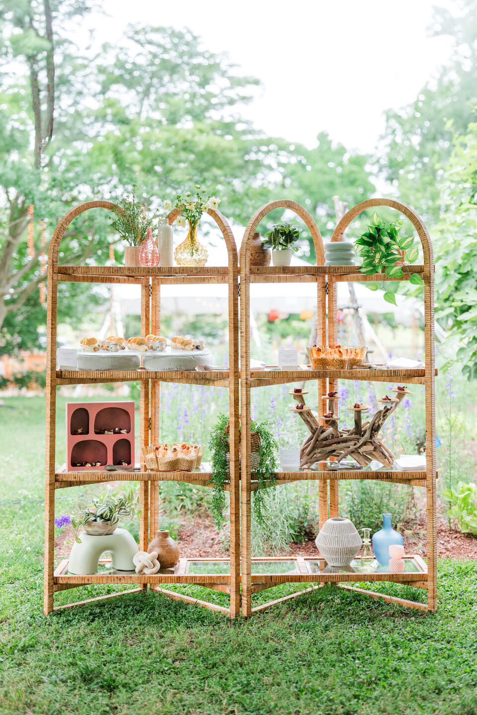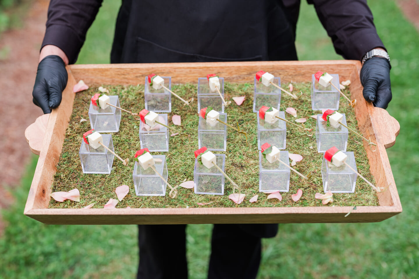 Beneath an elegant white tent, the reception glowed with woven rattan pendants casting warm light over long farmhouse tables and wooden chairs. A peach-and-white checkered dance floor added playful contrast to the garden setting. The evening’s culinary artistry was a collaboration between The Commonwealth Club and Heirloom DC, who curated interactive food stations featuring gourmet tacos, delicate dim sum, and colorful desserts—each plate a blend of creativity and flavor. Rentals from Rent E-Quip, Paisley & Jade, Stradley Davidson Linen Collective, and Nuage Designs completed the look with layered textures and refined detail.